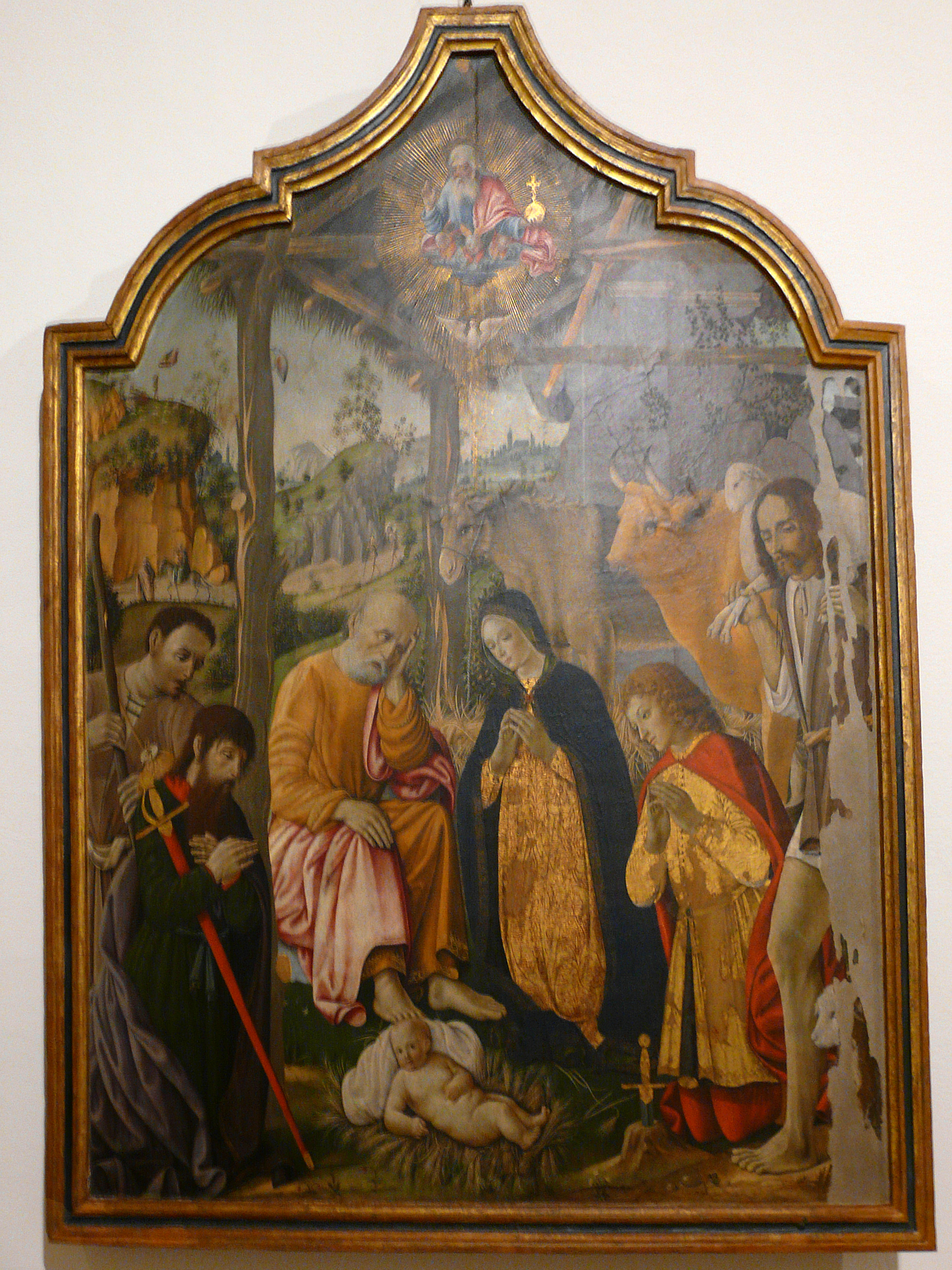 nella predella storie della Passione: Salita al Calvario, Flagellazione, Compianto sul Cristo morto, Deposizione nel Sepolcro, Resurrezione