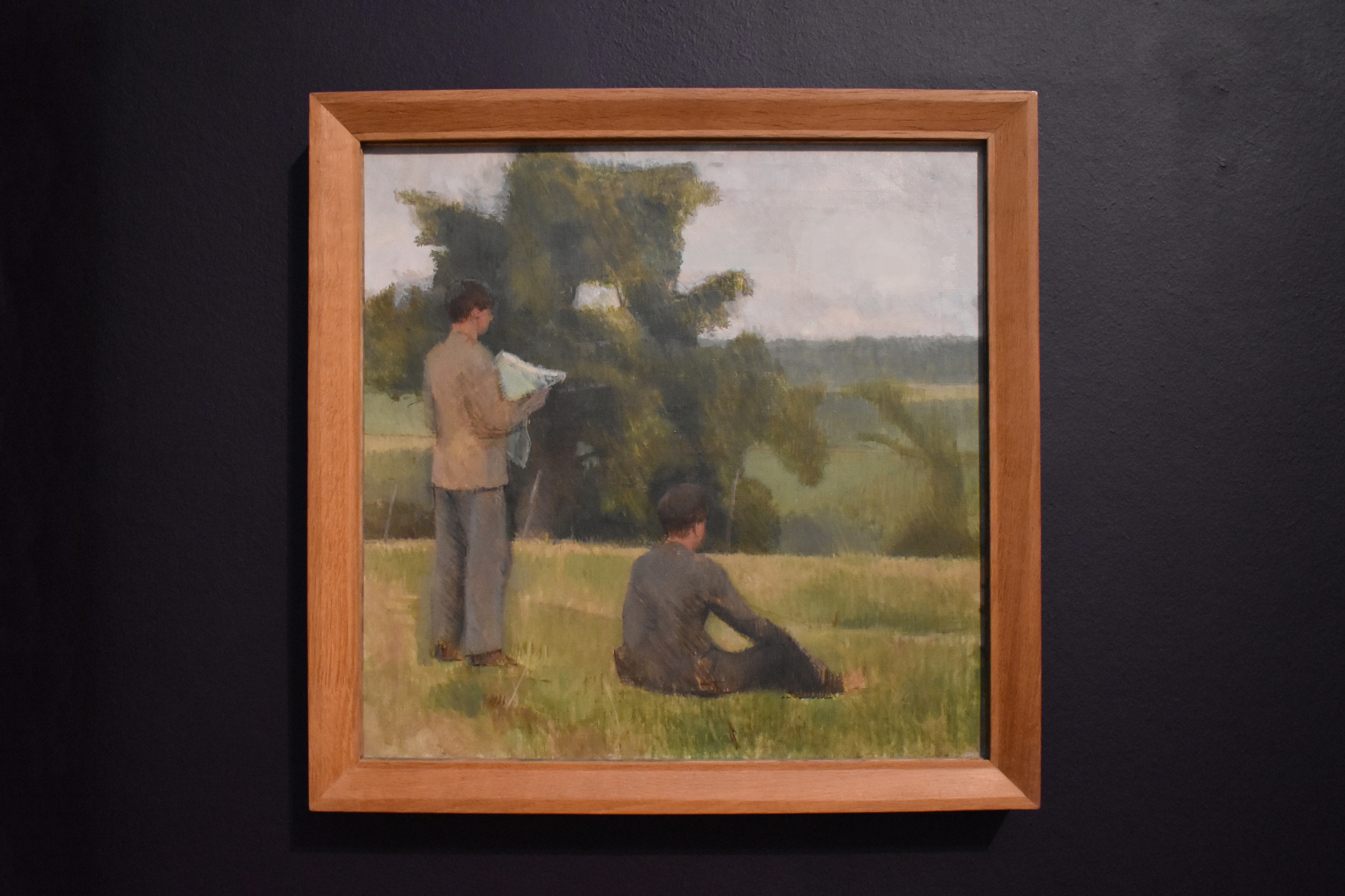 На этой сцене, написанной прямо с натуры недалеко от Байхема в Саффолке, Уильям Колдстрим показывает своего коллегу-художника Грэма Белла (Graham Bell), стоящего с картой в руках. Рядом с ним на земле сидит его друг Игорь Анреп (Igor Anrep). Они смотрят на пейзаж со спины, не подозревая о присутствии художника. Возможно, это вдохновлено картинами Эдгара Дега, изображающими обнаженных женщин в интерьерах, которые Колдстрим высоко оценил за их "беспристрастное наблюдение". Использование темы карт для размышлений о пейзажах продолжило интерес Колдстрима к объективному наблюдению за своими объектами.