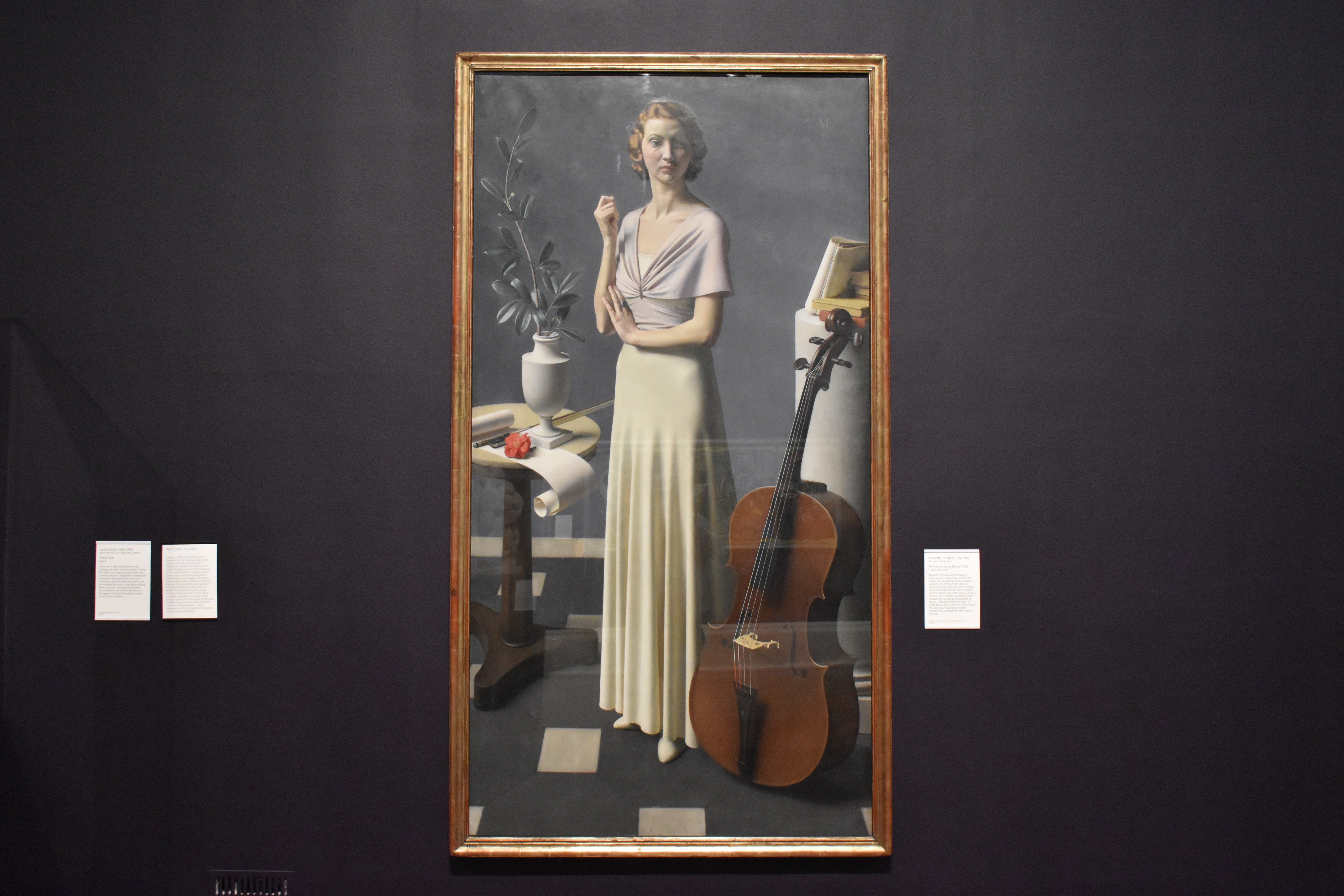 Мередит Фрэмптон написал Маргарет Остин-Джонс в высоком вертикальном формате. Это перекликается с женскими портретами в полный рост, написанными в XVII и XVIII веках. Однако точность, с которой Фрэмптон пишет, в сочетании с ощущением крайней неподвижности придают этой работе жутковатый, современный оттенок. По словам Фрэмптона, он создал эту картину, "чтобы отметить собрание предметов... прекрасных самих по себе". Он отметил, что, поскольку Остин-Джонс был очень музыкален, виолончель стала "подходящим символом". Фрэмптон также разработал дизайн белой вазы на столе.