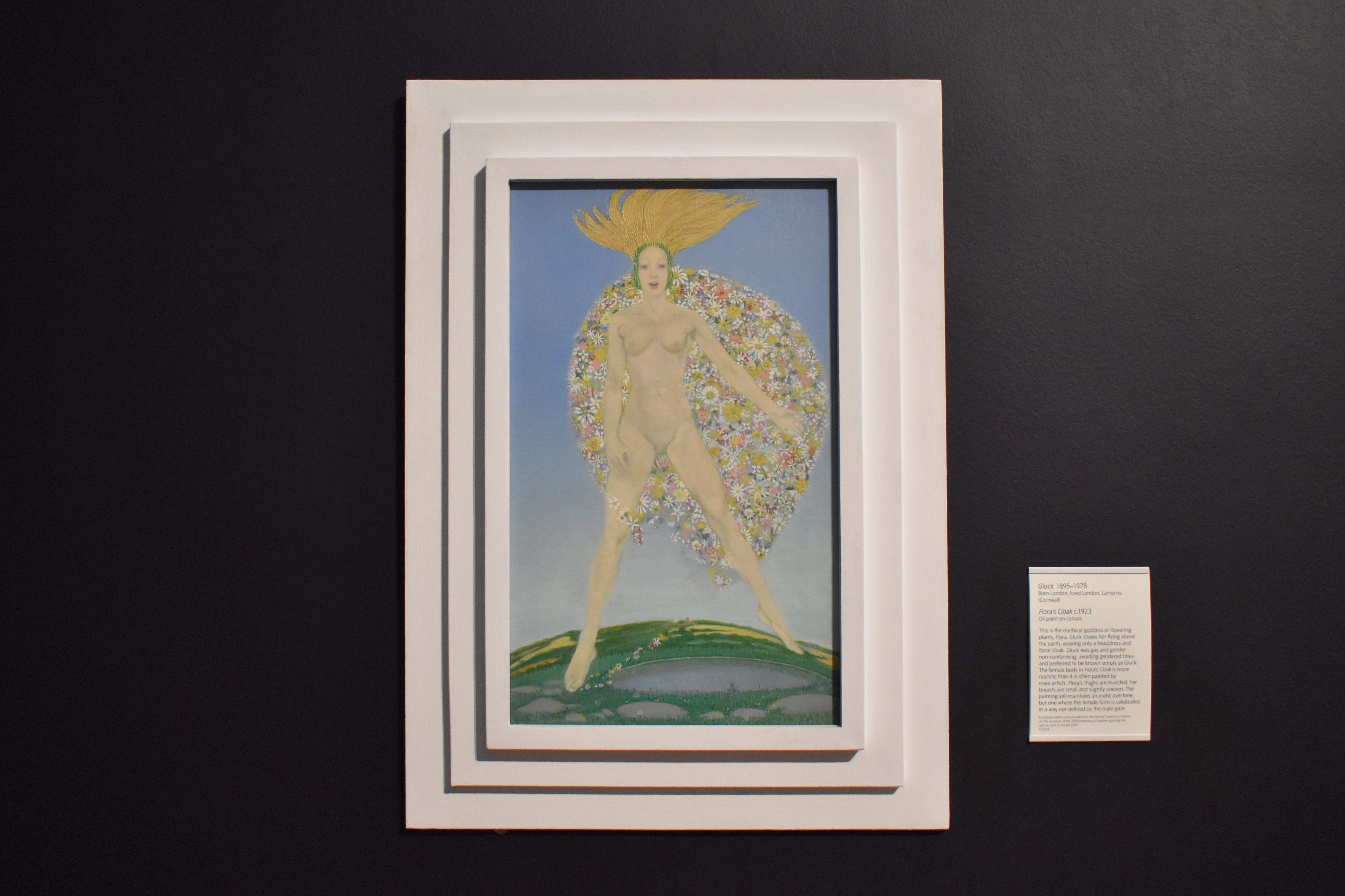 Картина "Плащ Флоры" (1923) написана маслом в формате портрета, в центре которого изображена обнаженная молодая женщина в полный рост на бледно-голубом фоне. Ноги и ступни фигуры направлены к нижним углам холста, так что кажется, что она слегка парит в пространстве. Ее правая рука свисает вниз и лежит перед правым бедром, а левая вытянута от основания под углом сорок пять градусов, ладонь раскрыта к зрителю. Геометрическое расположение ее конечностей напоминает форму "Витрувианского человека" Леонардо. 1490 (Галерея Академии, Венеция). Её обнаженная фигура юна, но подтянута, с бледно-розовой кожей, на ней головной убор, напоминающий солому или желтое пламя, прикрепленное к зеленой ленте, обрамляющей лицо. Её лицо также юное, с голубыми глазами и открытым выражением приподнятых век и слегка приоткрытого рта. За ее спиной и в вытянутой левой руке развевается плащ из мелких весенних цветов, в том числе маргариток, окрашенных в белый и светло-зеленый цвета, а также других цветов с более темными зелеными стеблями, лепестками светло-розового цвета, изредка – темно-красного, голубого и фиолетового. Как и фигура, эти цветы словно парят или медленно движутся в воздухе; вместе они образуют округлую форму с определенным краем, прикрывающую ее спину, а также один след, который свободно кружит в виде узкой полосы белых цветов вокруг ее правого бедра. Светло-голубой грунт слегка бледнеет к ногам фигуры и к центру композиции, создавая впечатление части воздушного безоблачного неба в яркий день. У основания фигуры находится верхний срез округлого земного шара или кургана, занимающего примерно нижнюю пятую часть картины и простирающегося до правого, левого и нижнего краев композиции. На переднем плане этой земли – несколько широких округлых галек разного размера перед круглым бассейном с водой, расположенным на поле с короткой зеленой травой. Позади виден более отдаленный пейзаж с желтыми и зелеными полями. Бассейн описан как отражение голубого неба и ободка из отраженной зеленой травы. Пальцы фигуры тянутся к этой земной поверхности, а ее правая нога, кажется, слегка касается травянистого берега. В этом месте дорожка из мелких цветов нарисована в небольшом круге возле ее ноги, а затем удаляется в сторону далекой земли. Это может говорить о том, что фигура в плаще из цветов своим присутствием или прикосновением опустила их на землю. Название картины, "Плащ Флоры", отсылает к римскому мифологическому персонажу Флоре, богине цветов и весны, символу плодородия, молодости и обновления жизни. Такое обращение Глюка к этой теме особенно напоминает фигуру того же персонажа в картине Сандро Боттичелли "Примавера" ок. 1470-80 (Галерея Уффици, Флоренция), которая смотрит на зрителя, рассыпая цветы по земле, одетая в развевающееся цветочное покрывало. Плащ Флоры также ранее называли "Примаверой". Образец Боттичелли должен был быть хорошо известен Глюку и доступен для репродукций, как и его обнаженная женщина в полный рост в "Рождении Венеры" (середина 1480-х гг.) (Галерея Уффици, Флоренция). Картины Глюка и Боттичелли представляют собой аллегорические визуальные образы, основанные на олицетворении Весны. В то время как более крупная композиция Боттичелли описывается как изображение продвижения весеннего сезона во времени, изображение Глюка застает богиню в длите