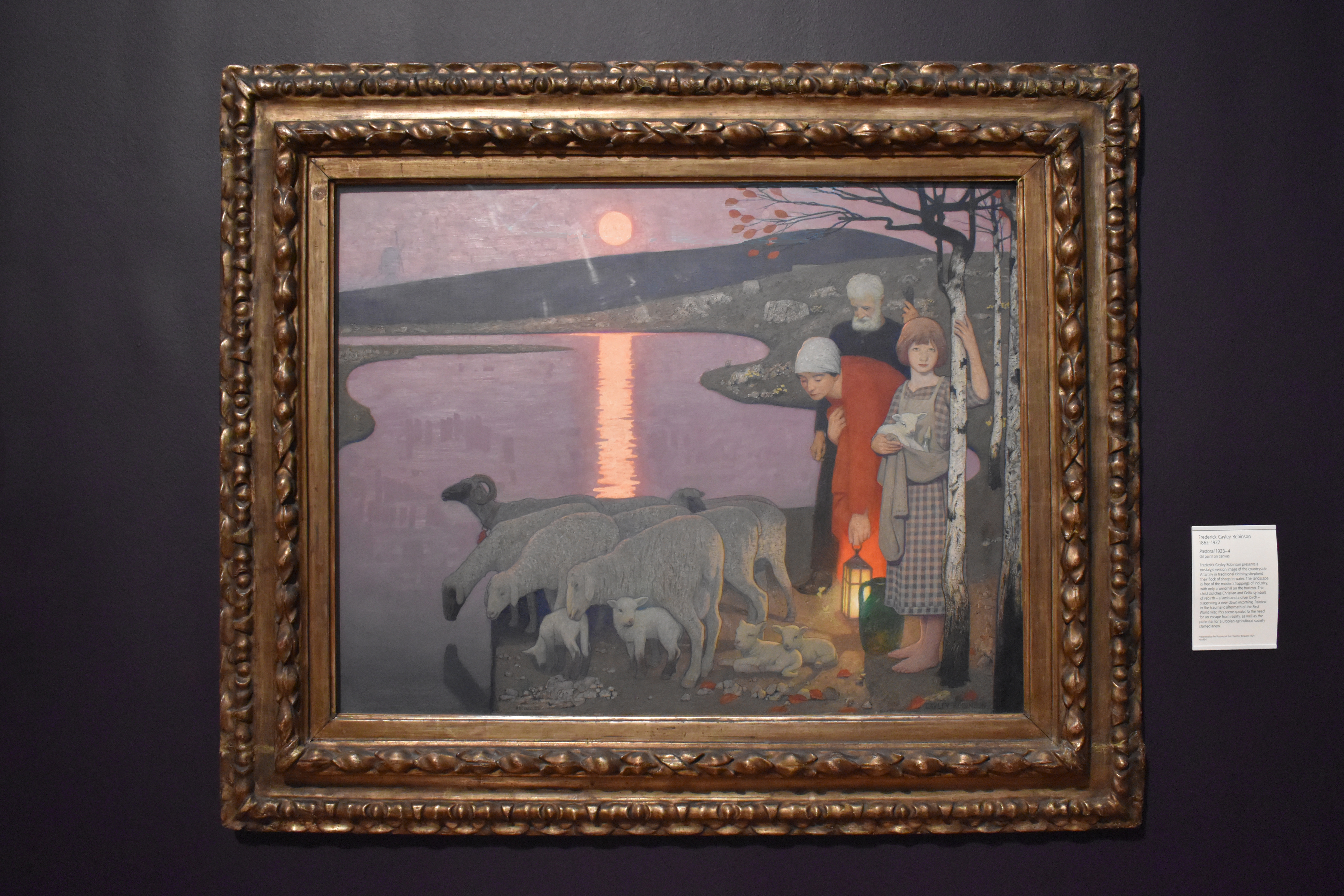 Фредерик Кейли Робинсон представляет ностальгическую версию изображения сельской местности. Семья в традиционной одежде пасет отару овец у воды. Пейзаж свободен от современных атрибутов промышленности, лишь на горизонте виднеется ветряная мельница. Ребенок сжимает в руках христианские и кельтские символы возрождения – ягненка и серебряную березу, что говорит о приближении нового рассвета. Написанная в травматичный период после Первой мировой войны, эта сцена говорит о потребности в побеге от реальности, а также о потенциале утопического сельскохозяйственного общества, начатого заново.