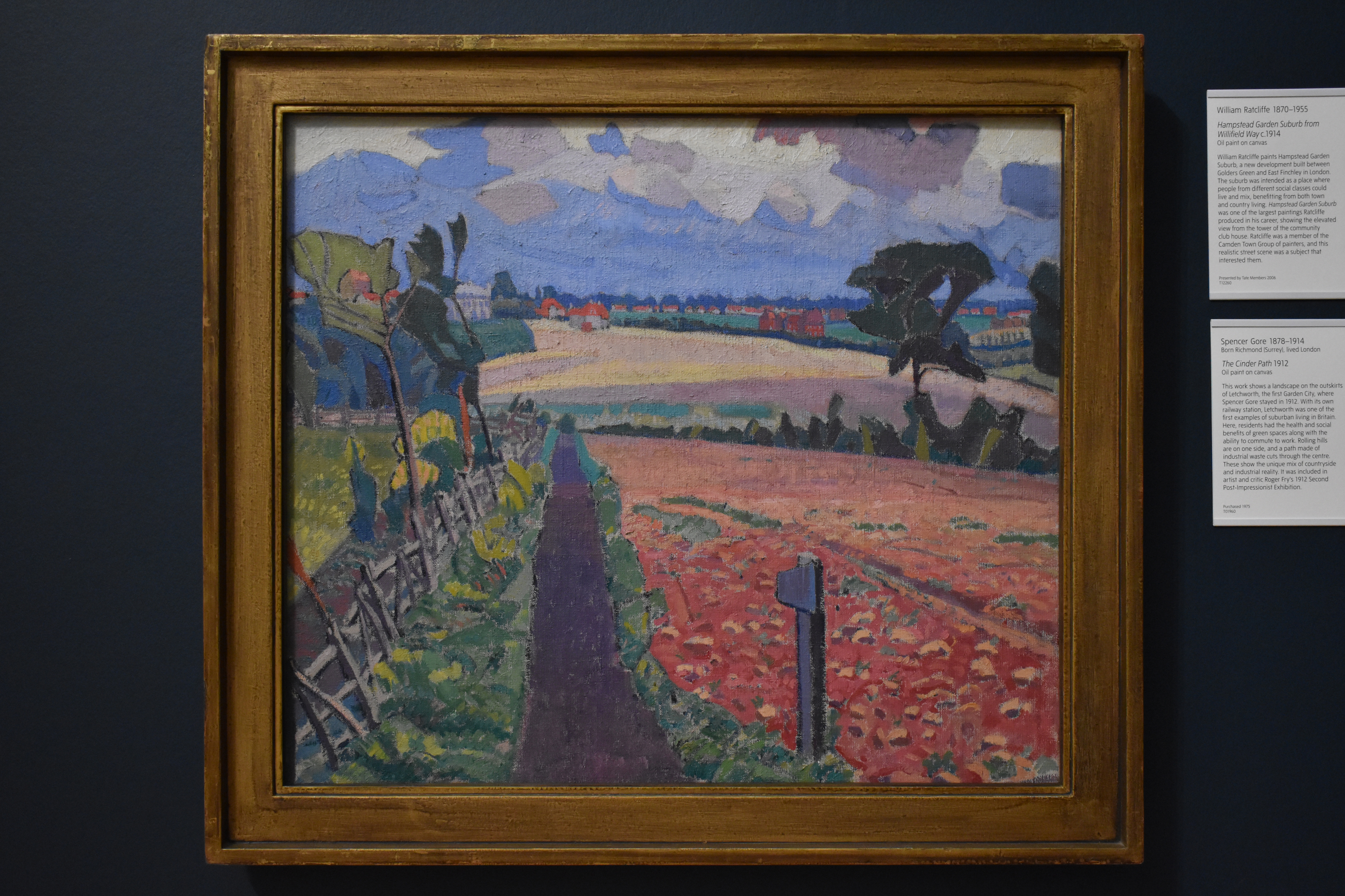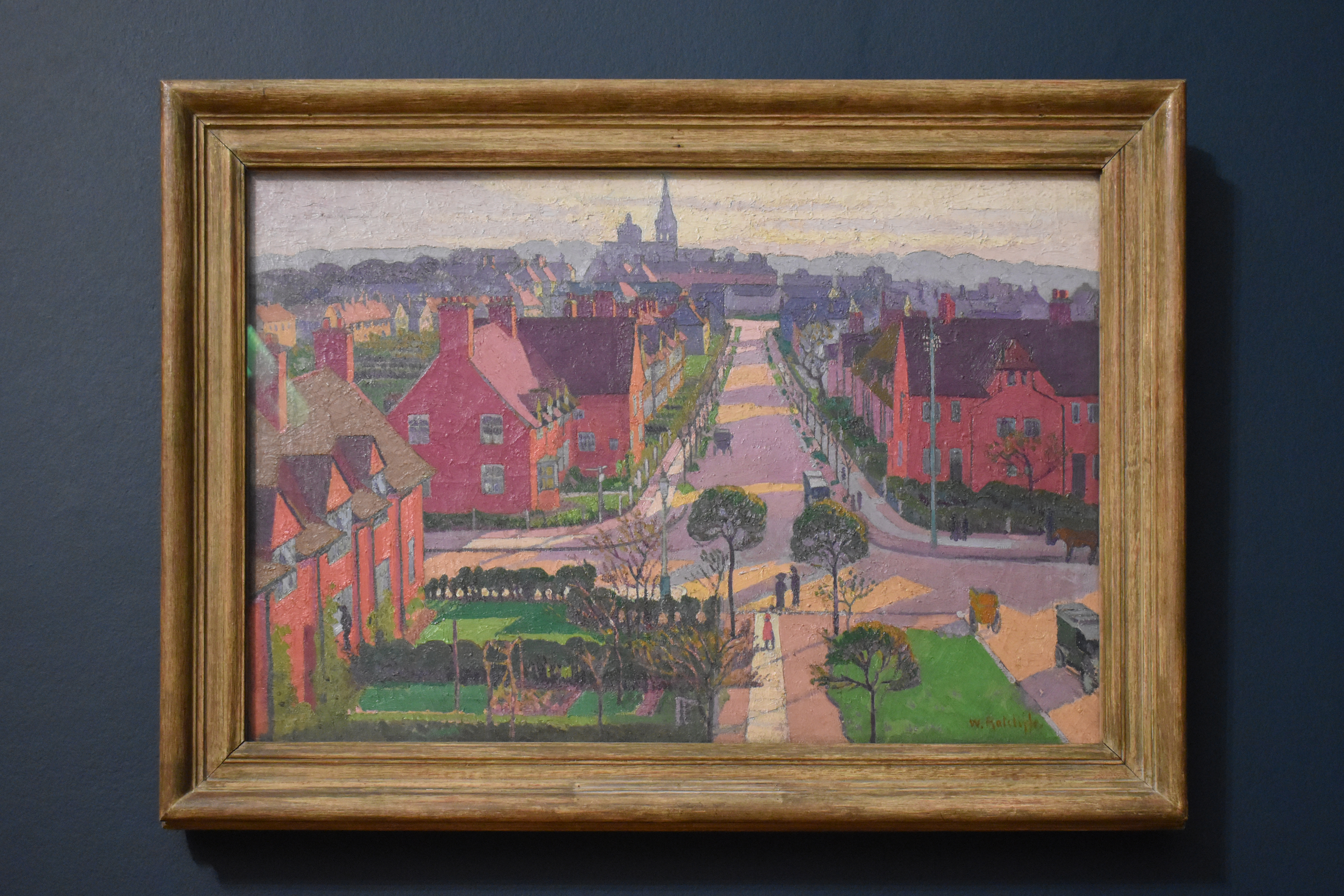 Уильям Рэтклифф рисует Хэмпстед Гарден Пригород, новый район, построенный между Golders Green и East Finchley в Лондоне. Пригород задумывался как место, где могли бы жить и смешиваться люди из разных социальных слоев, получая преимущества как городской, так и загородной жизни. Картина "Хэмпстед Гарден Пригород" – одна из самых больших в карьере Рэтклиффа, на ней изображен вид на возвышенность с башни дома общественного клуба. Рэтклифф был членом группы художников Кэмден-Тауна, и эта реалистичная уличная сцена была предметом их интереса.