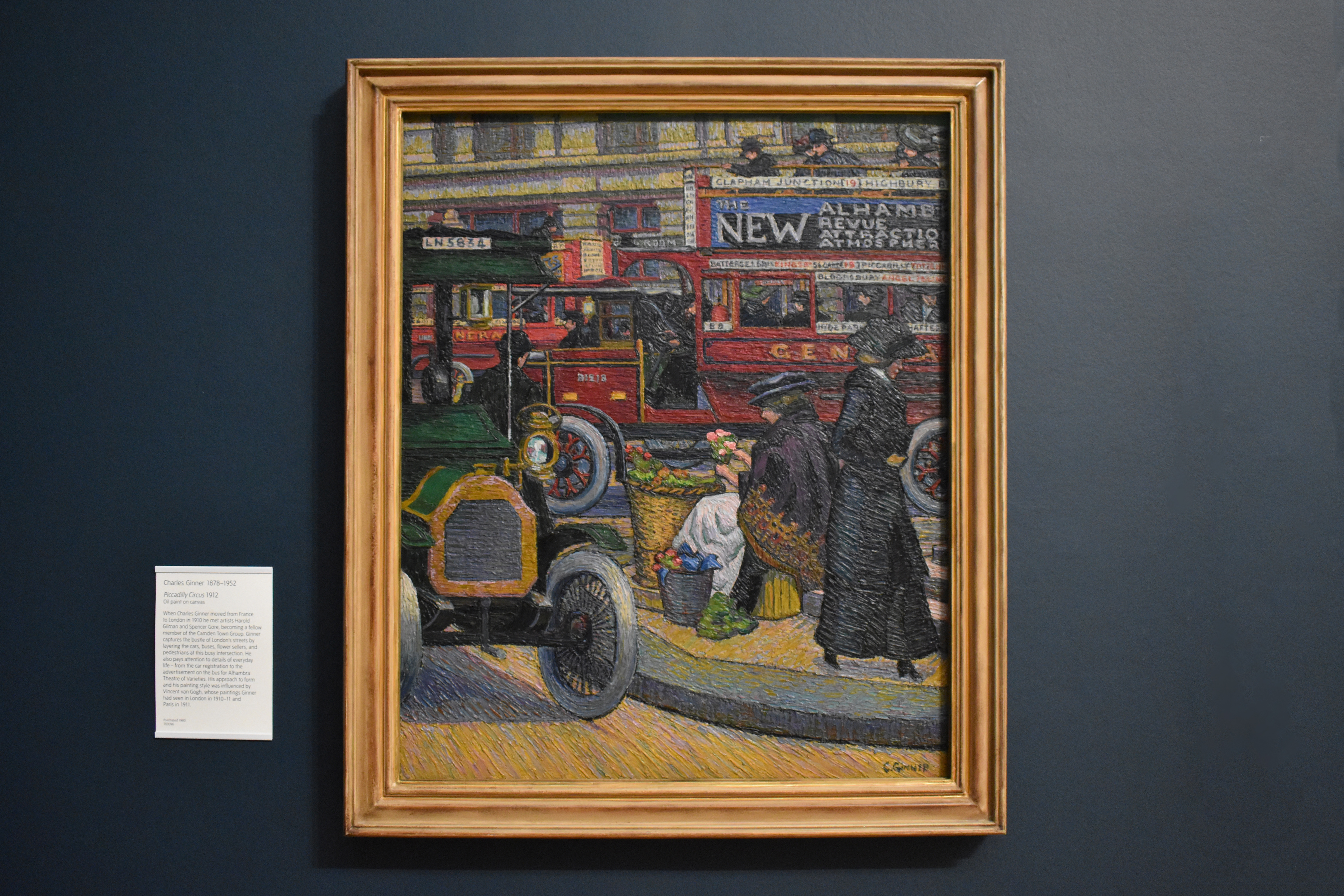 Когда Чарльз Гиннер переехал из Франции в Лондон в 1910 году, он познакомился с художниками Гарольдом Гилманом (Harold Gilman) и Спенсером Гором (Spencer Gore) и стал одним из членов группы "Camden Town Group". Гиннер передает суету лондонских улиц, накладывая друг на друга автомобили, автобусы, продавцов цветов и пешеходов на этом оживленном перекрестке. Он также обращает внимание на детали повседневной жизни – от регистрации автомобиля до рекламы на автобусе театра варьете "Альгамбра". На его подход к форме и стиль живописи повлиял Винсент Ван Гог, чьи картины Гиннер видел в Лондоне в 1910-11 годах и в Париже в 1911 году.