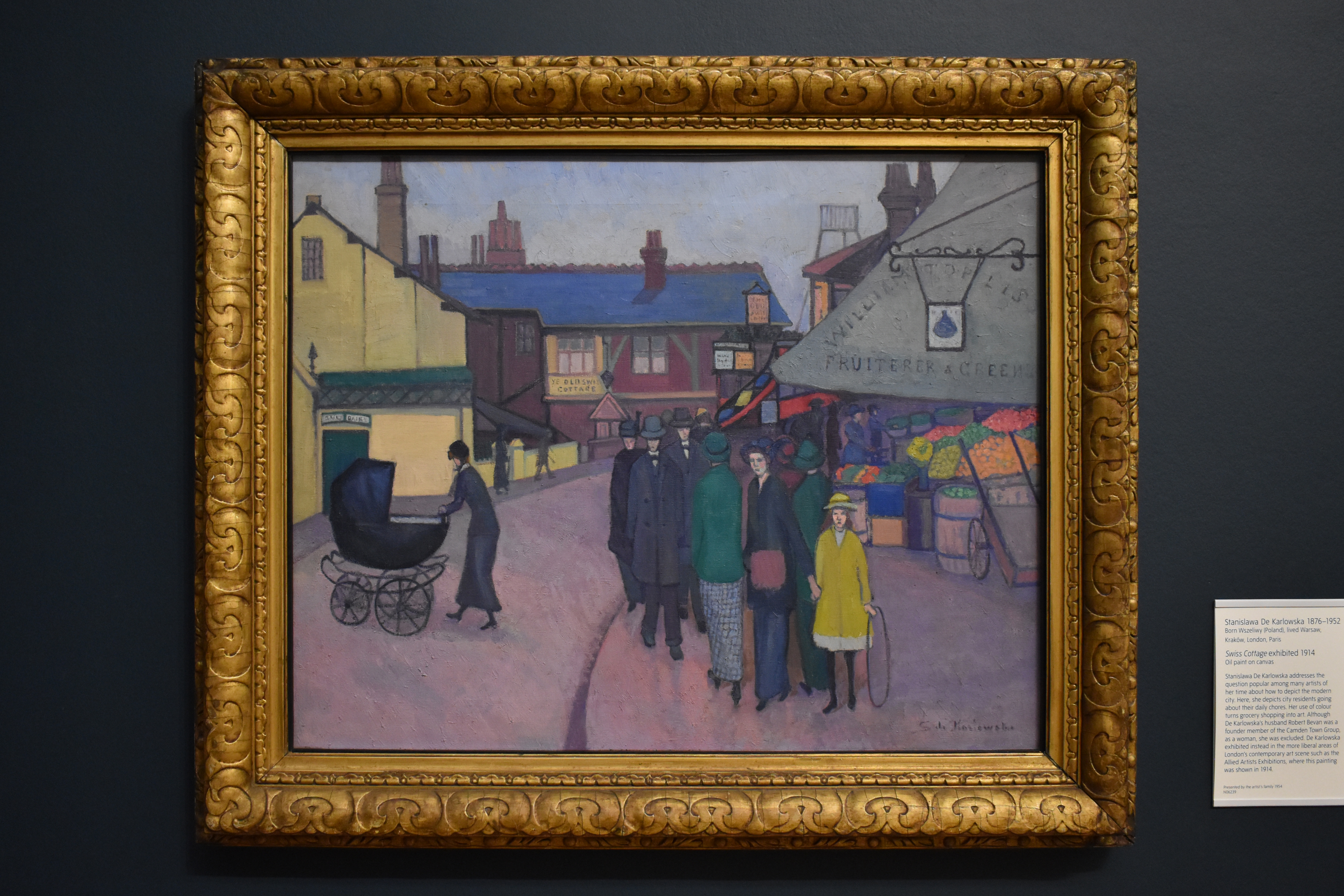 Станислава Де Карловска обращается к популярному среди многих художников ее времени вопросу о том, как изобразить современный город. Здесь она изображает горожан, занимающихся своими повседневными делами. Использование цвета превращает поход за продуктами в искусство. Хотя муж де Карловской Роберт Беван был одним из основателей "Camden Town Group", как женщина она была исключена. Вместо этого де Карловска выставлялась в более либеральных кругах современного лондонского искусства, таких как Allied Artists Exhibitions, где эта картина была показана в 1914 году.