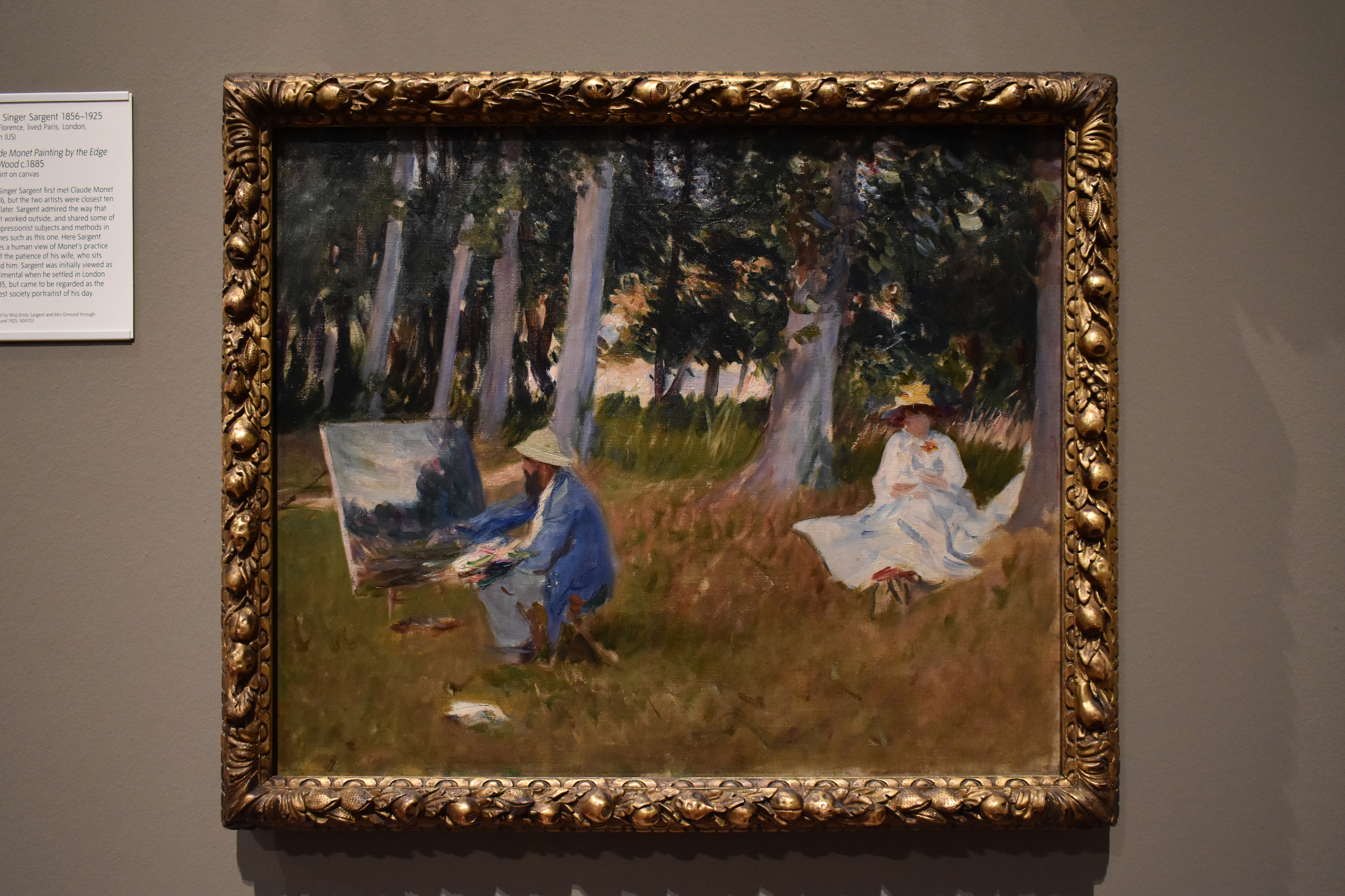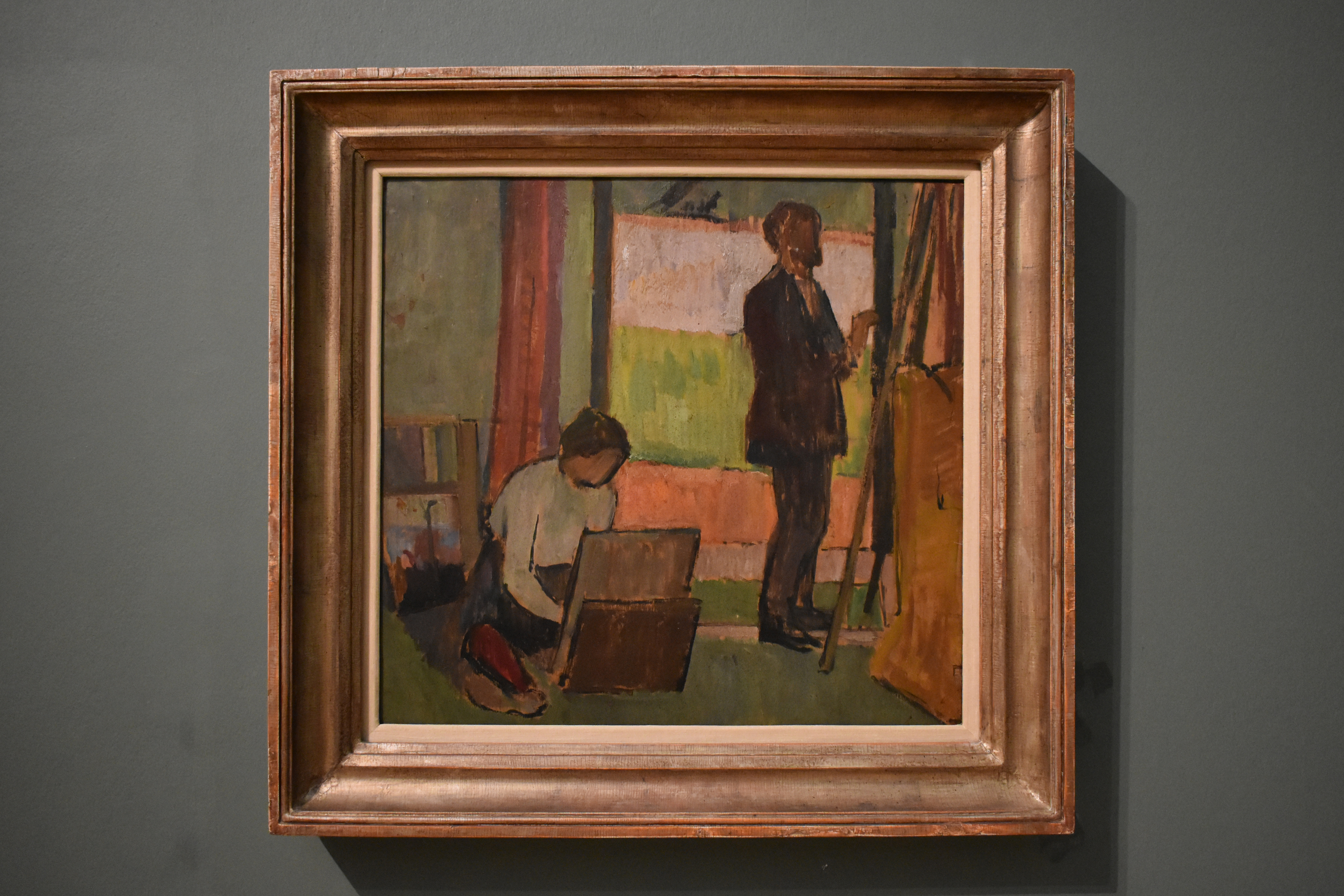 Здесь мы видим художников Джесси и Фредерика Этчеллс за работой, а за их спинами открываются двери в сад. Ванесса Белл нарисовала сестру и брата, когда они гостили у нее в Эшем-Хаусе в Сассексе. Она сосредоточилась на использовании цвета и формы, решив не изображать черты лица пары. Белл считала Джесси "милым персонажем... и очень молчаливым", но Фредерик показался ей трудным, и их визит был напряженным. С 1913 года и Джесси, и Фредерик работали в "Мастерских Омега" – проекте по дизайну интерьеров, который был создан художником Роджером Фраем и которым совместно руководила Белл.