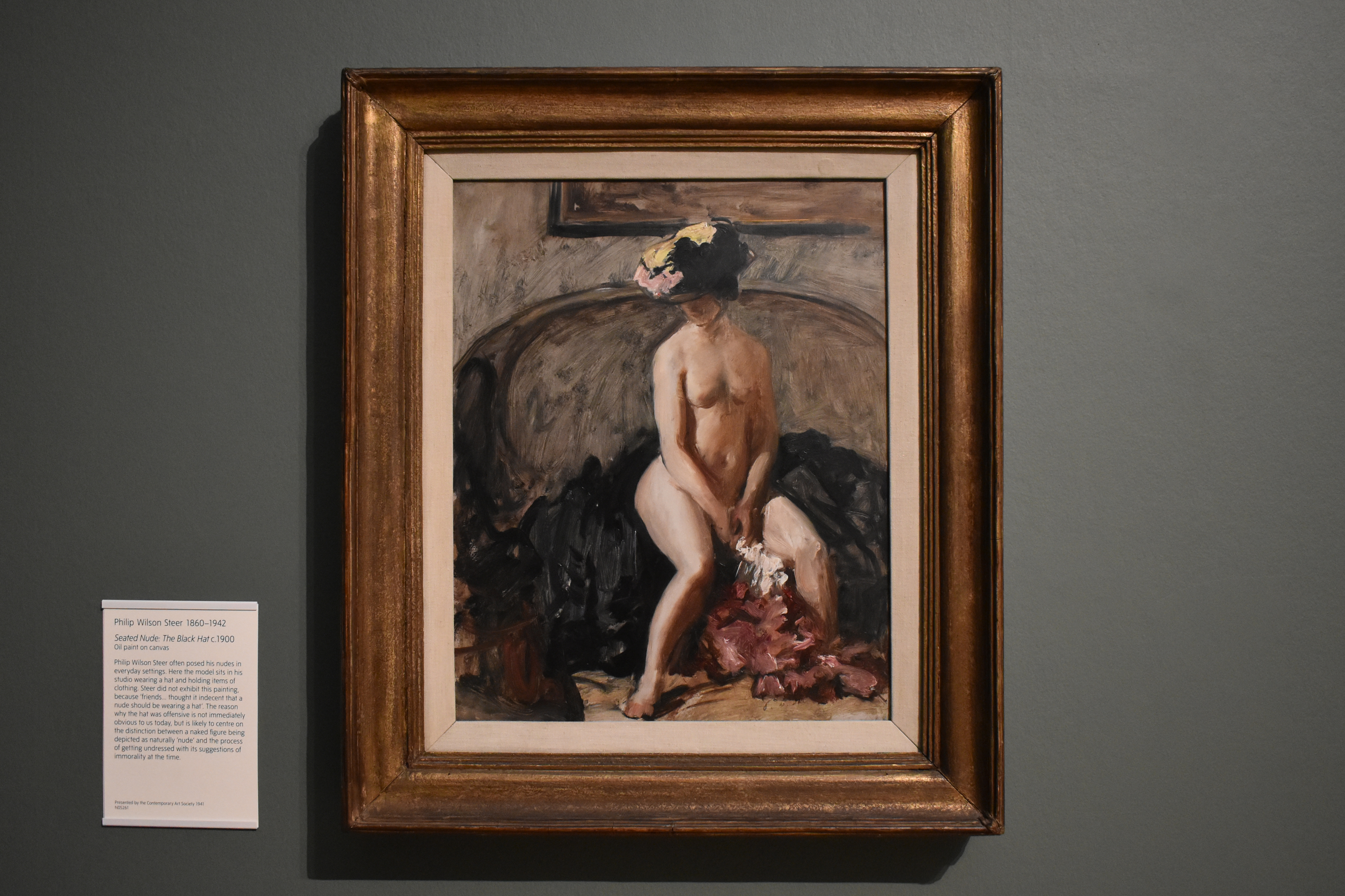 Филип Уилсон Стэр часто позировал обнаженным в повседневной обстановке. Здесь модель сидит в его студии в шляпе и держит в руках предметы одежды. Стир не стал выставлять эту картину, потому что "друзья... посчитали неприличным, что на обнаженной натуре должна быть шляпа". Причина, по которой шляпа была оскорбительной, не сразу очевидна для нас сегодня, но, скорее всего, в основе лежит различие между обнаженной фигурой, изображенной естественно "обнаженной", и процессом раздевания с его предположениями о безнравственности в то время.