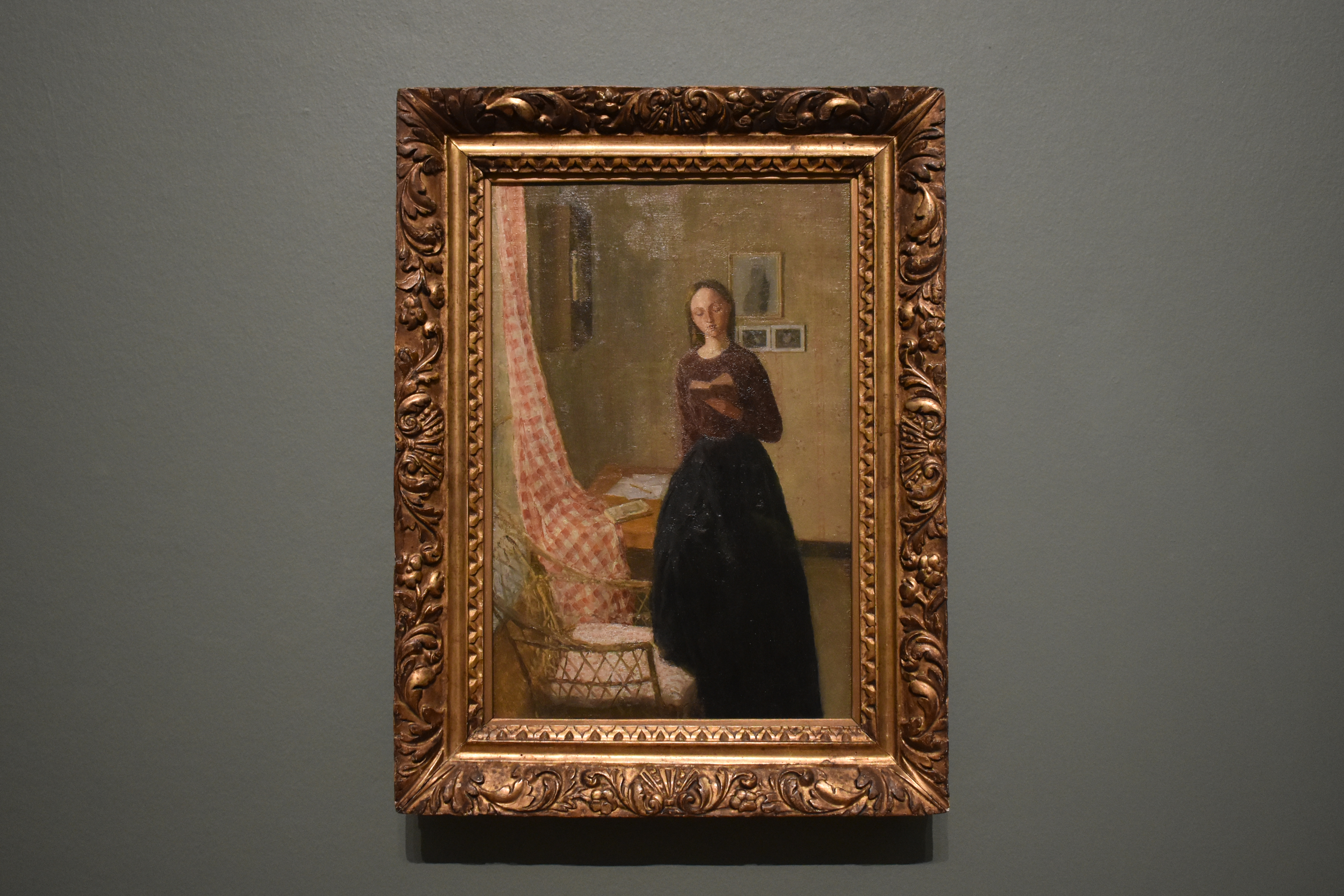 На этой картине изображен интерьер комнаты Гвен Джон в Париже. Рисунки кошек в рамке на стене позади фигуры также являются работами Джон. Наклоненная голова и форма занавеса были созданы под влиянием ксилографии немецкого художника Альбрехта Дорера, изображающей Благовещение Девы Марии. Позже Джон создала вторую версию этой картины, заменив идеализированную голову своим собственным портретом.
