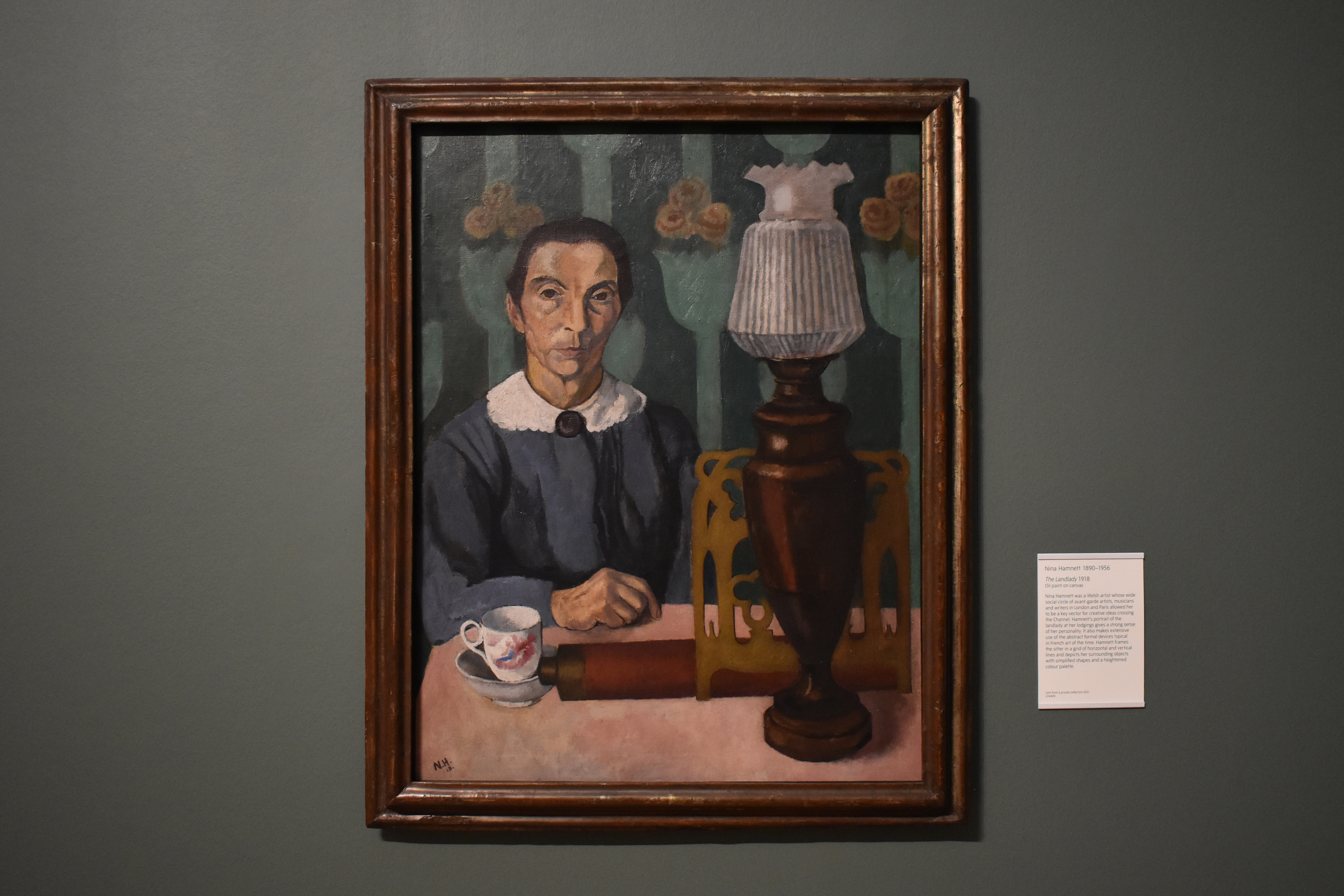 Нина Хэмнетт была уэльской художницей, чей широкий круг общения с авангардными художниками, музыкантами и писателями в Лондоне и Париже позволил ей стать ключевым вектором творческих идей, пересекающих Ла-Манш. Портрет хозяйки дома, написанный Хэмнетт, даёт сильное ощущение ее личности, а также широко использует абстрактные формальные приемы, характерные для французского искусства того времени. Хэмнетт обрамляет натурщицу в сетку горизонтальных и вертикальных изображений и изображает окружающие ее предметы с помощью упрощенных форм и усиленной цветовой палитры.
