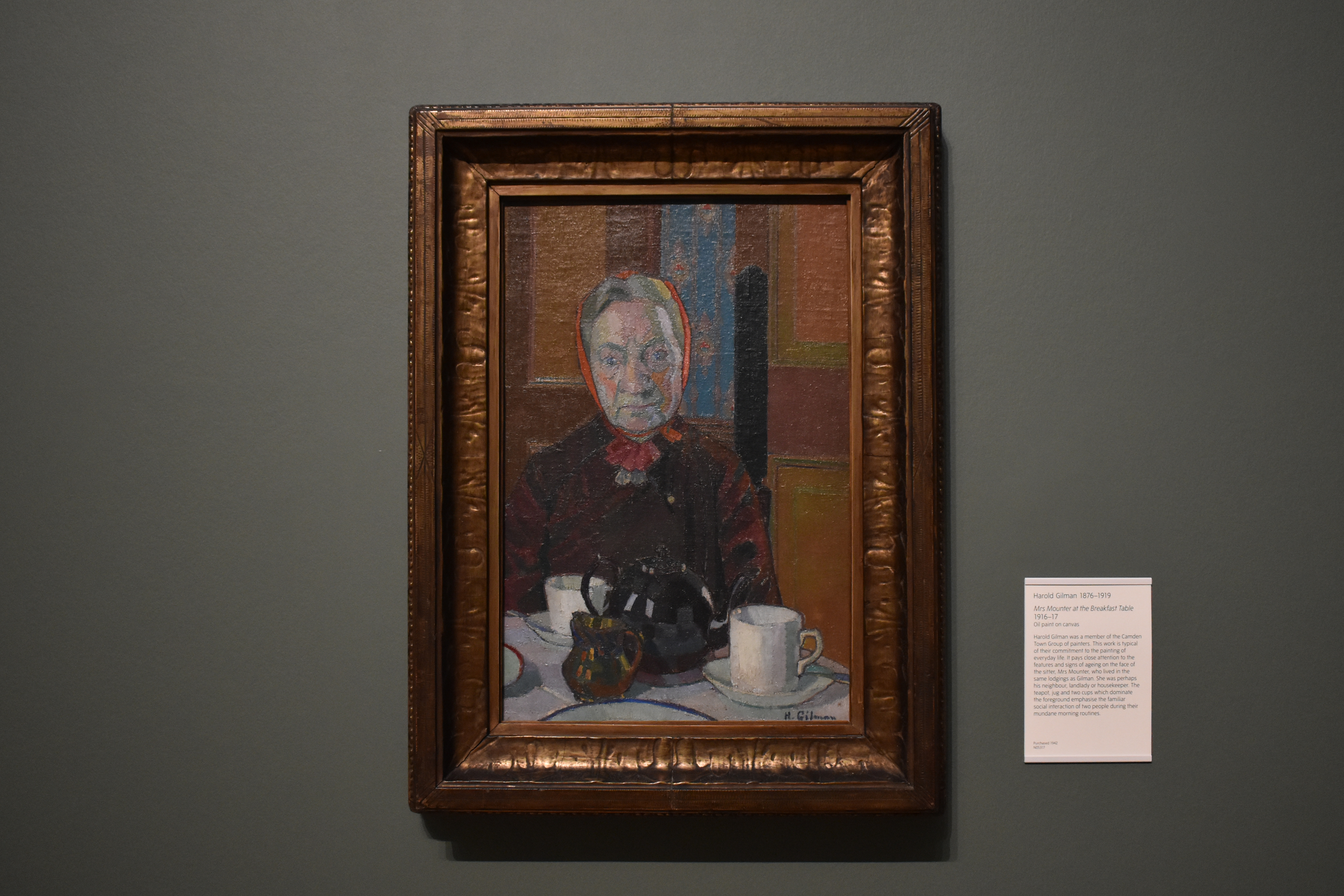 Гарольд Гилман входил в группу художников Камден Таун (Camden Town Group). Эта работа типична для их стремления к изображению повседневной жизни. В ней пристальное внимание уделено чертам и признакам старения на лице натурщицы. Миссис Маунтер, которая жила в том же доме, что и Гилман. Возможно, она была его соседкой, хозяйкой или экономкой. Чайник, фужер и две чашки, доминирующие на переднем плане, подчеркивают привычное социальное взаимодействие двух людей во время их обыденных утренних дел.