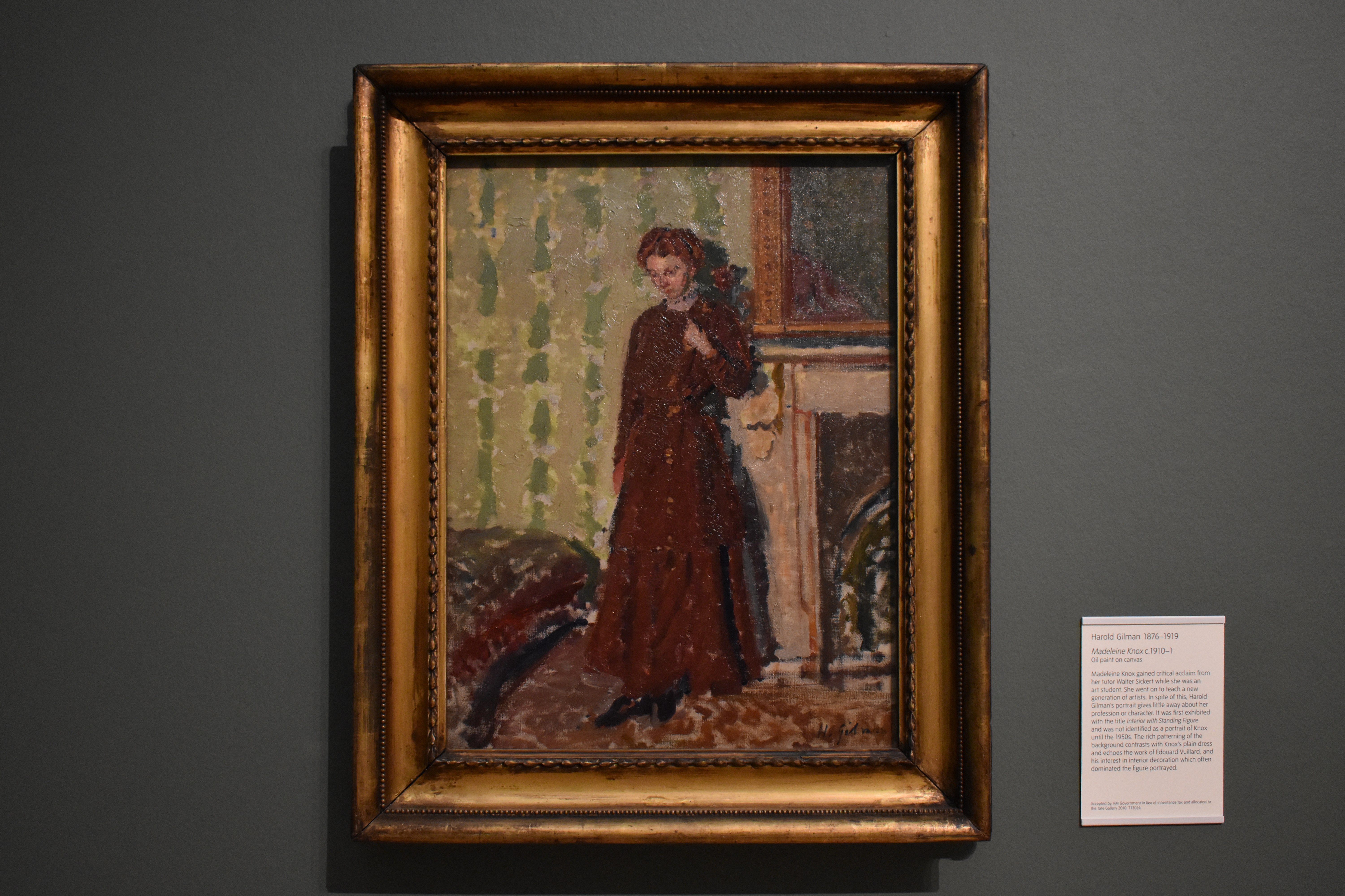 Мадлен Нокс получила признание критиков от своего наставника Уолтера Сикерта, когда она была студенткой художественного факультета. Мадлен стала учителем нового поколения художников. Несмотря на это, портрет Гарольда Гилмана мало что говорит о её профессии или характере. Впервые он был выставлен под названием "Интерьер со стоящей фигурой" и был идентифицирован как портрет Нокс только в 1950-х годах. Богатый узор фона контрастирует с простым платьем Нокс и перекликается с работами Эдуарда Вюйара и его интересом к декору интерьера, который часто доминировал над изображаемой фигурой.