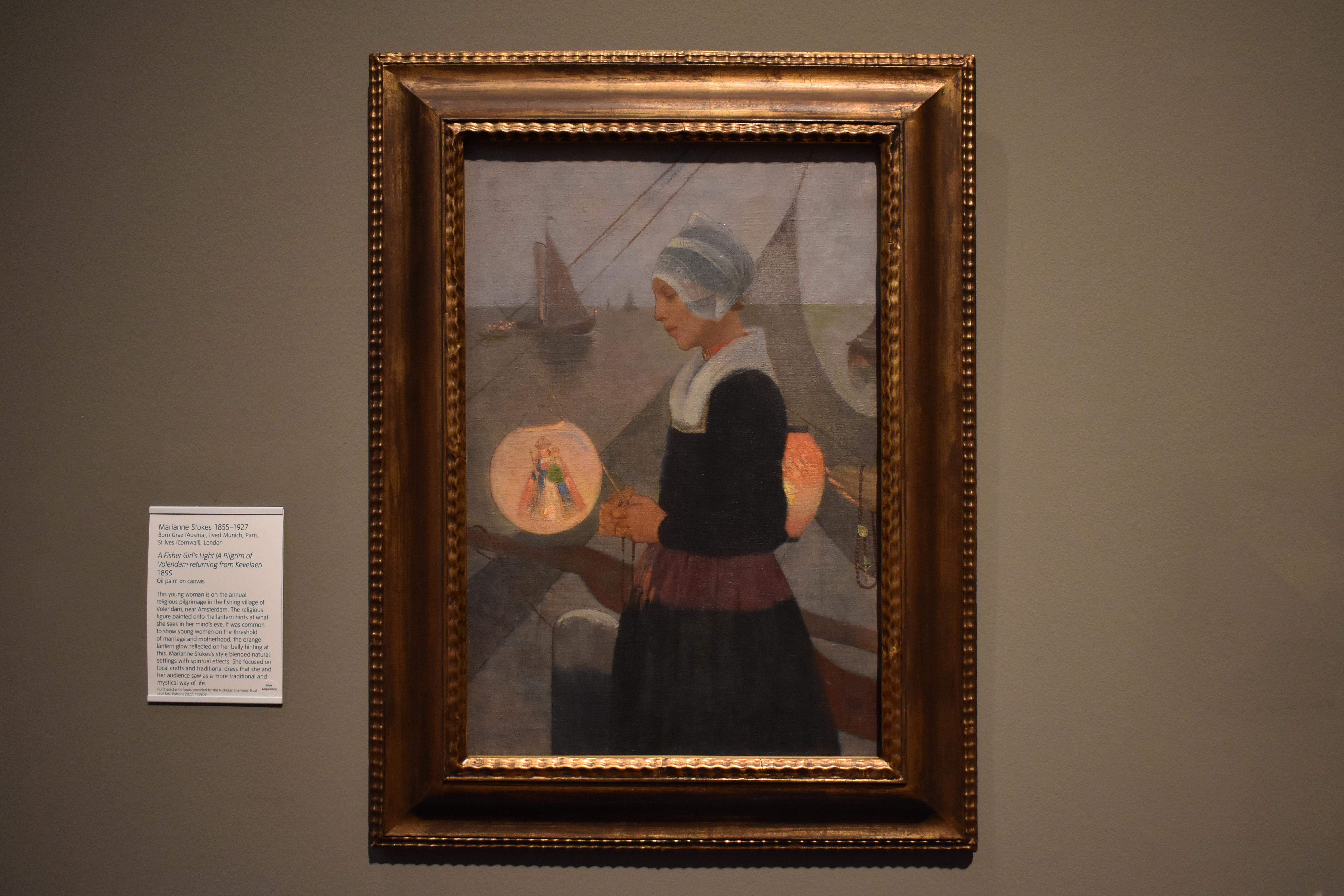 На картине "Свет рыбачки" изображена молодая женщина, идущая вдоль гавани, с наклоненной вниз головой и закрытыми глазами. Кажется, что она погружена в размышления. Она одета в традиционный местный костюм и крылатый белый головной убор голландского города Волендам. Два фонаря светятся оранжевым светом на фоне морского полумрака. За окном видны лодки и сети. Девушка рассматривает четки и фонарь с изображением Люксембургской Богоматери, Кевелаер, Утешительницы страждущих. Теплые шары фонаря, расположенные на фоне прохладной геометрии сетей и лодок, предвосхищают абстракцию начала двадцатого века. Картина "Свет девушки-рыбачки" служит примером изучения Марианной Стоукс средневековых техник и скорого перехода на яичную темперу, наносимую мелкими мазками для достижения более бледного, чистого цвета и более гладкой поверхности.