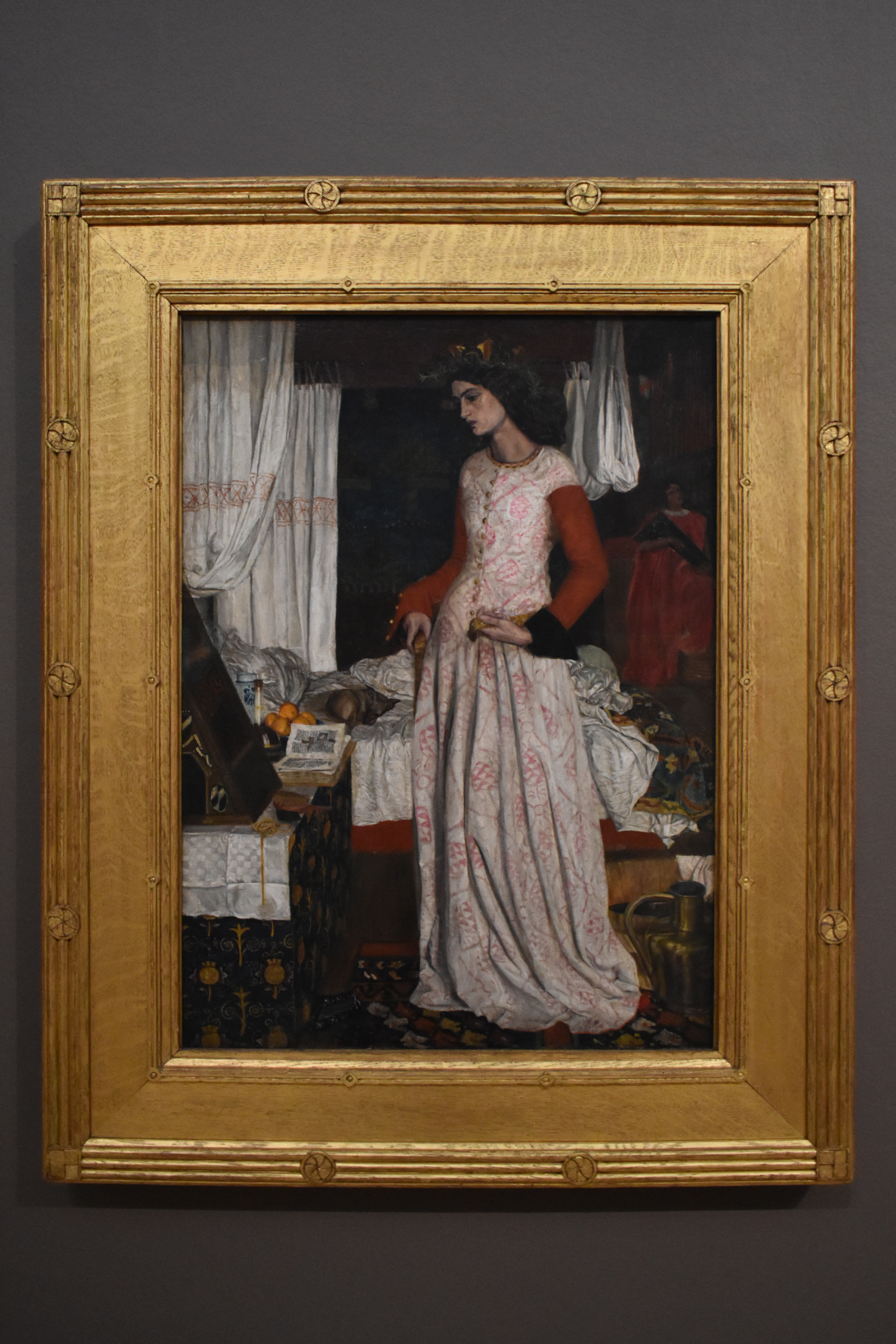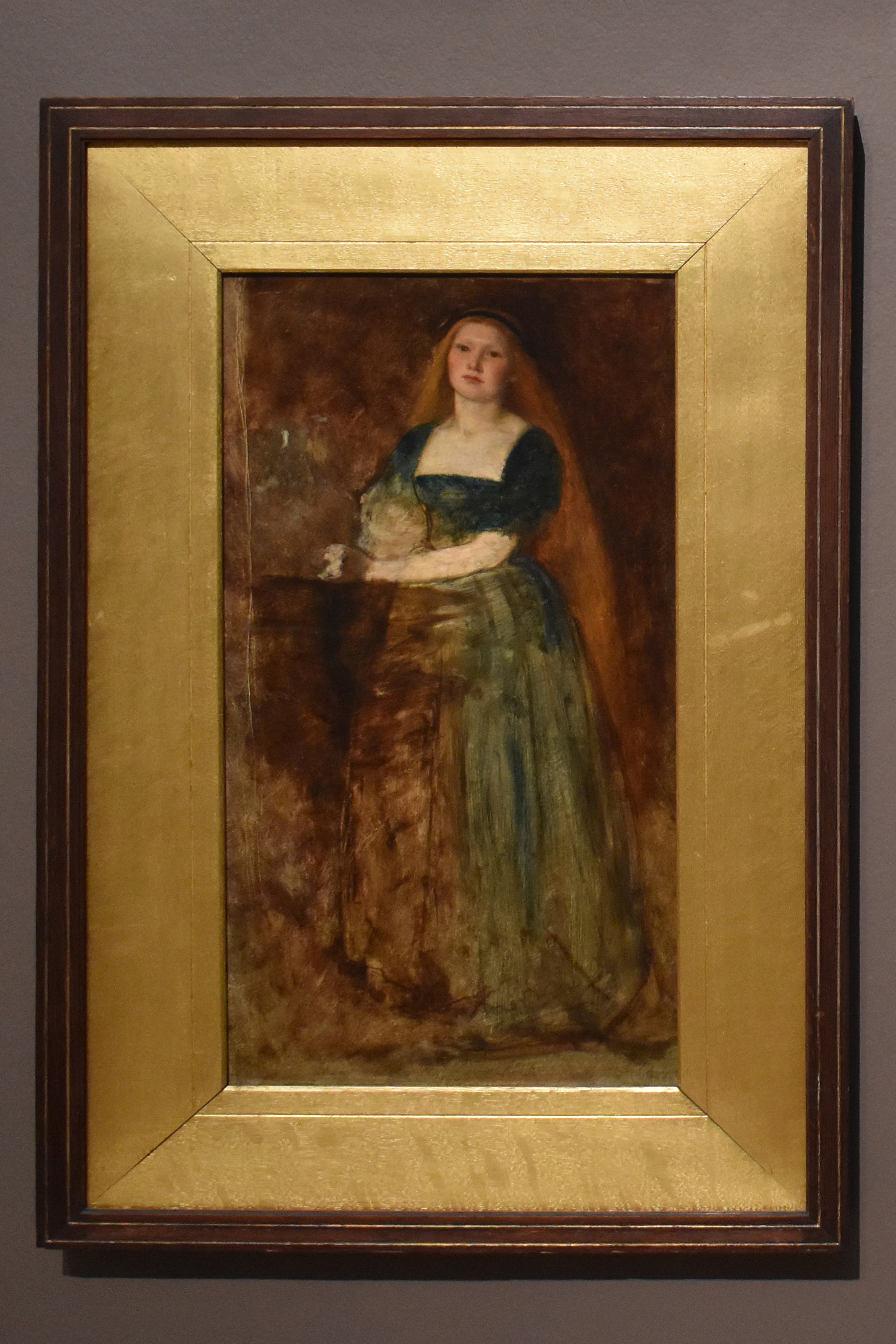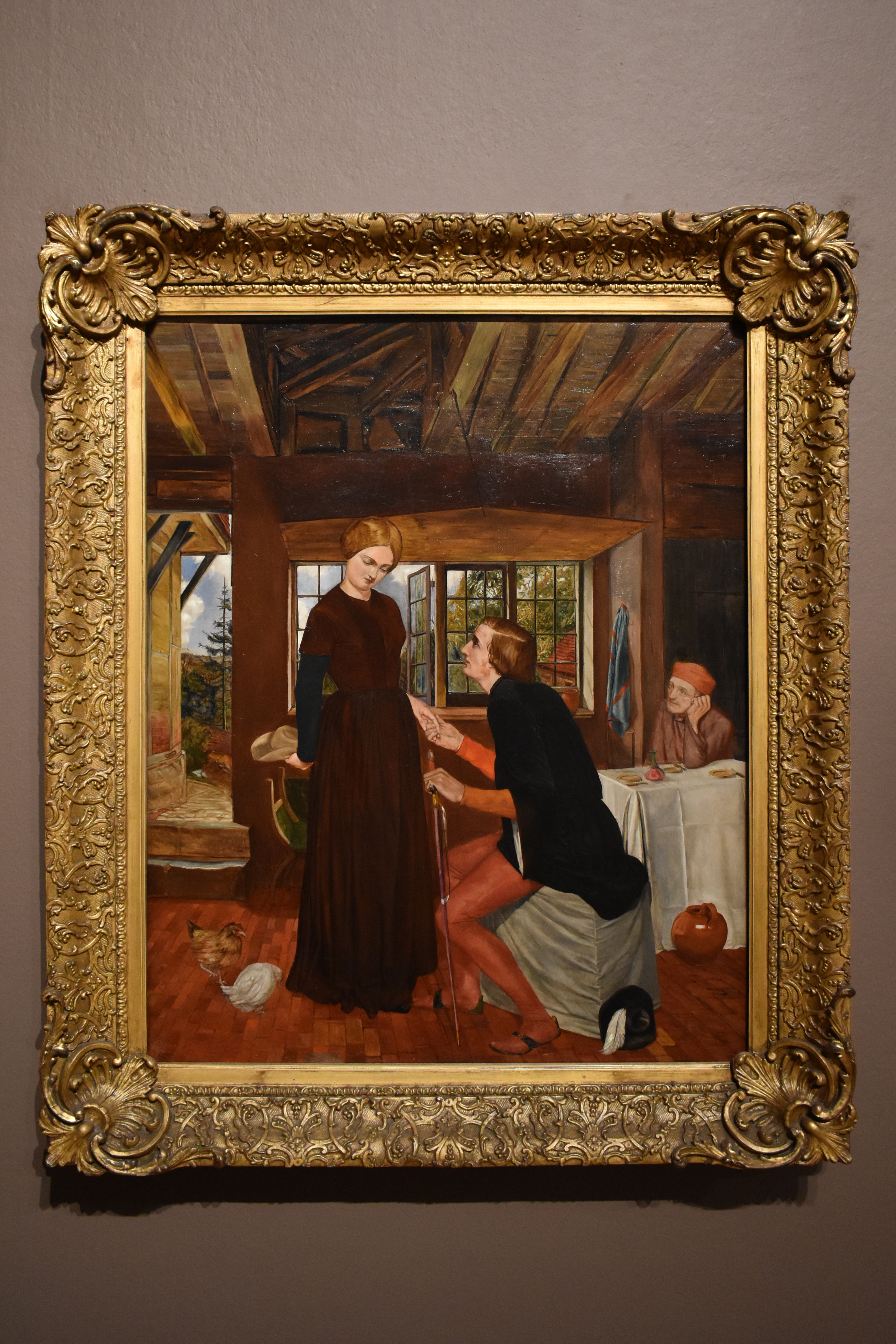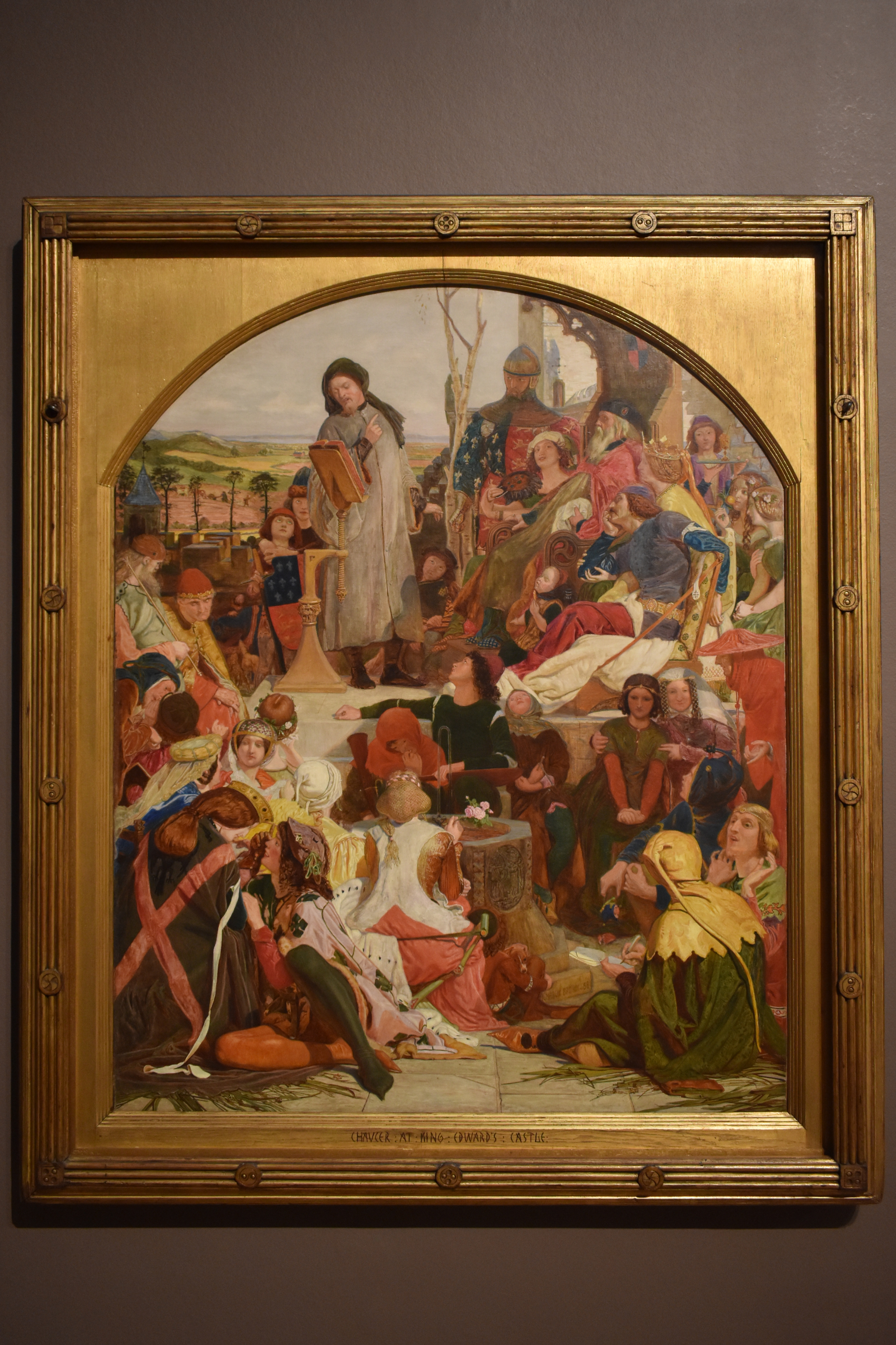 Прерафаэлиты часто искали вдохновения у британских писателей. Эта картина Форда Мэдокса Брауна посвящена средневековому поэту Джефри Чосеру. Браун считал Чосера поэтом "из народа", поскольку он был одним из первых, кто писал на местном английском языке, а не на латыни. Эта работа – копия самой большой картины Брауна 1851 года, предназначенной для украшения нового здания Парламента. Браун уделял большое внимание изучению деталей с натуры. По его словам, он "рассматривал свет и тень абсолютно так, как они существуют в любой момент, а не... в обобщенном стиле".