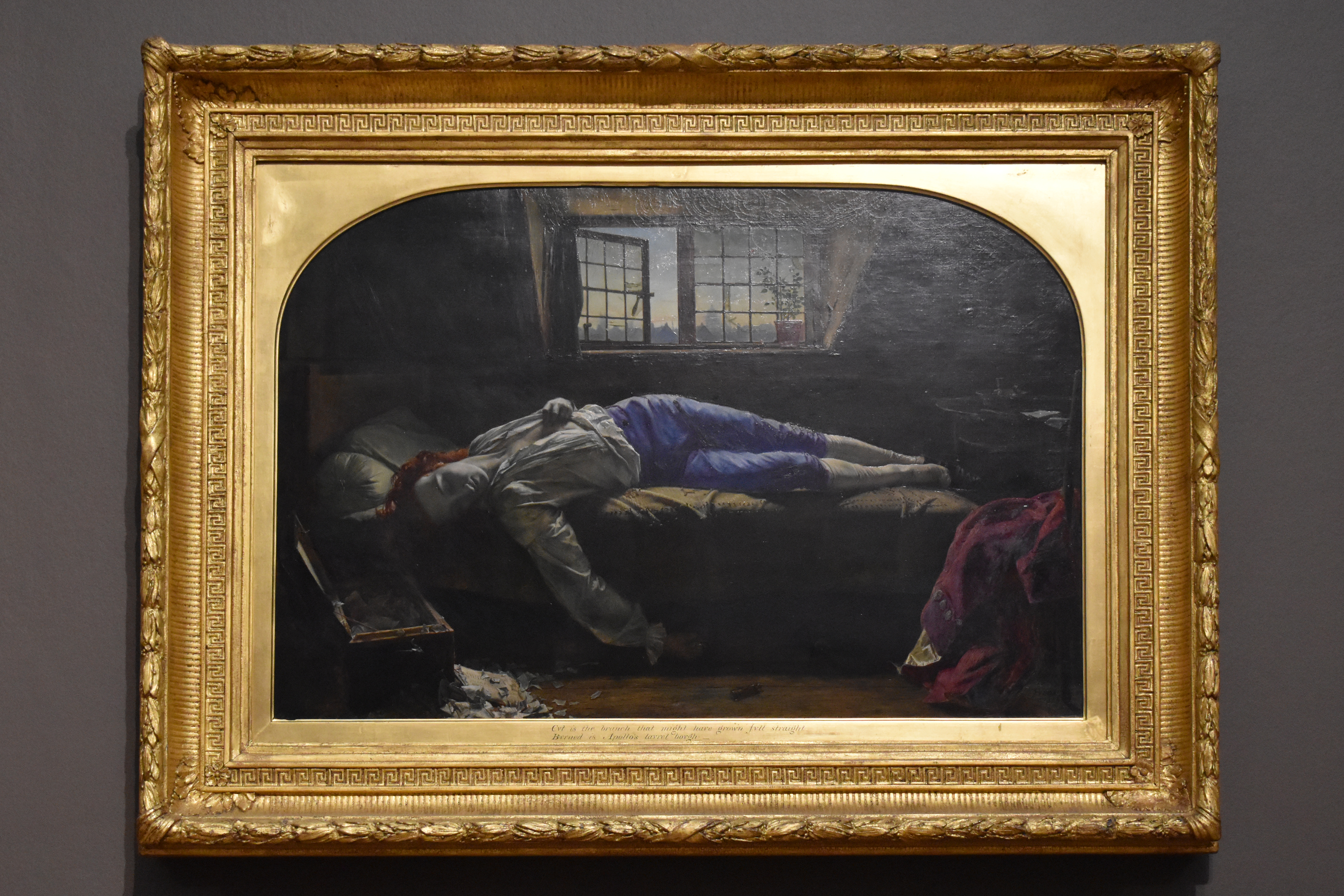 Эта очень романтизированная картина произвела фурор, когда впервые была выставлена в Королевской академии в 1856 году. Томас Чаттертон был поэтом, чьи "готические" сочинения, меланхоличная жизнь и юношеское самоубийство очаровали художников и писателей XIX века. В раннем возрасте он писал поддельные средневековые истории и стихи, которые переписывал на старый пергамент и выдавал за рукописи Средневековья. Позднее мошенничество было раскрыто. В Лондоне он с трудом зарабатывал на жизнь, сочиняя сказки и песни для популярных изданий. Оставшись без гроша, он покончил с собой, проглотив мышьяк в возрасте 17 лет.