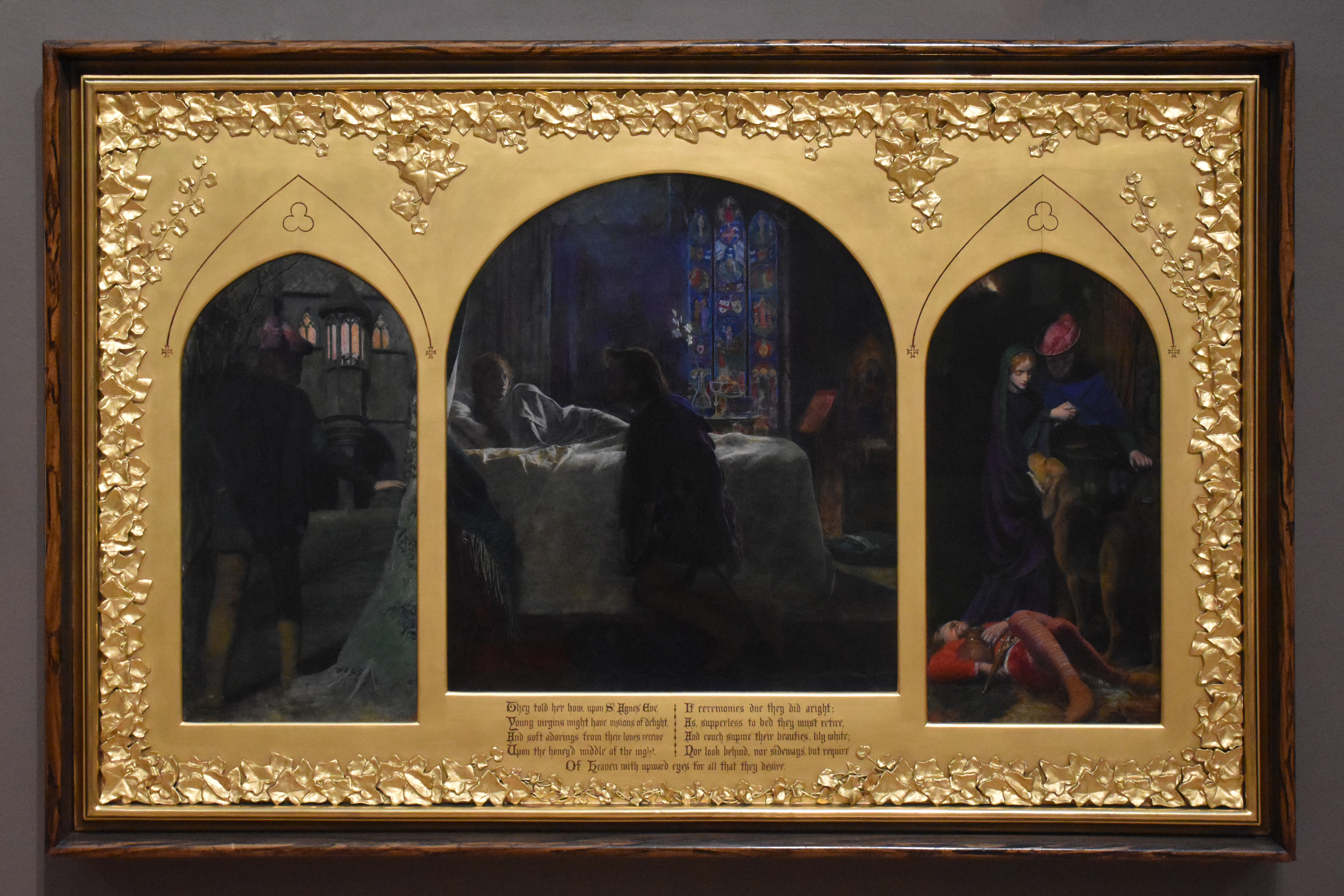 На этой работе изображены три момента из романтической поэмы Джона Китса "Канун Святой Агнессы". Поэма была любима художниками-прерафаэлитами. Порфиро, ненавидимый семьей своей возлюбленной Мадлен, проникает в её спальню в канун дня Святой Агнессы, когда, по поверьям, молодые женщины мечтают о своей настоящей любви. Сон Мадлен становится реальностью, когда Порфиро будит её, и вместе они убегают из замка. Позы персонажей и витражи напоминают средневековые библейские картины о том, как ангел Гавриил возвещает матери Марии о появлении Иисуса.