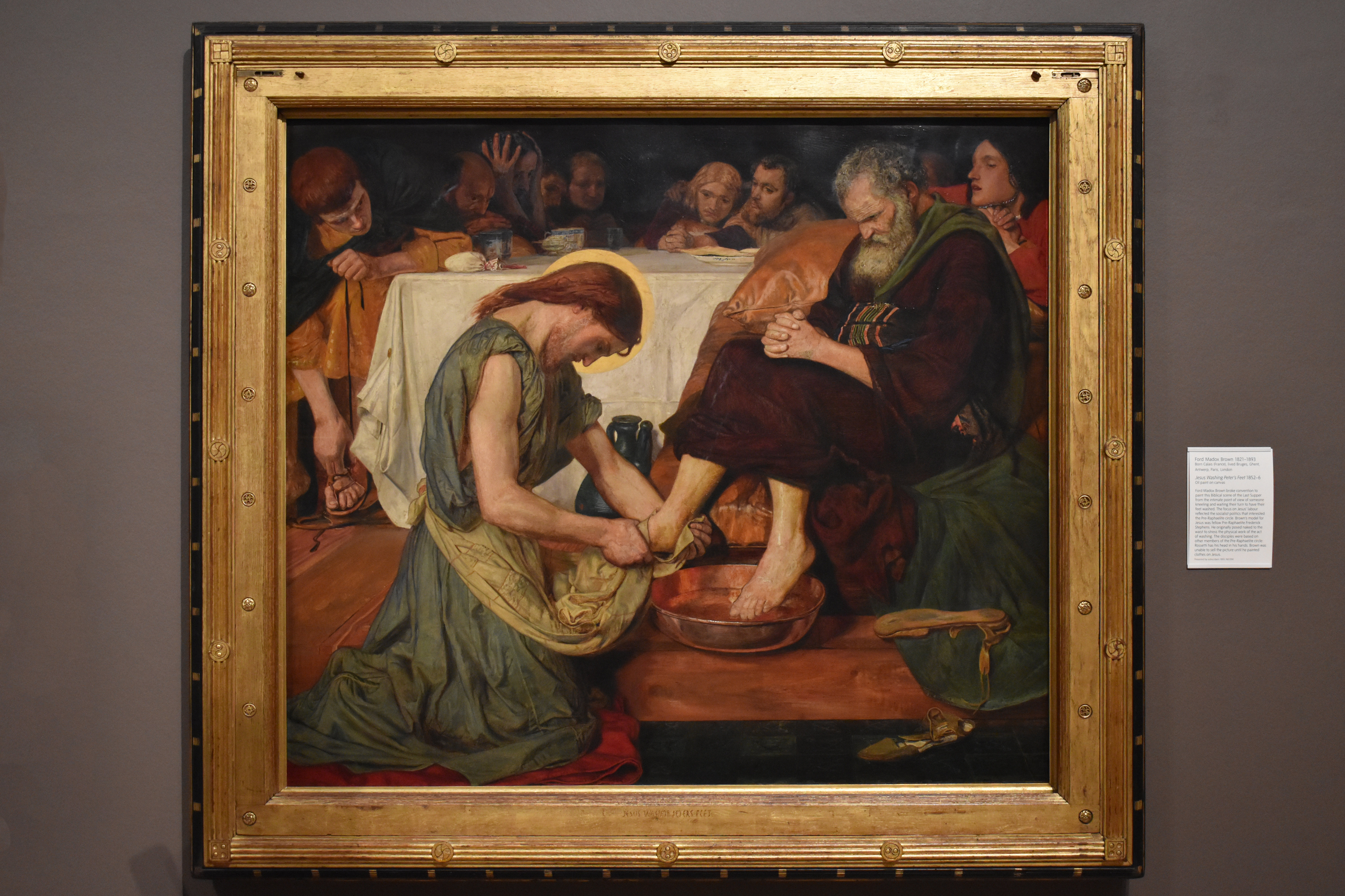Форд Мэдокс Браун нарушил традицию и написал эту библейскую сцену Тайной вечери с интимной точки зрения человека, стоящего на коленях и ожидающего своей очереди на омовение ног. Акцент на труде Иисуса отражает социалистическую политику, которая интересовала кружок прерафаэлитов. Моделью для Иисуса Браун выбрал своего соратника по прерафаэлитам Фредерика Стивенса. Изначально он позировал обнаженным до пояса, чтобы подчеркнуть физический труд во время омовения. Ученики были похожи на других членов кружка прерафаэлитов: Россетти держит голову в руках. Брауну не удавалось продать картину, пока он не написал одежду на Иисусе.