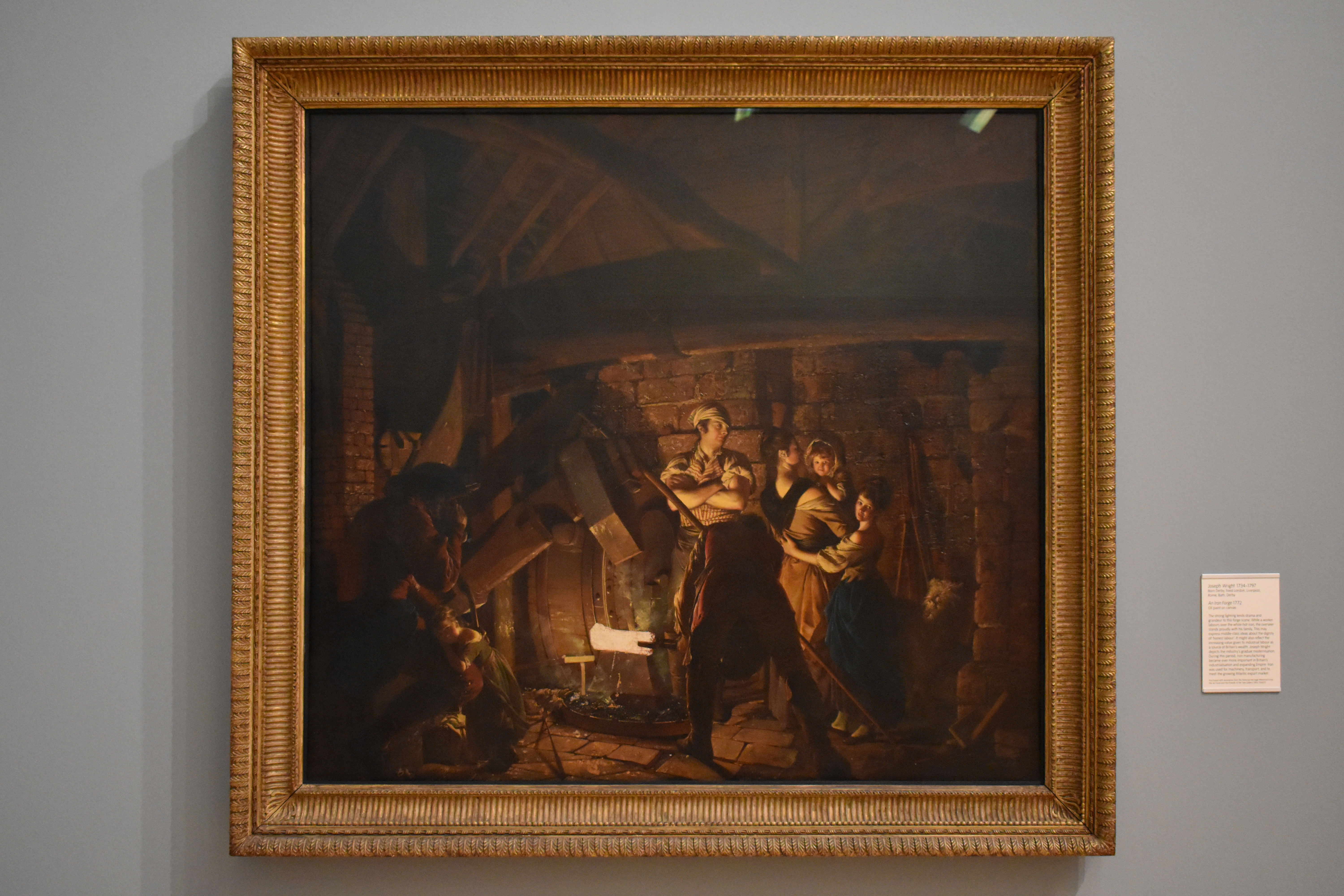 Сильное освещение придает драматизм и величие этой сцене кузницы. Пока рабочий трудится над раскаленным железом, надсмотрщик гордо стоит со своей семьей. Это может выражать представления среднего класса о достоинстве "честного труда". Возможно, это также отражает растущую ценность промышленного труда как источника богатства Британии. Джозеф Райт изображает постепенную модернизацию промышленности. В этот период производство железа стало играть все более важную роль в индустриализации Британии и расширении империи. Железо использовалось для производства машин, транспорта и для удовлетворения растущего атлантического экспортного рынка.![]()