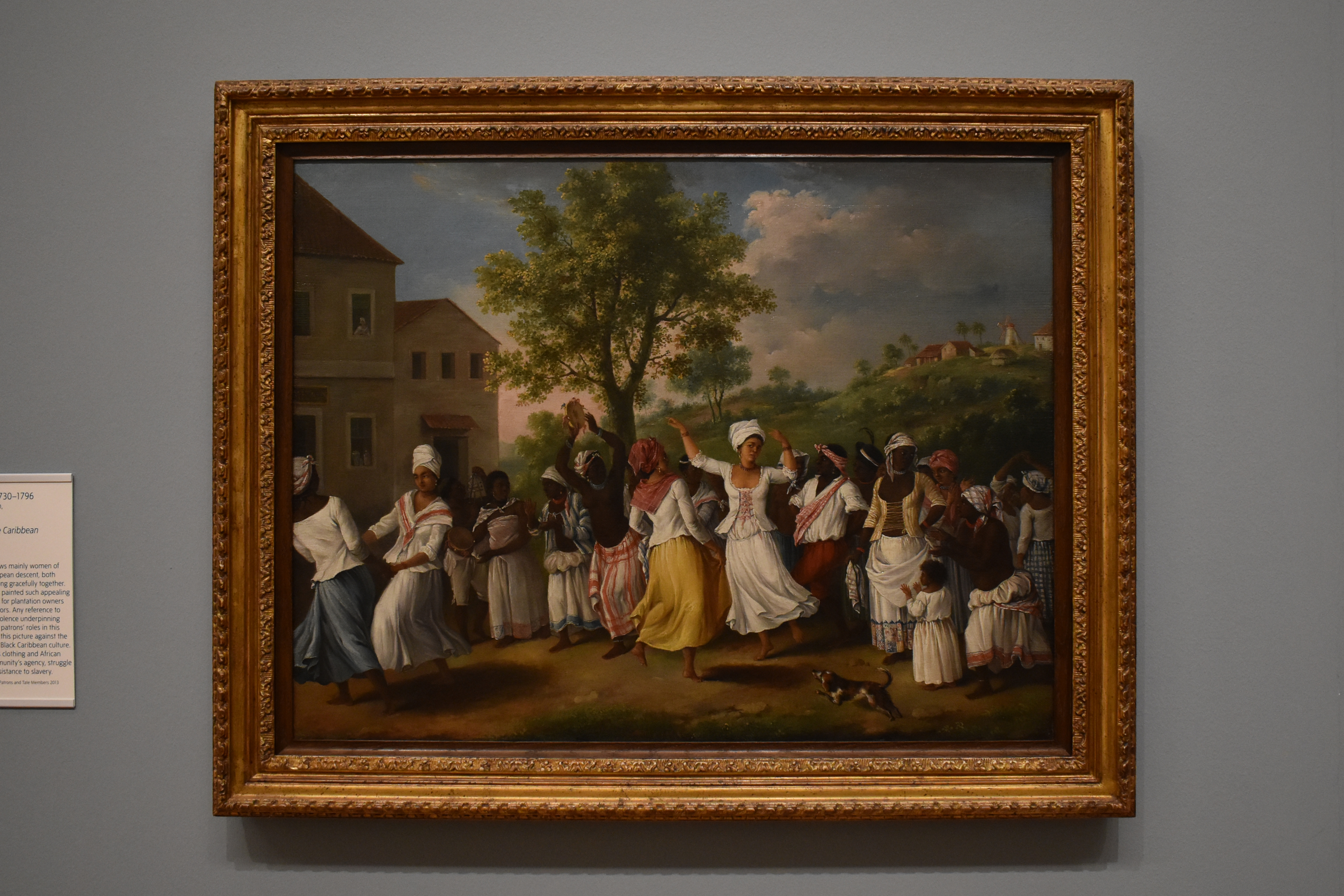 На этой идеализированной сцене изображены женщины африканского и афроевропейского происхождения, как свободные, так и порабощенные, грациозно танцующие вместе. Агостино Бруниас рисовал такие привлекательные образы жизни на плантациях в основном для владельцев плантаций и колониальных администраторов. Любое упоминание о принудительном труде и насилии, лежащем в его основе, стирается, как и роль его покровителей в этом угнетении. Тем не менее, при прочтении этой картины против воли открываются аспекты культуры чернокожих карибцев. Такие детали, как женская одежда и африканский барабан, указывают на самостоятельность этой общины, её борьбу за свою индивидуальность и сопротивление рабству.
