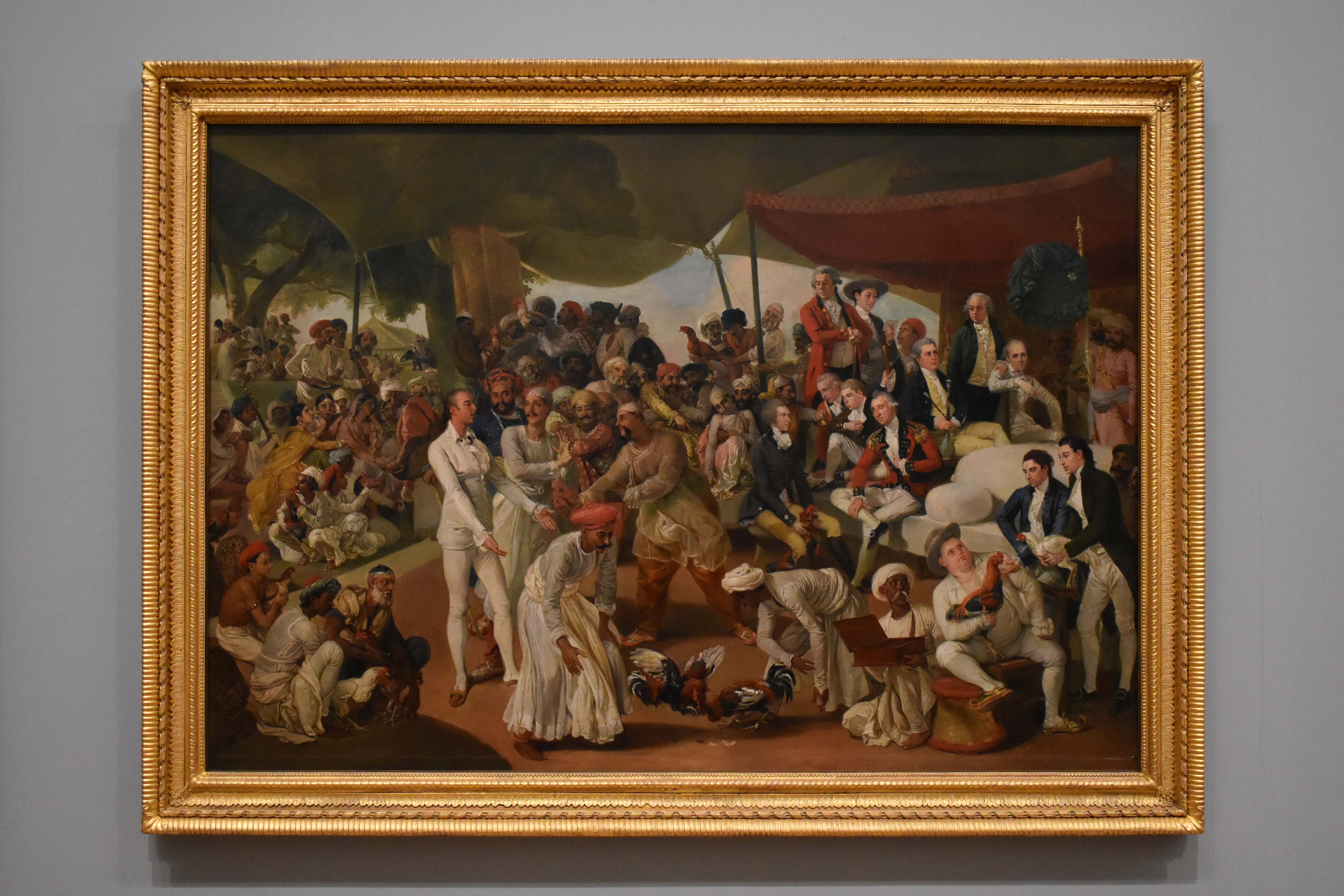 На этой амбициозной картине изображен петушиный бой, состоявшийся в Лакхнау, Индия, в 1784 году. Птицы принадлежат Асаф-уд-Дауле, навабу-вазиру Оуда, и Джону Мордаунту, служащему Ост-Индской компании и полковнику личной телохранителей Асафа. Их окружает космополитическая толпа, включающая индийских придворных и чиновников Компании. Эта дружеская сцена напоминает о культуре Компании, в которой принято «участвовать», а не "управлять". Однако на самом деле Асаф был лишен реальной власти со стороны Компании. Зоффани тонко намекает на этот дисбаланс в англо-индийских отношениях через доминирование британской птицы над индийским петушком.