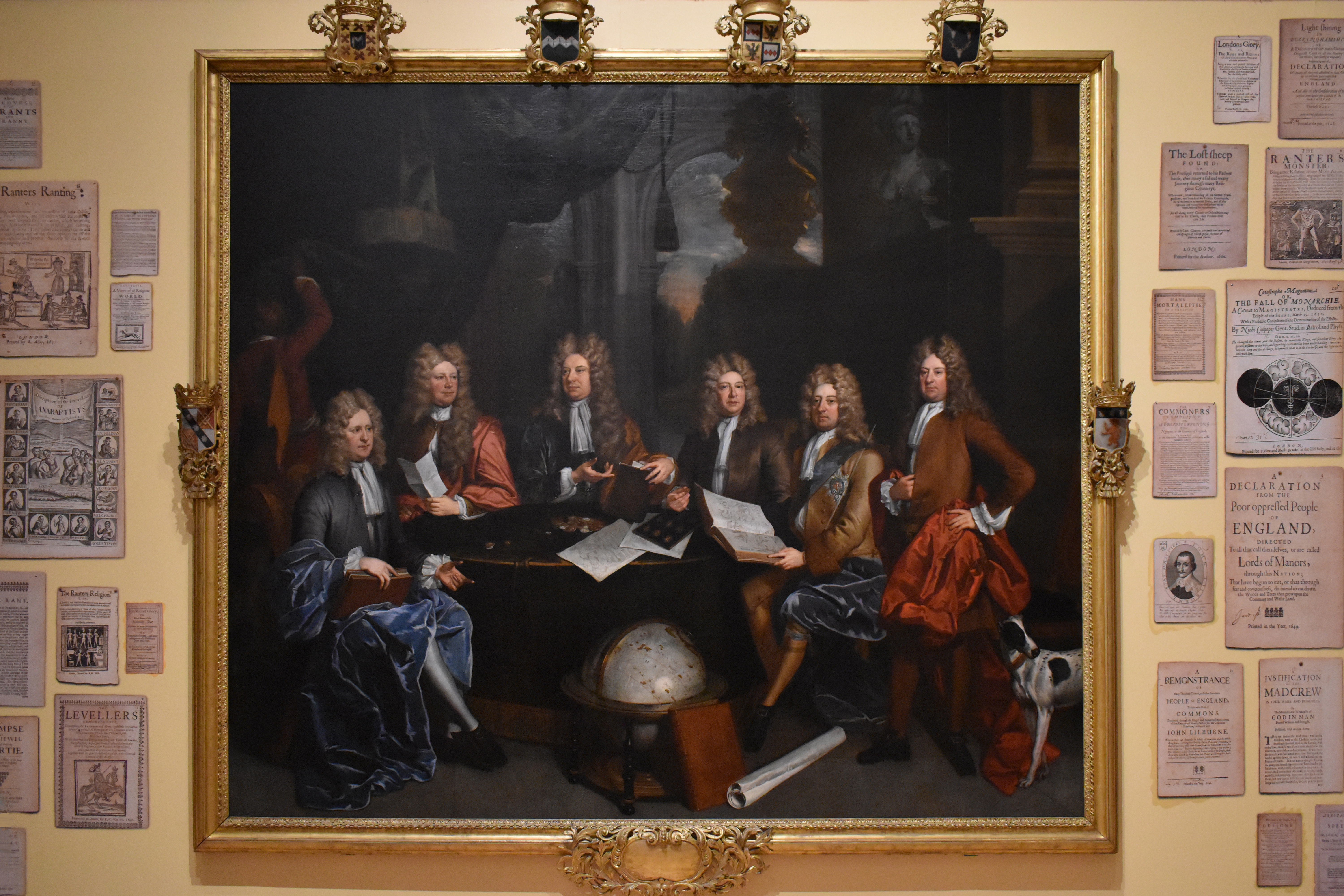 На этом портрете изображены лидеры политической партии вигов. Эдвард Рассел, первый граф Орфорд (стоит справа), заказал картину. Слева от собравшихся гостей стоит чернокожий мальчик. Мы не знаем, кто он, и был ли он реальным человеком. Скорее всего, художник включил их в портрет, чтобы показать богатство, статус и власть белых посетителей. Гравюры с изображением римских побед подчеркивают военные успехи Британии и стремление к созданию империи. Глобус может указывать на интерес Британии к новым торговым путям.