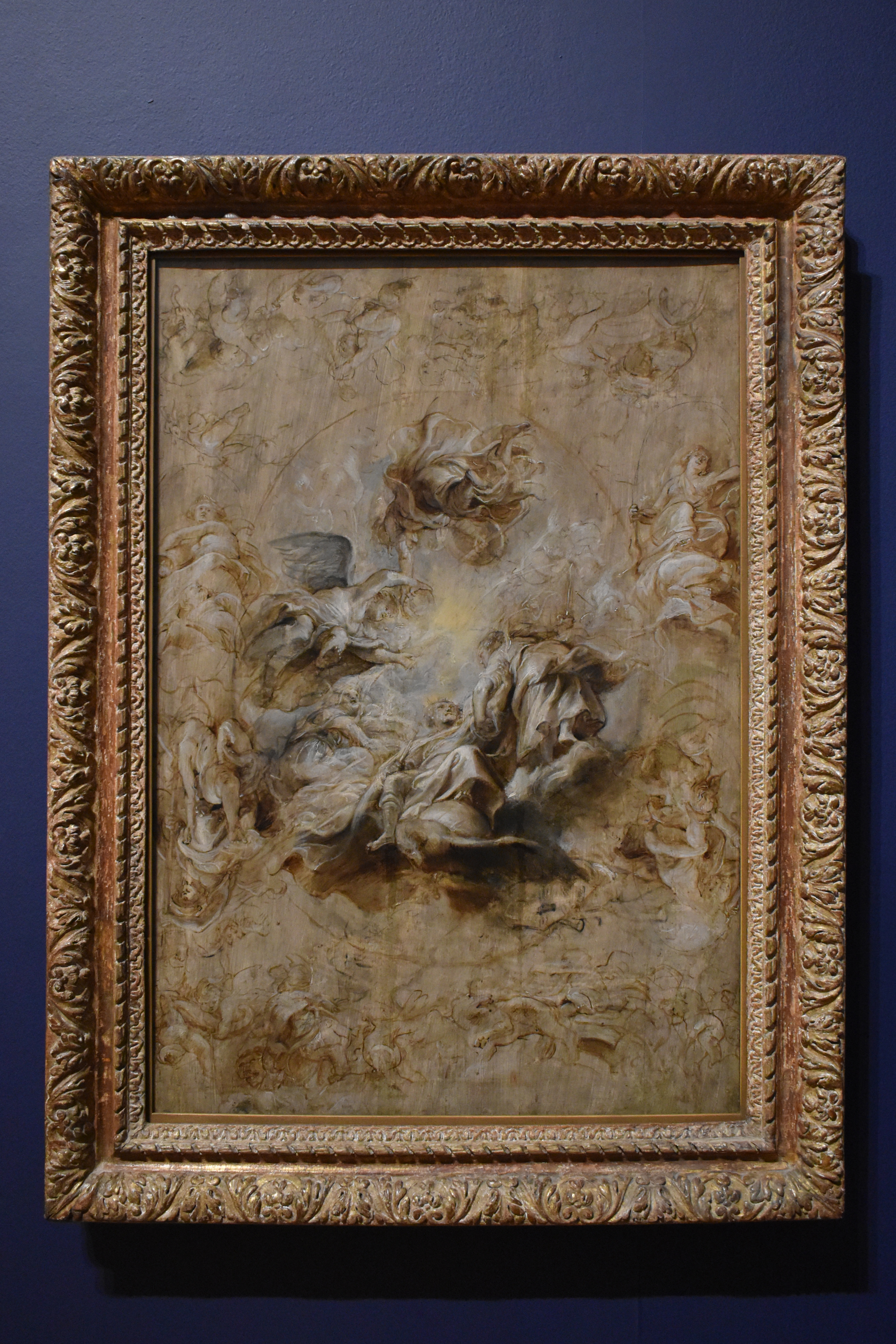 Это эскиз для росписи потолка Банкетного дома во дворце Уайтхолл. Карл I заказал их в честь правления своего отца, Якова I. Яков возносится к небу, сидя на глобусе. Фигура Справедливости ведет его, чтобы короновать Минервой (богиней мудрости) и Победой. Апофеоз – это превращение из человека в божество.