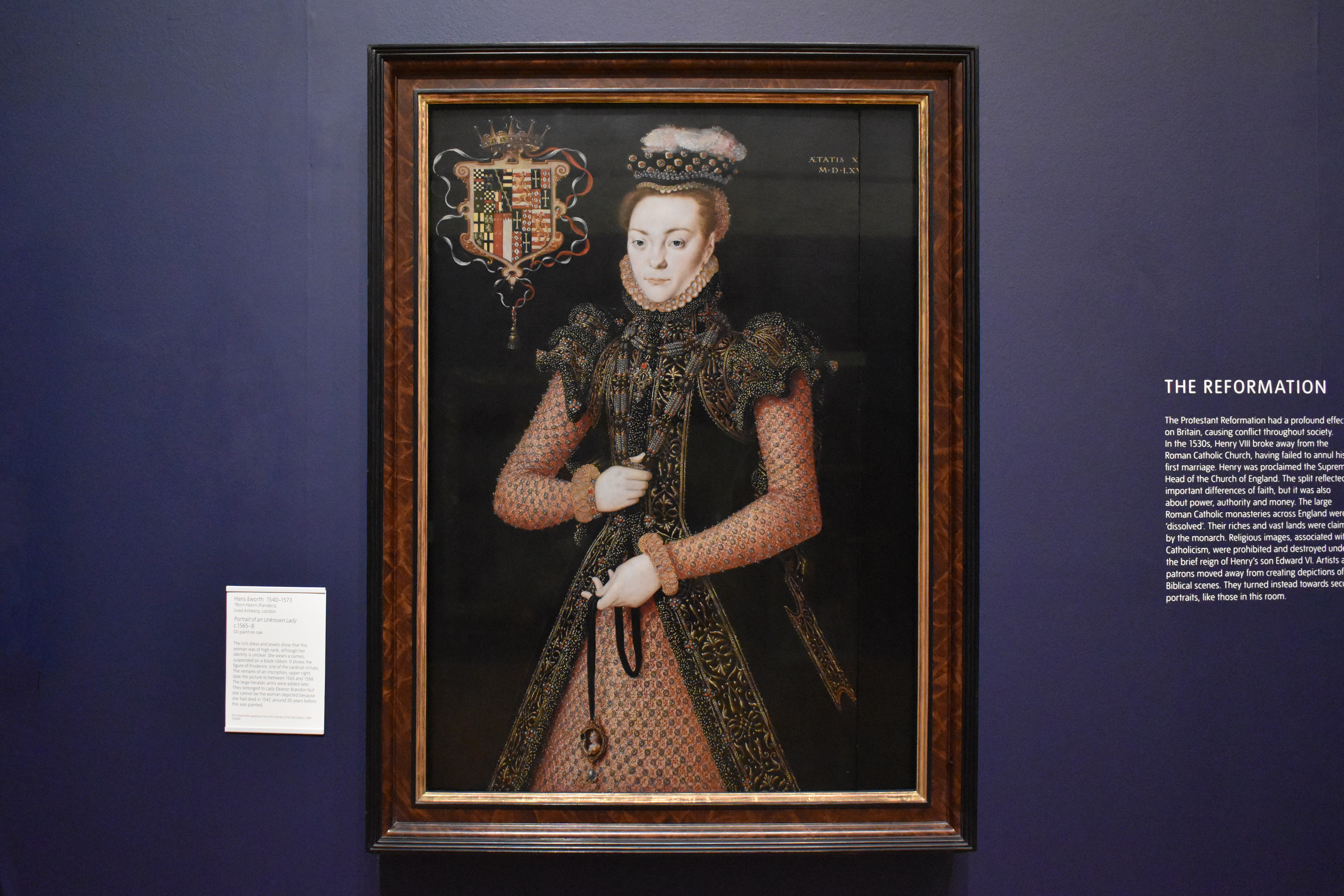 Богатое платье и драгоценности свидетельствуют о высоком положении этой женщины, хотя её личность неясна. Она носит камею, подвешенную на чёрной ленте. На ней изображена фигура Благоразумия, одной из кардинальных добродетелей. Остатки надписи в правом верхнем углу датируют картину 1565-1568 годами. Большие геральдические гербы были добавлены позже. Они принадлежали леди Элеоноре Брэндон, но она не может быть той женщиной, которая изображена на картине, поскольку умерла в 1547 году, примерно за 20 лет до написания этой картины.