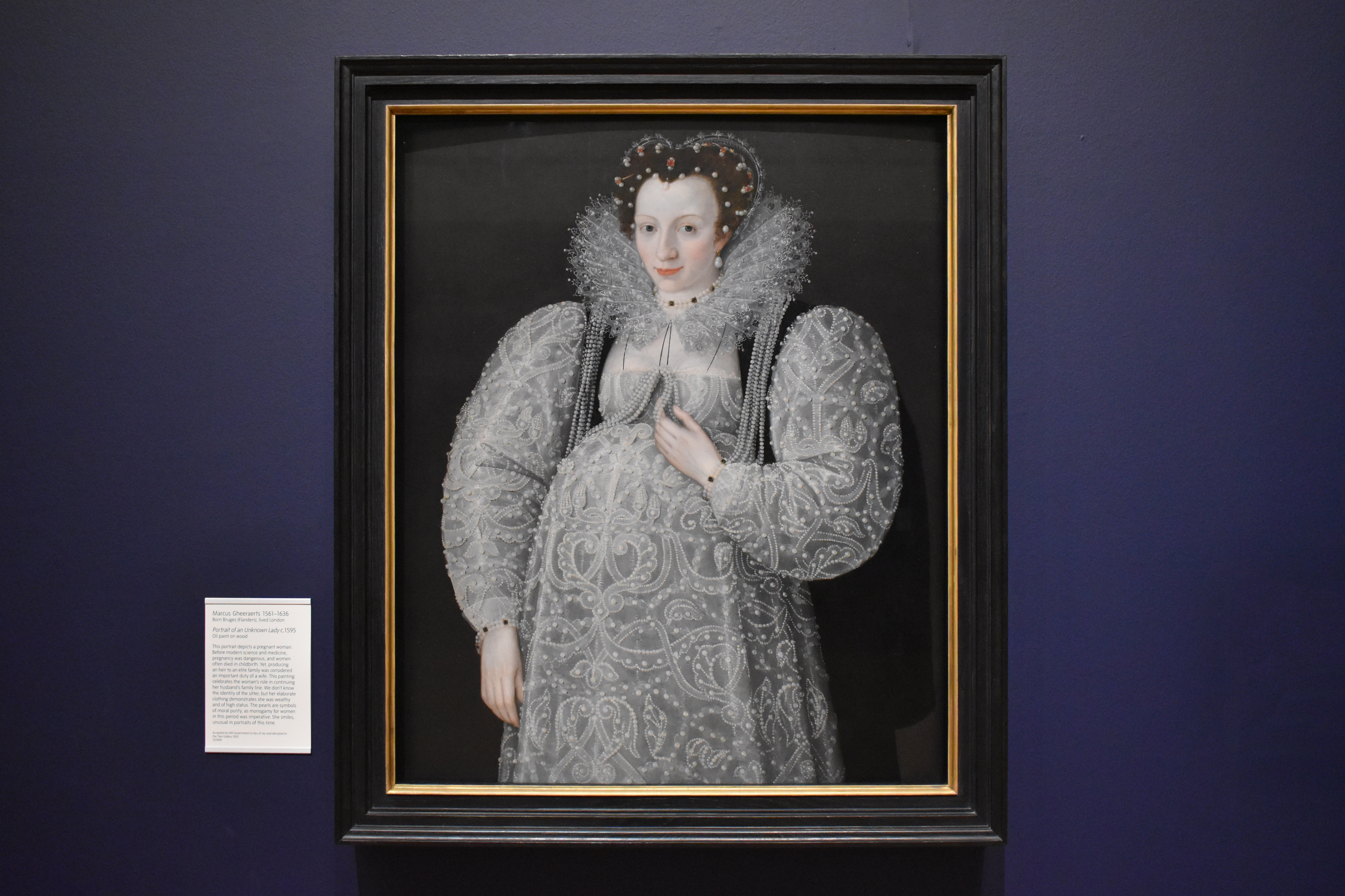 На этом портрете изображена беременная женщина. В те времена, до появления современной медицины, беременность была опасна, и женщины часто умирали во время родов. Тем не менее, рождение наследника для элитной семьи считалось важной обязанностью жены. Эта картина прославляет роль женщины в продолжении рода своего мужа. Мы не знаем, кто изображен на картине, но её изысканная одежда свидетельствует о том, что она была богата и имела высокий статус. Жемчуг – символ моральной чистоты, поскольку моногамия для женщин в этот период была обязательным условием. Она улыбается, что необычно для портретов этого времени.