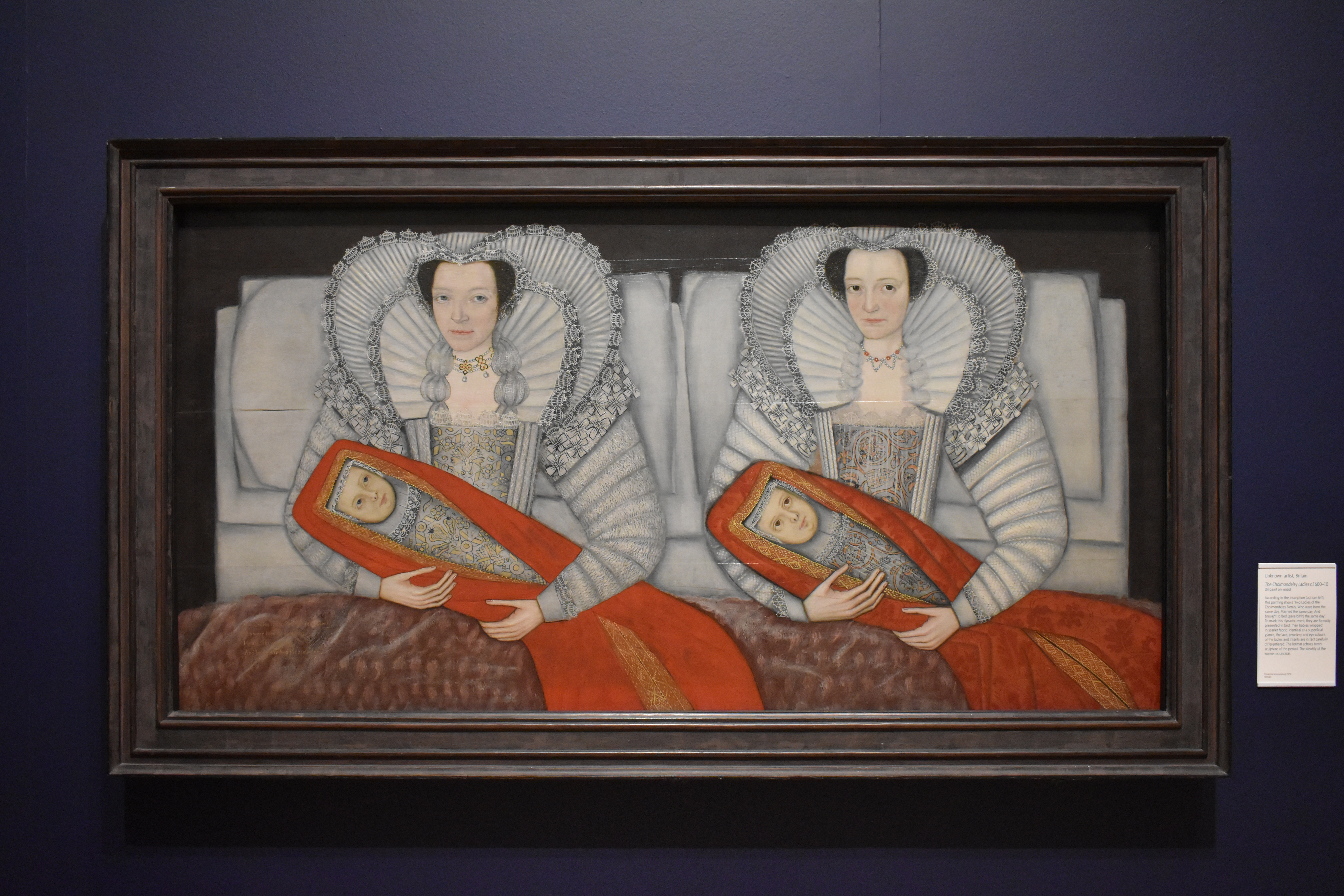 Согласно надписи (внизу слева), на этой картине изображены "Две дамы из семьи Чолмондли, которые родились в один и тот же день, вышли замуж в этот же день и легли в постель [родили] в тот же день". Чтобы отметить это династическое событие, они официально представлены в постели, их младенцы завернуты в алую ткань. Одинаковые на первый взгляд, кружева, украшения и цвет глаз дам и младенцев на самом деле тщательно различаются. Формат перекликается с гробничной скульптурой того времени. Идентичность женщин неясна.
