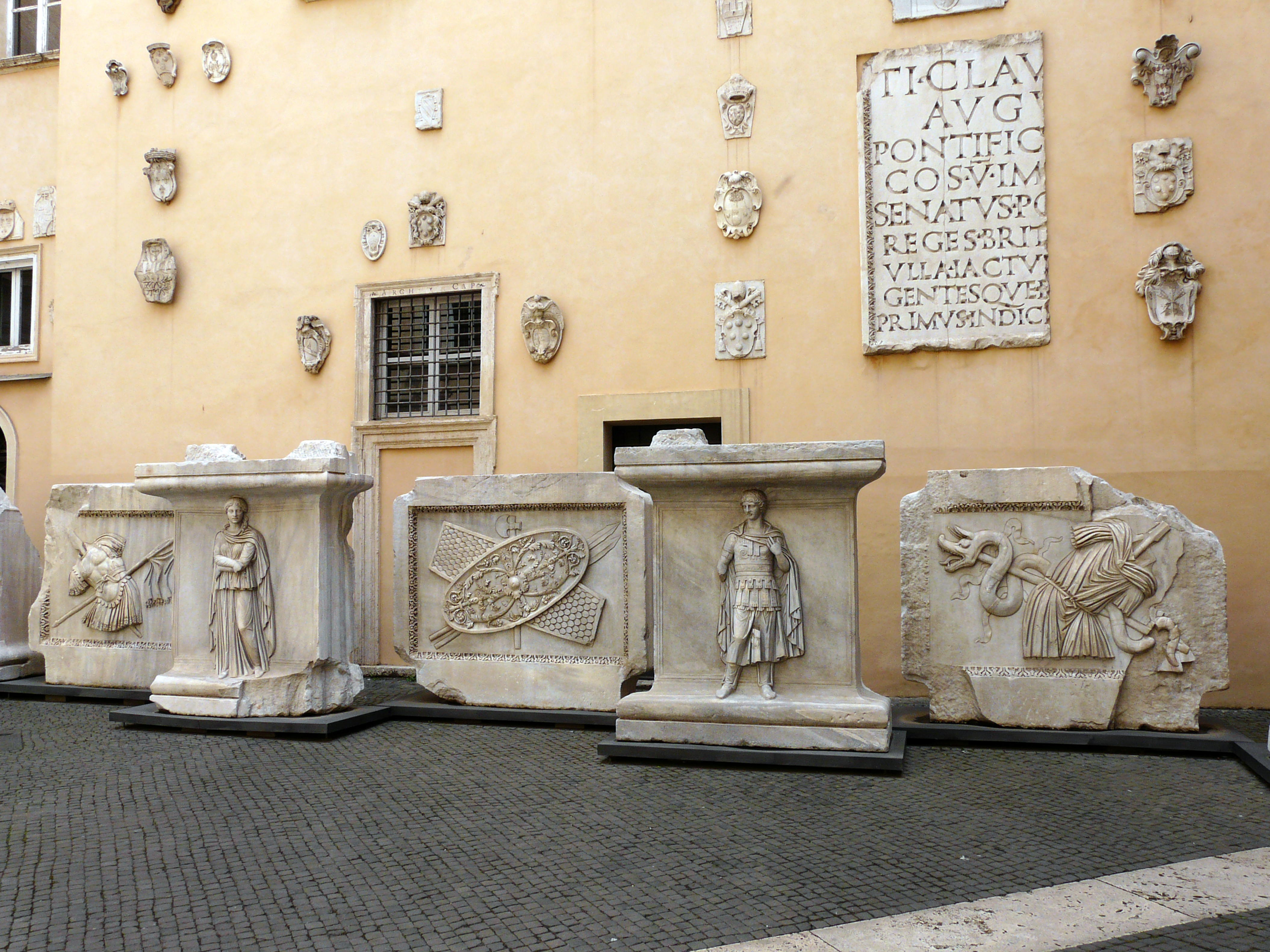 На левой стороне двора помещены рельефы, изображающие провинции Рима, найденные в руинах Храма Божественного Адриана на площади Пьетра в Риме.