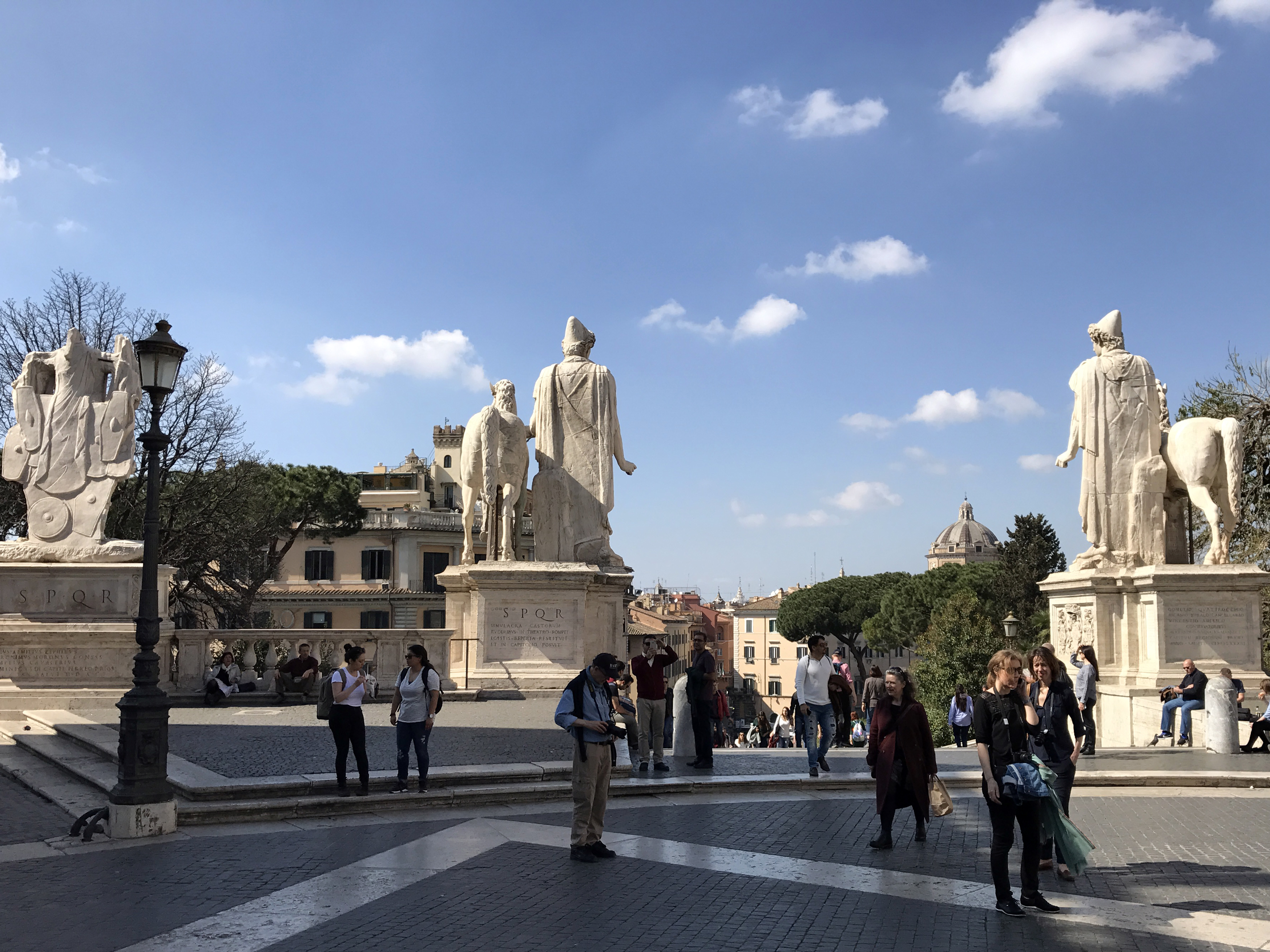 Вершину лестницы венчают статуи легендарных братьев–близнецов Кастора и Поллукса Диоскуров, которые были рождены прекрасной Ледой от Зевса, принявшего облик лебедя. Странность их происхождения подчёркивается маленькими шапочками, представляющими собой половинки лебединого яйца. Повзрослев, юноши приняли участие в походе аргонавтов, Калидонской охоте и стали победителями Олимпийских игр (Кастор в беге, а Поллукс в кулачных боях). Статуи Диоскуров были найдены в 1583 во время раскопок театра в городе Помпеи. Вдоль балюстрады (слева и справа от Диоскуров) установлены статуи императора Константина, его третьего сына императора Констанция II, два верстовых столба с Апиевой дороги и две скульптуры из фонтана "Trofei di Mario" (сооружён в честь Гая Мария, древнеримского полководца и политического деятеля). Строительство комплекса завершилось после смерти мастера, при этом его приемник Джакома делла Порта, в основном, сохранил первоначальный проект. В 1940 г. площадь была вымощена в соответствии с замыслом Буонарроти.