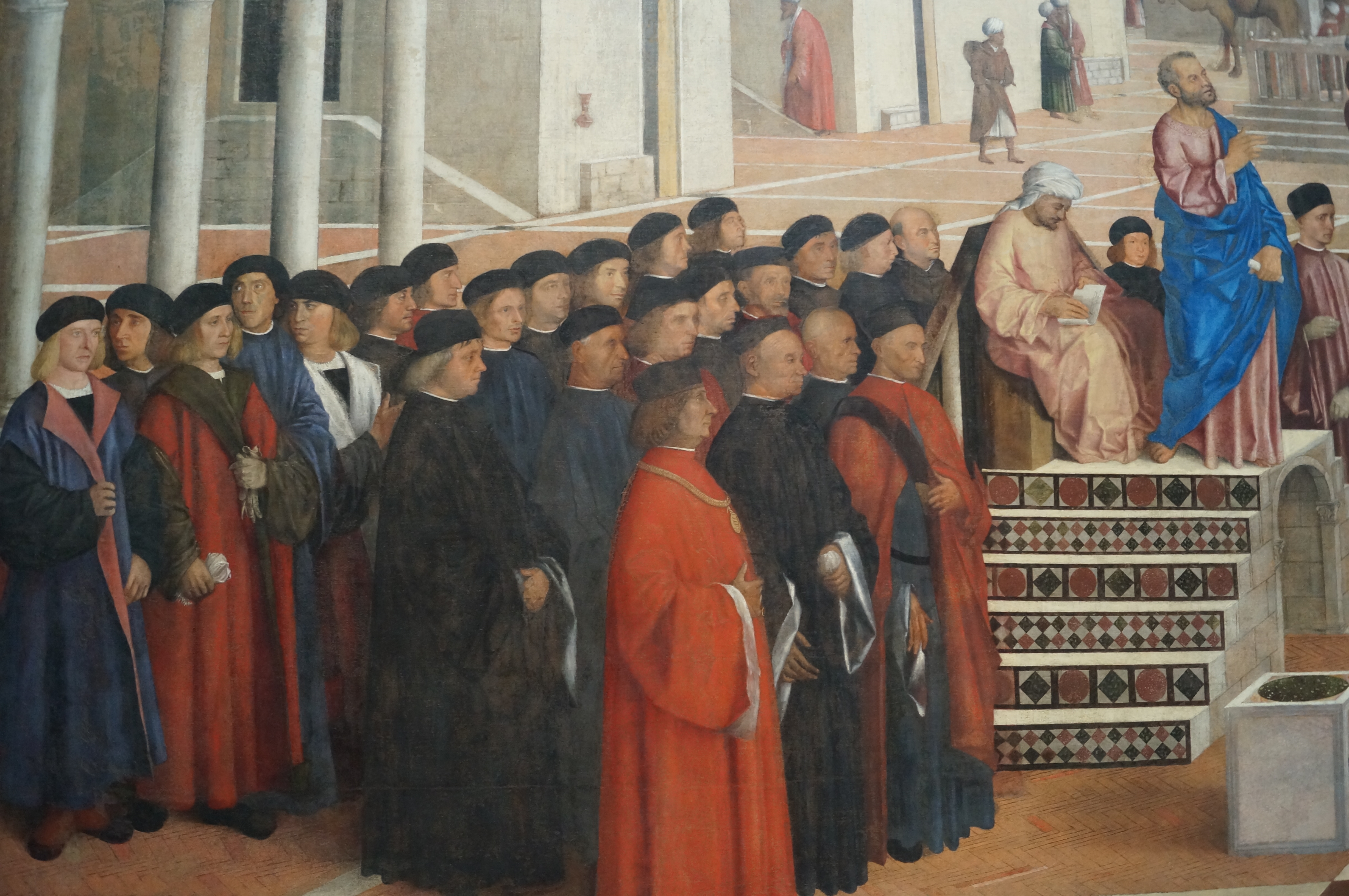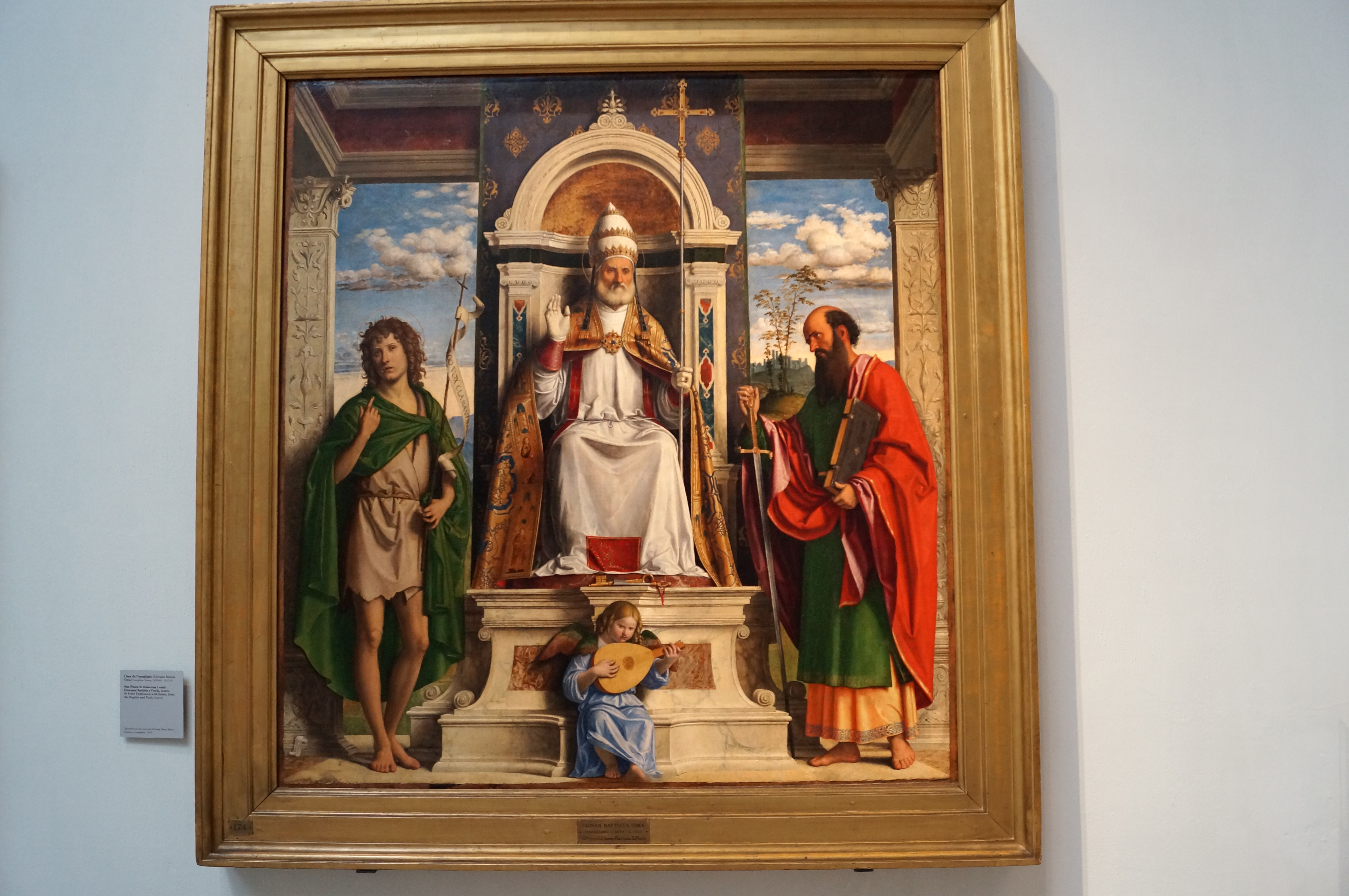 Here we see St. Peter front of an architectural background, with no presence of the sky or nature, but sculpted in three-dimensional space. Saint Peter is elderly, with the two keys of the church, standing on dry ground strewn with small stones, carefully detailed. Compare Fra Carnevale to the Polittico of Praglia by Antonio Vivarini and Giovanni d’Alemagna in Room IV nearby. Here we still have one foot in the late Gothic world where everything is much more synthetic.