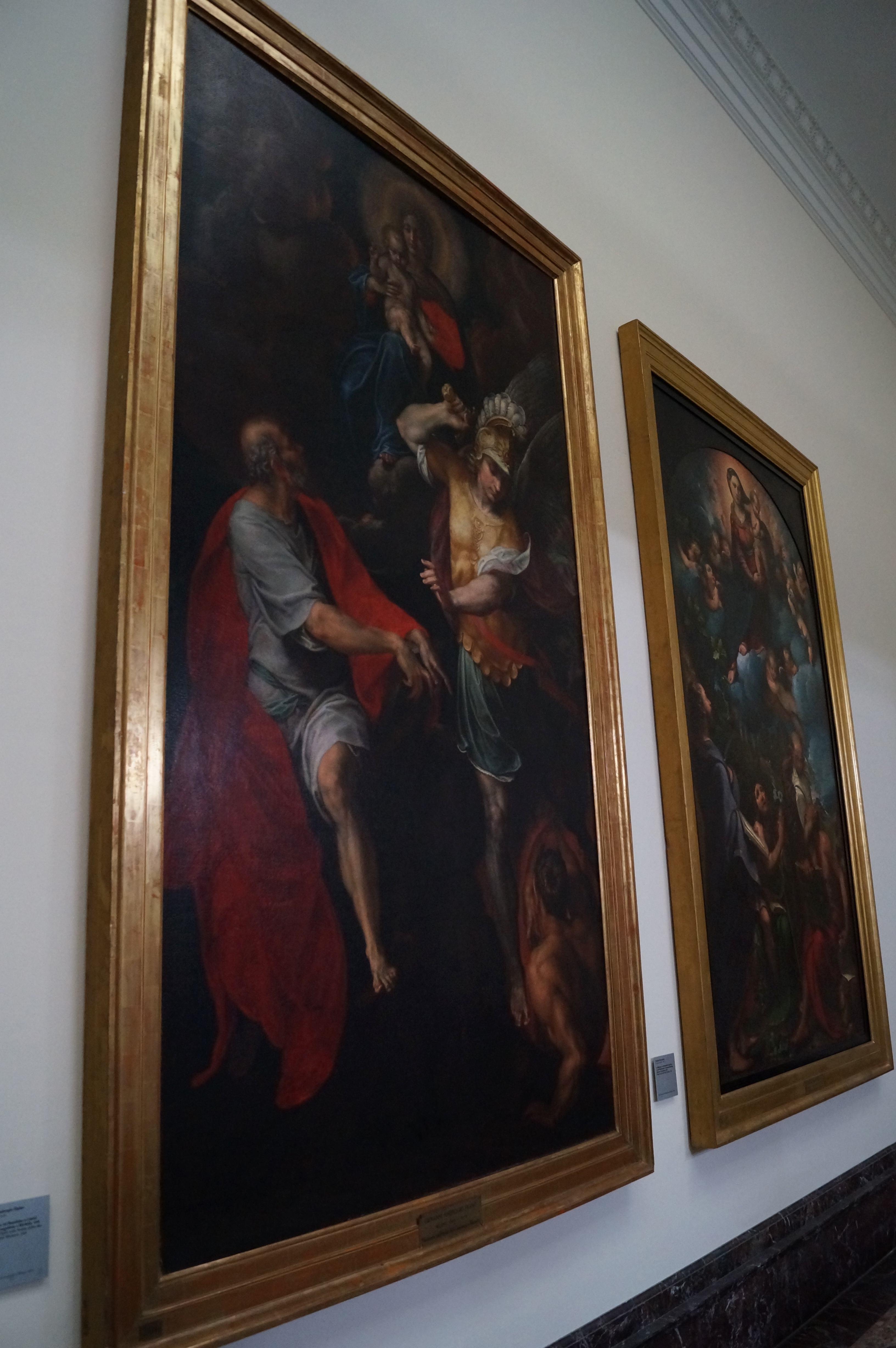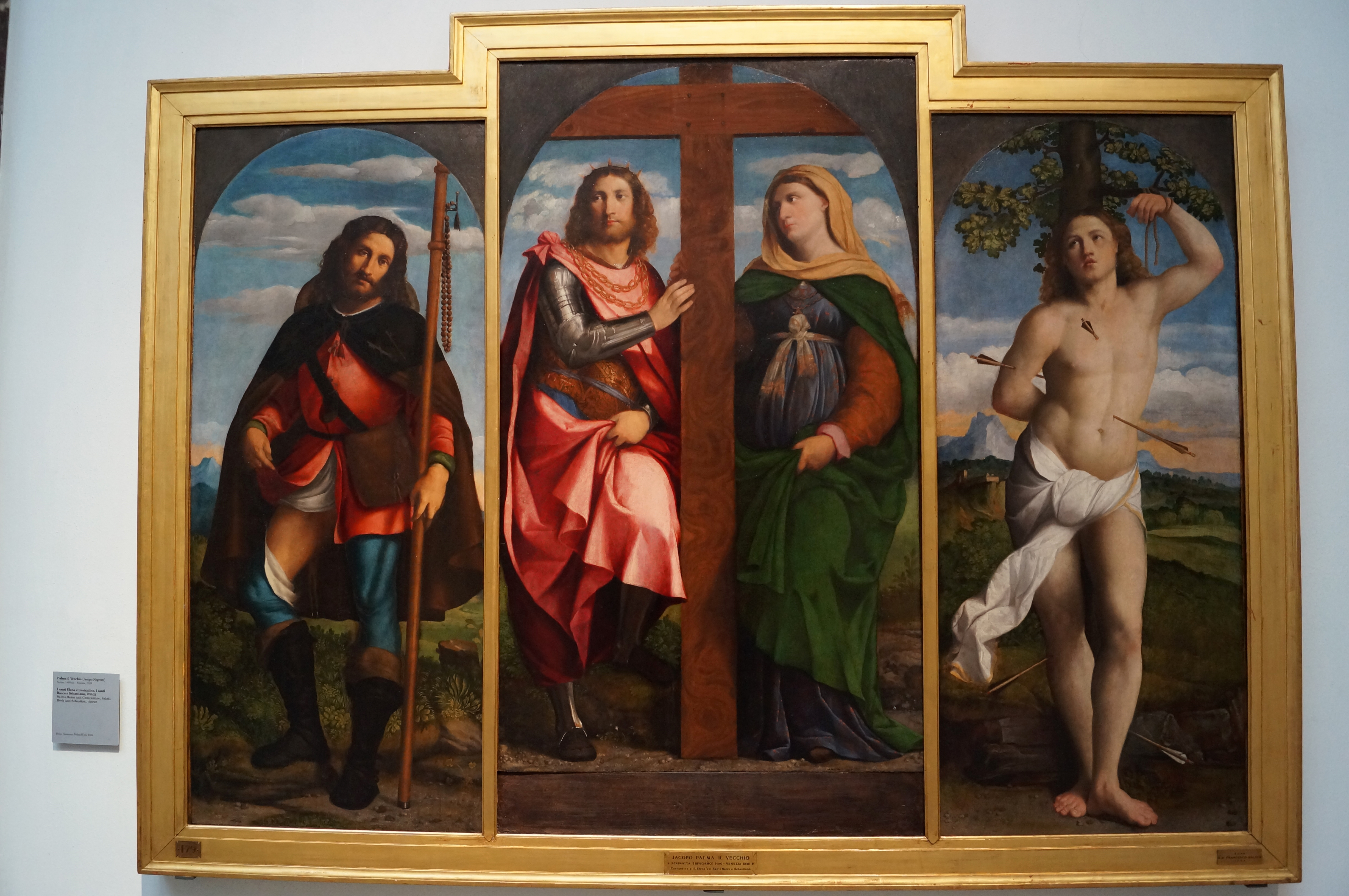 The subject here is a matter for debate. It may depict St Domitilla with St. Nereus and St. Achilleus if it is linked to the transfer of the three saint’s relics to Santa Maria in Vallicella in Rome in 1597 (but the men have neither armor nor haloes), St. Constance with St. John and St. Paul (though here again the haloes are missing), or the Dispute of St. Catherine in that the saint is shown between two philosophers counting, a gesture traditionally associated with her.