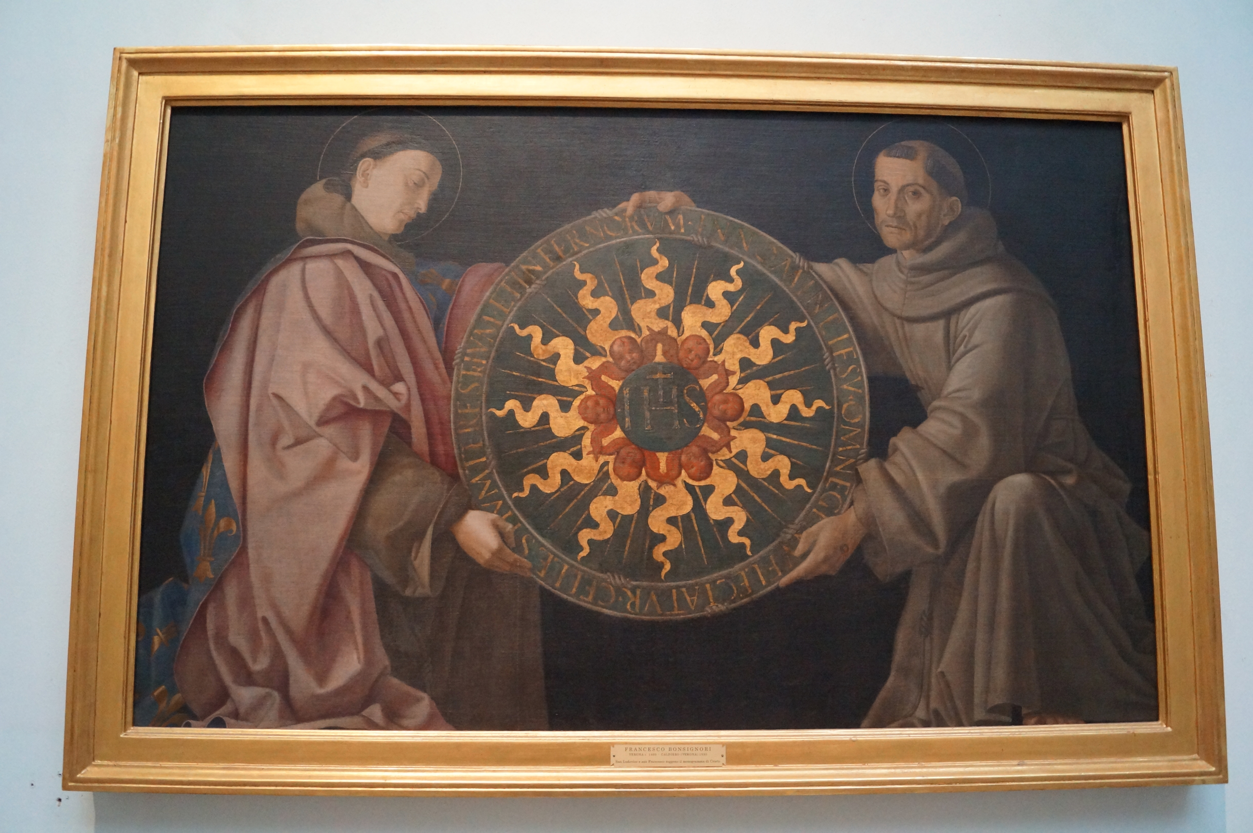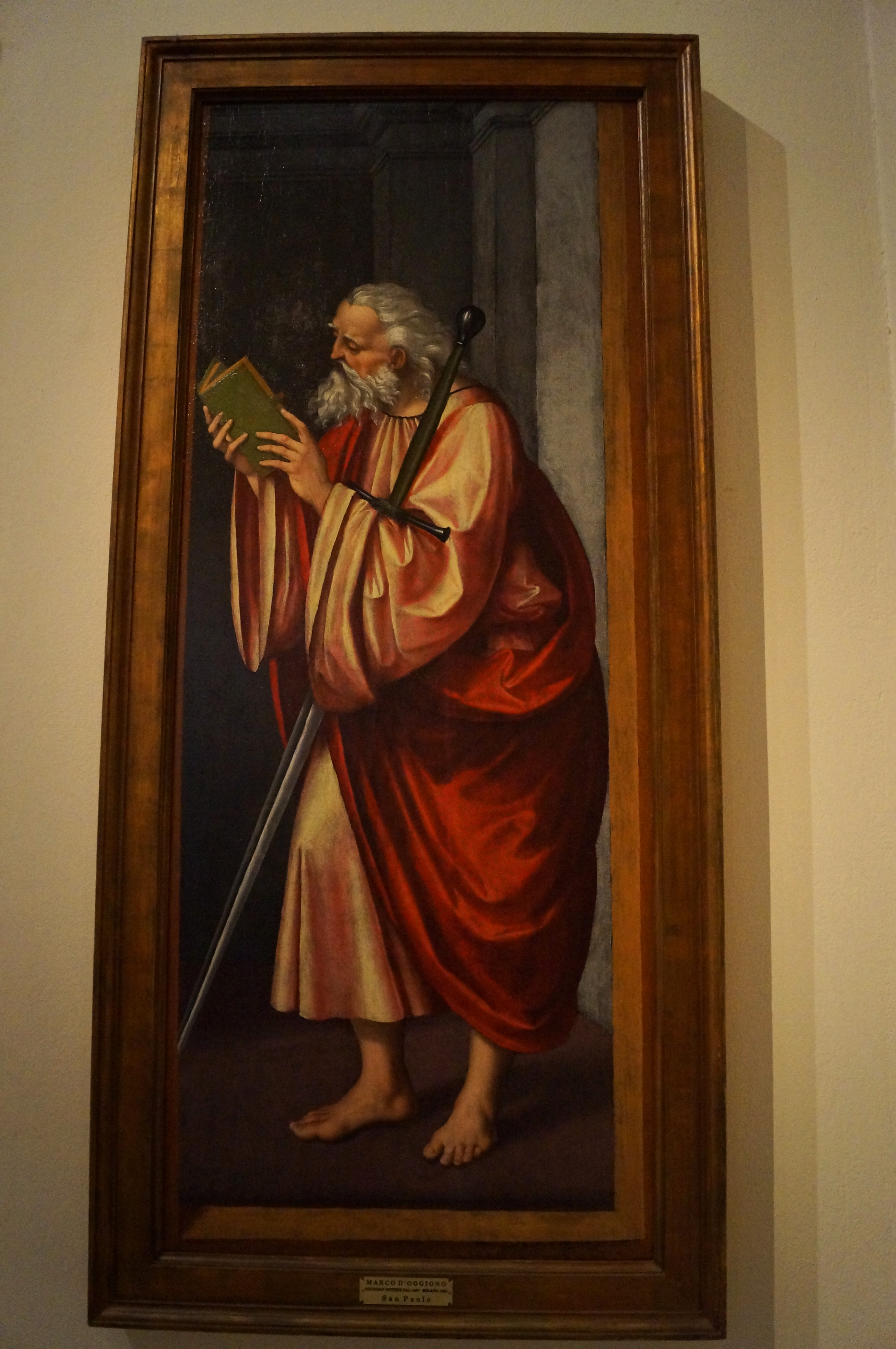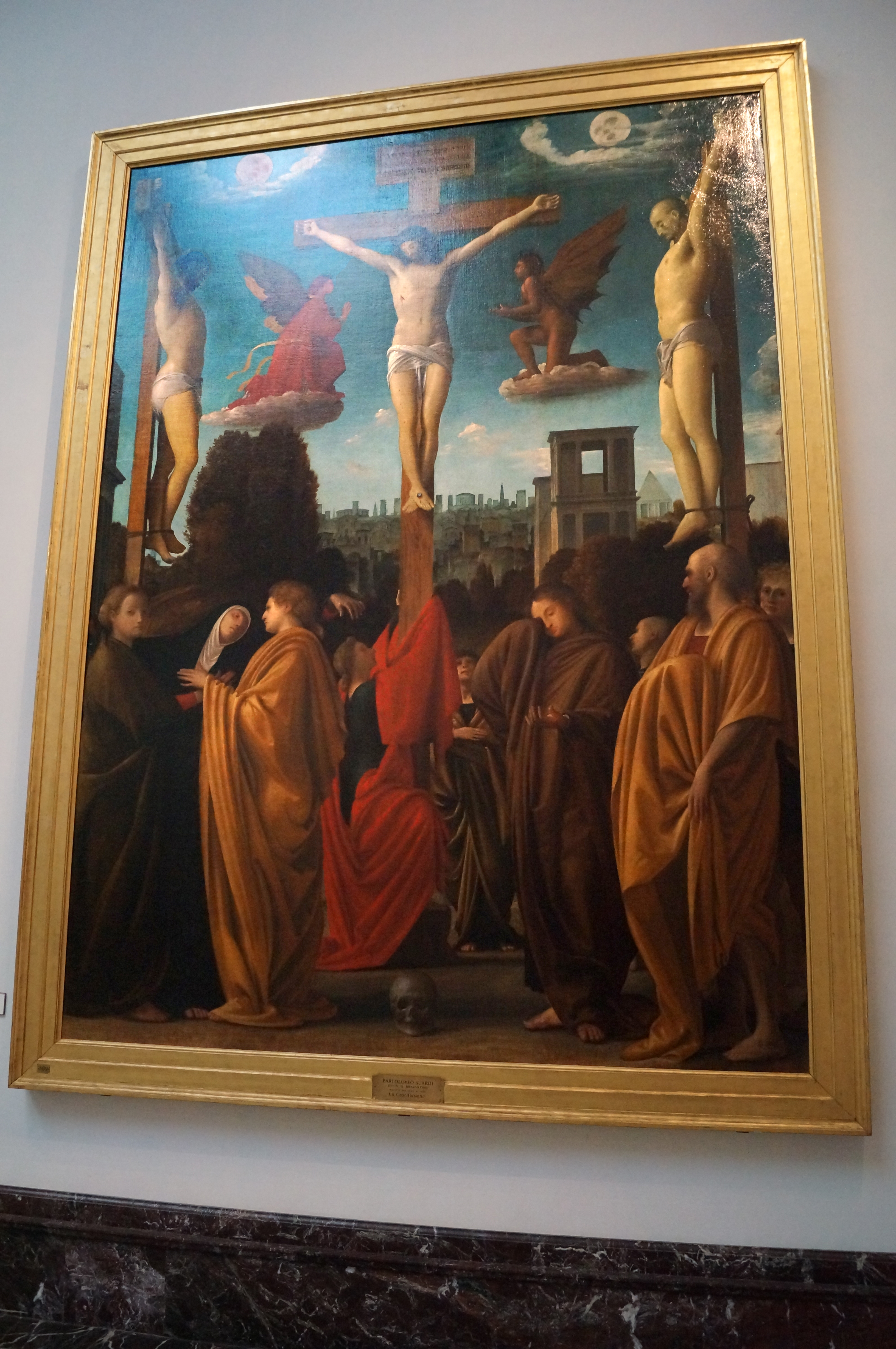 Il Bergognone was a painter from Fossano, a small village in southern Piedmont, active in Milan from 1472. Bergognone was very prolific, and his work can still be seen in several churches nearby, including San Simpliciano, although his best work is at the Certosa di Pavia. This fresco is much older fresco than his other frescoes in the Brera’s collections. When it was removed and transferred to canvas, it lost the image of God the Father at the top.