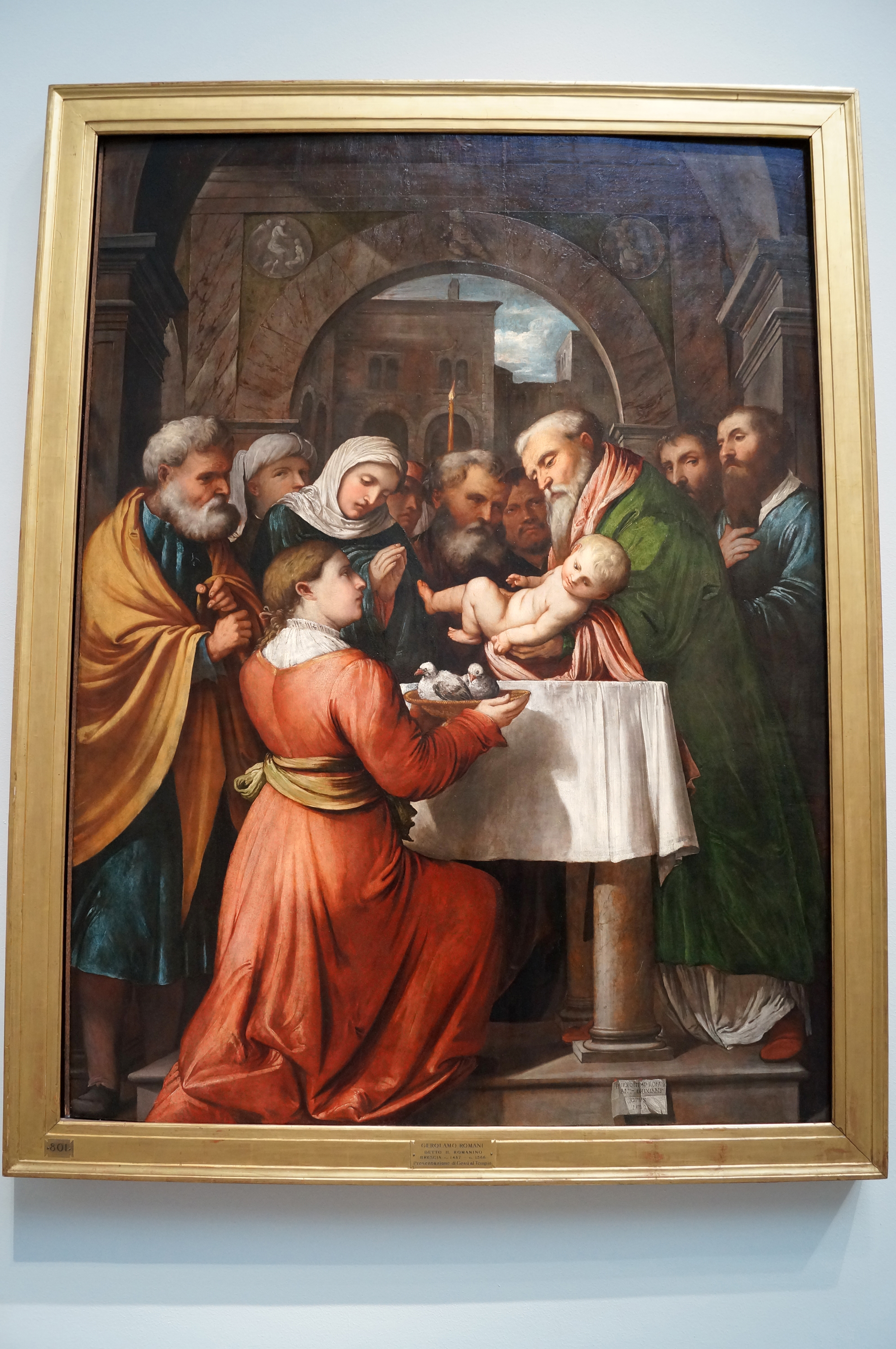 This altarpiece, whose original location is unknown, is thought to be an early work by Gioacchino Assereto, painted at a time when he was very close to Cerano. Indeed their closeness has prompted scholars to surmise that Assereto may have spent time in Lombardy himself or else picked up the style from Bernardo Strozzi. The scene depicts the Presentation of Jesus in the Temple in Jerusalem, where every newborn child was brought by law to be offered to God along with two sacrificial turtle doves.