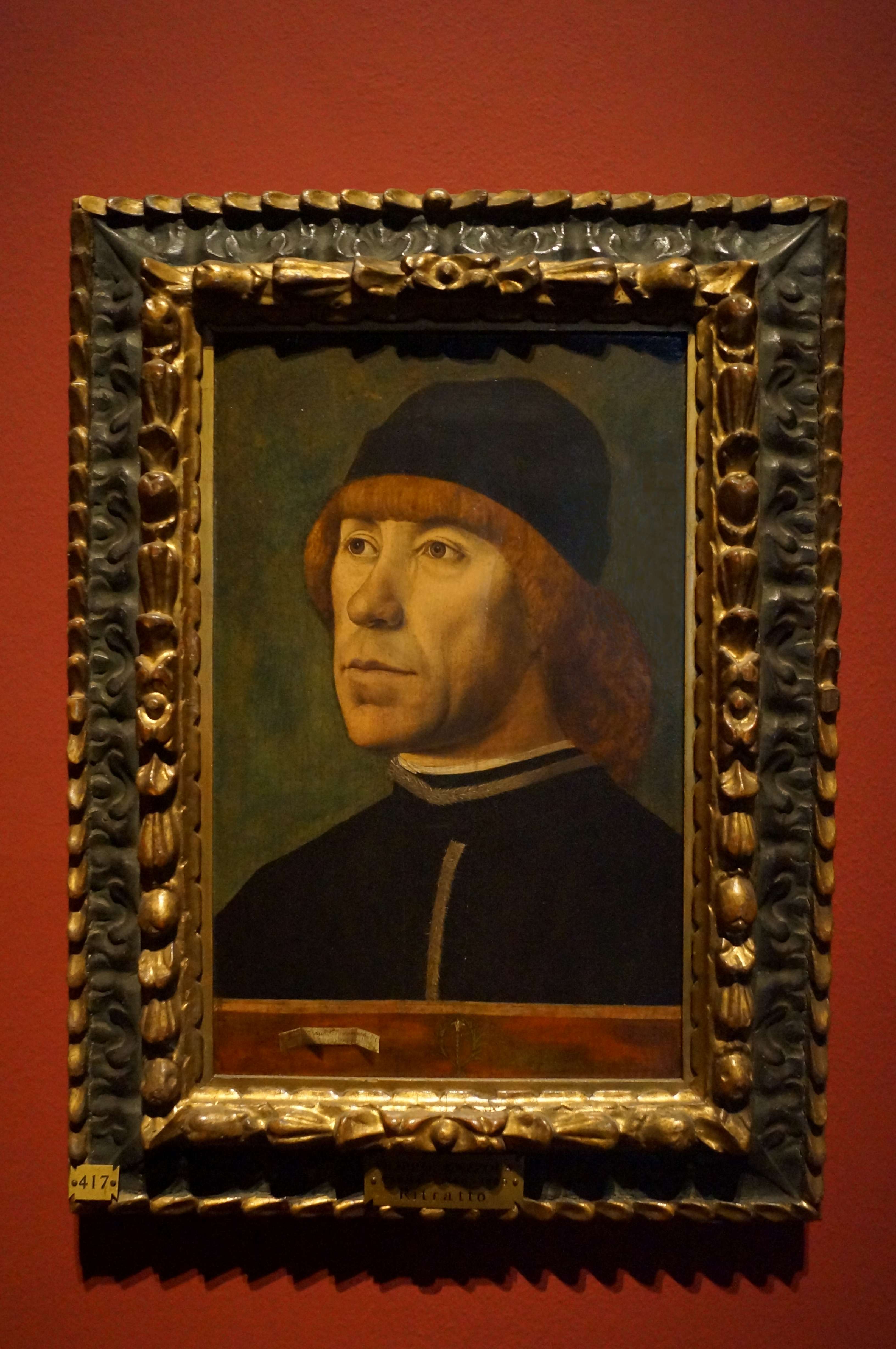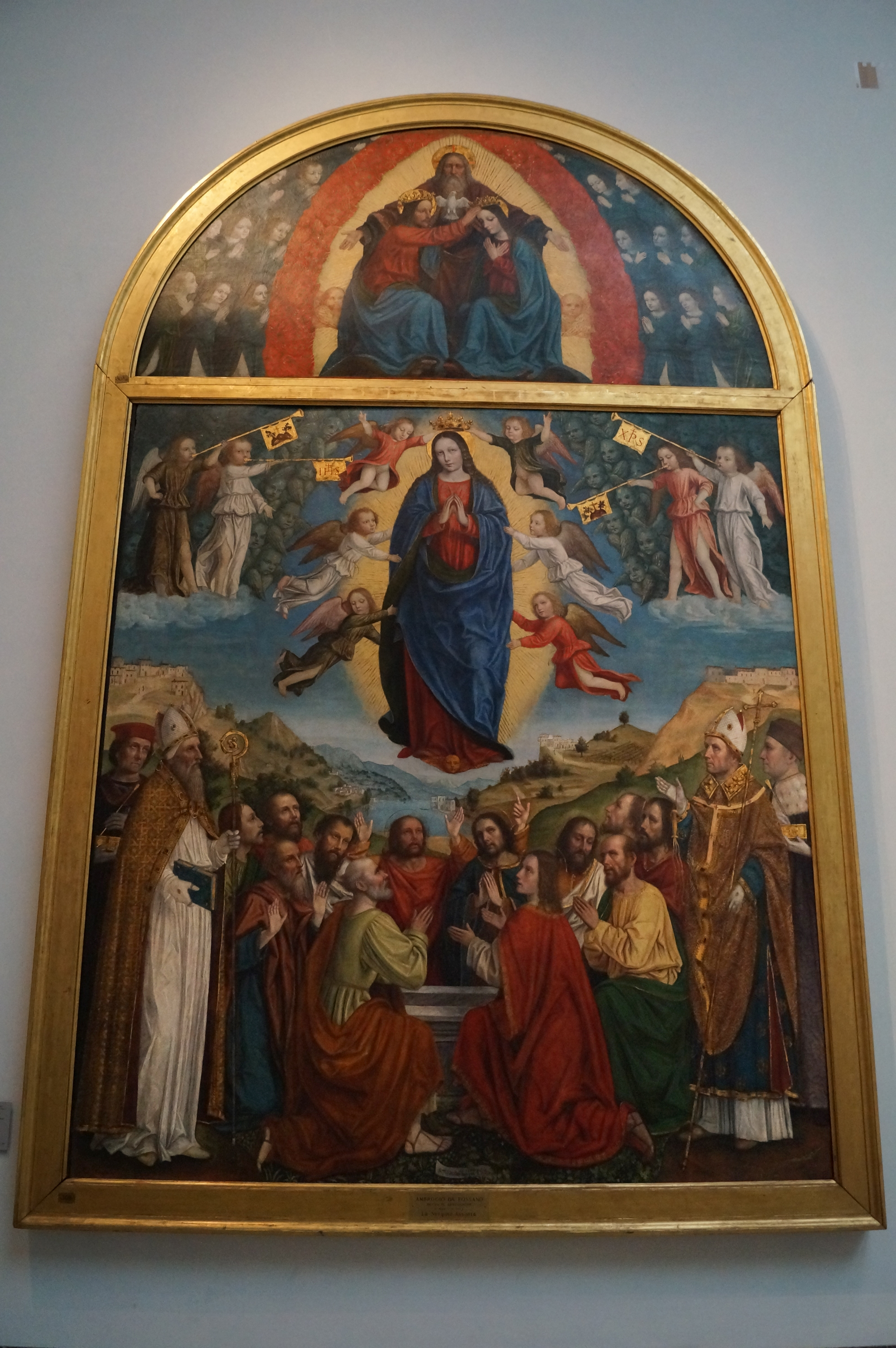 The Venetian artist Nicolò di Pietro is a characteristically late Gothic painter, which can be seen above all in the late Gothic architecture of the carved altarpiece. This panel shows the Coronation of the Virgin, with God the Father behind the couple, and, at the bottom, the figures of the donors. It is very naturalistic, and there is already a hint of portraiture in the donor figures, but it is still a naturalism of detail that does not combine into a single naturalistic image. the panel has a rich frame adorned with pinnacles and carvings. The small dimensions suggest a collocation in a minor altar, or to be used for private devotion. The can be dated around 1394-1404, and came to Pinacoteca as a donation from the Amici di Brera Association in memory of Fernanda Wittgens.