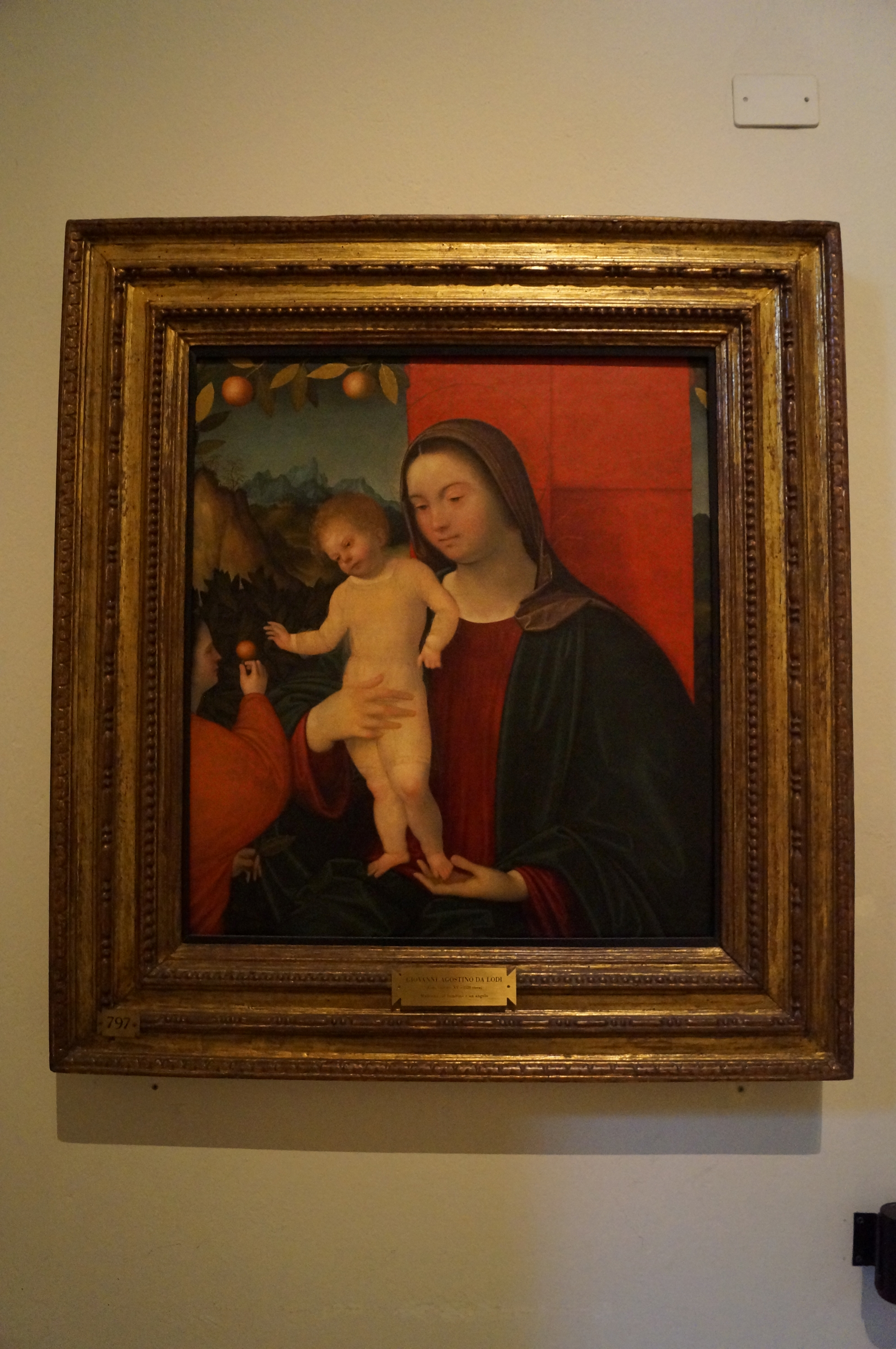 This panel was originally meant for private devotion. The child places his feet on a windowsill and holds a scroll on which is written Ego sum lux mundi (I am the light of the world). It is attributed to the Maestro di Pratovecchio, known for his careful figurative use of colour and light, very different from that of Filippo Lippi or Botticelli. Here we can see the development of Renaissance space, even if stylistically the artist has not completely embraced the Florentine innovations.