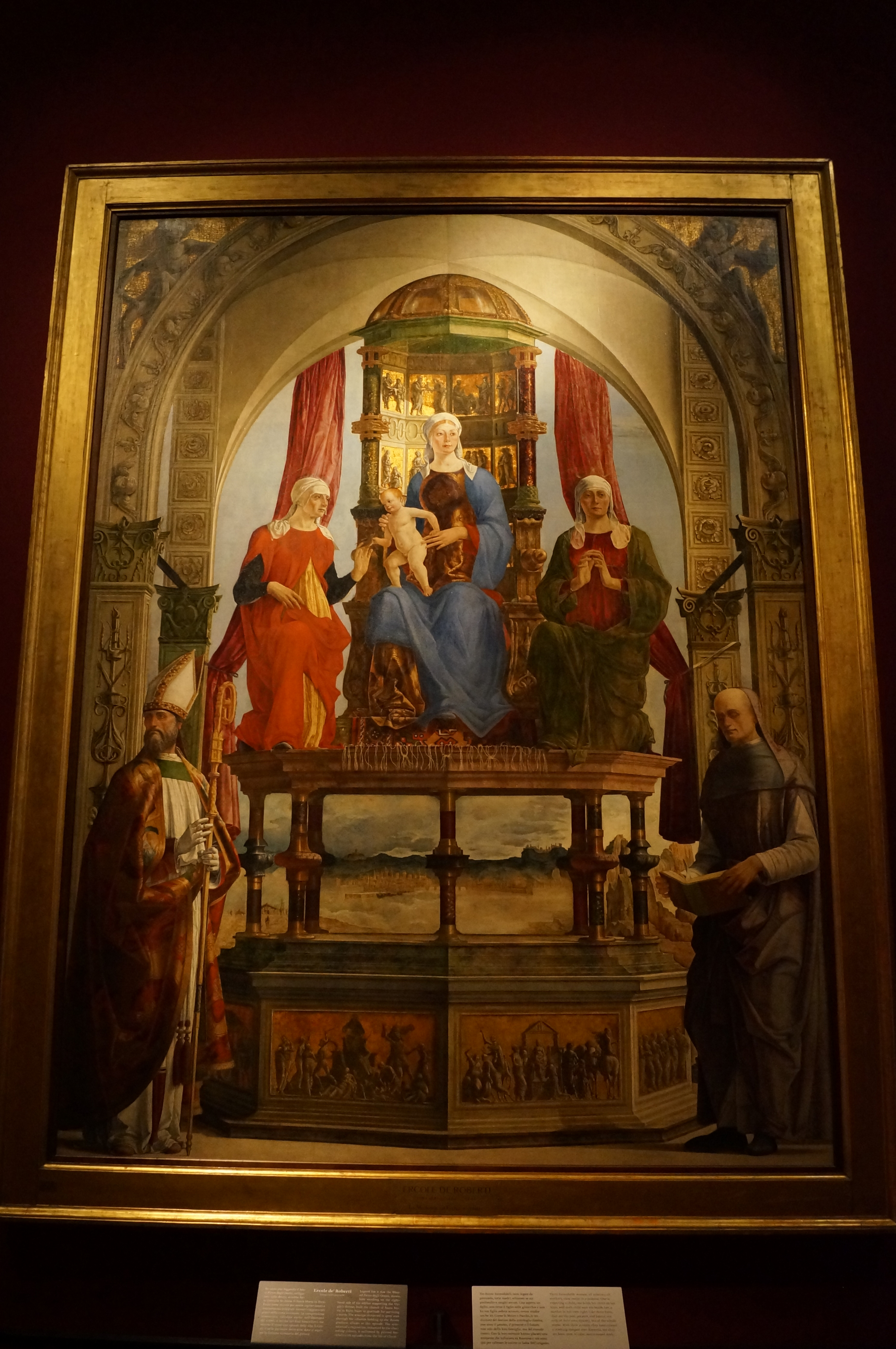 This is fully preserved Late Gothic polittico by Antonio Vivarini and his brother-in-law Giovanni d’Alemagna, who worked in Padua and the Veneto, and created for the Benedictine abbey of Praglia, shown by the saints Benedict and Scholastica that signal Benedictine devotion. It shows an increasing naturalism, and the Christ child has a three-dimensionality that suggests a Tuscan influence. The orange colour dominates, but this is actually the base over which was applied the original gold.