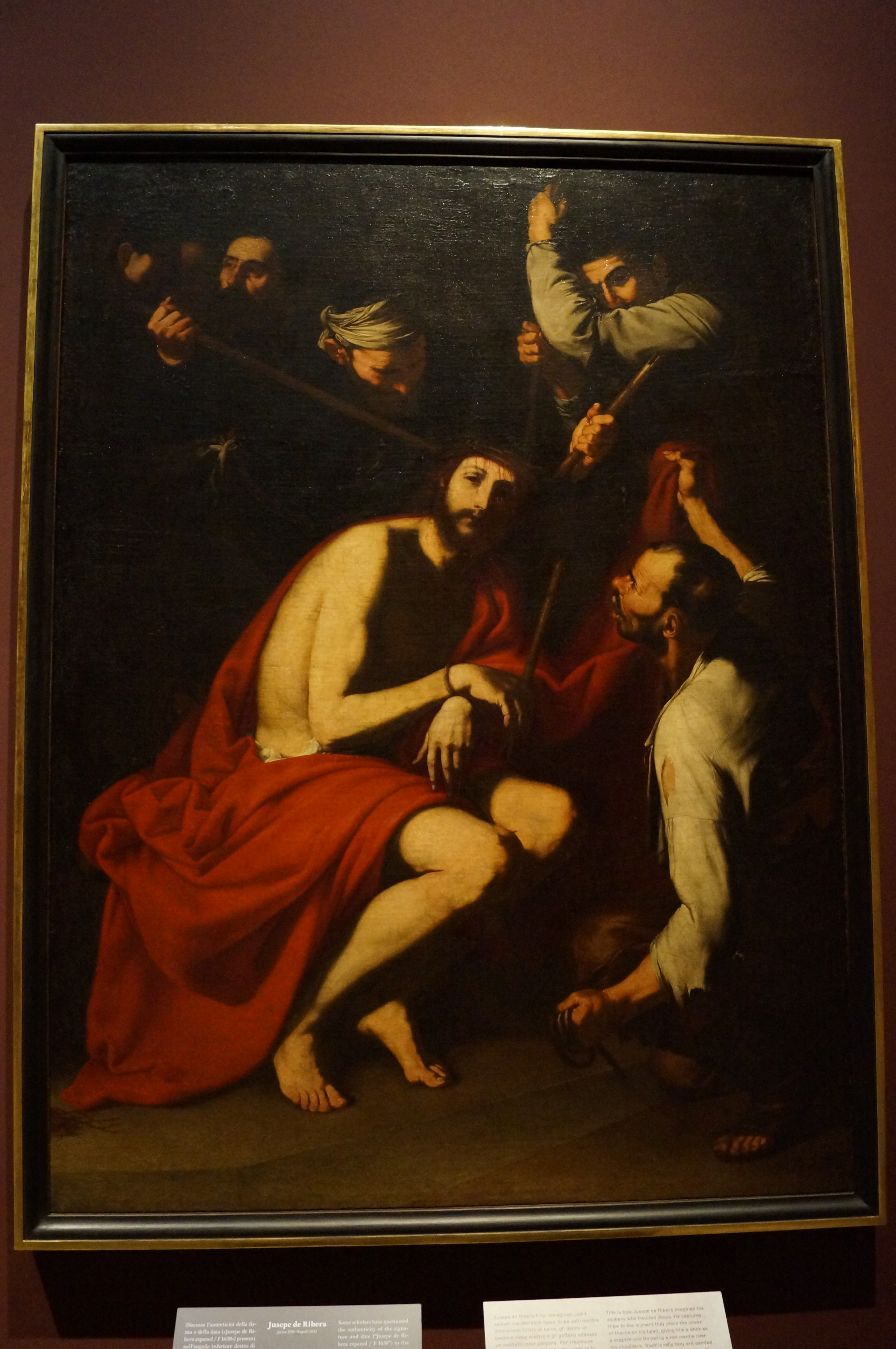 Some scholars have questioned the authenticity of the signature and date (“Jusepe de Ribera espanol / F 1638”) in the bottom right-hand corner of the painting, which may be a workshop copy of a lost original. Ribera, also known by the nickname of Spagnoletto, moved to Naples in 1616, becoming one of the city’s Caravaggesque artists most loyal to the master’s naturalism.