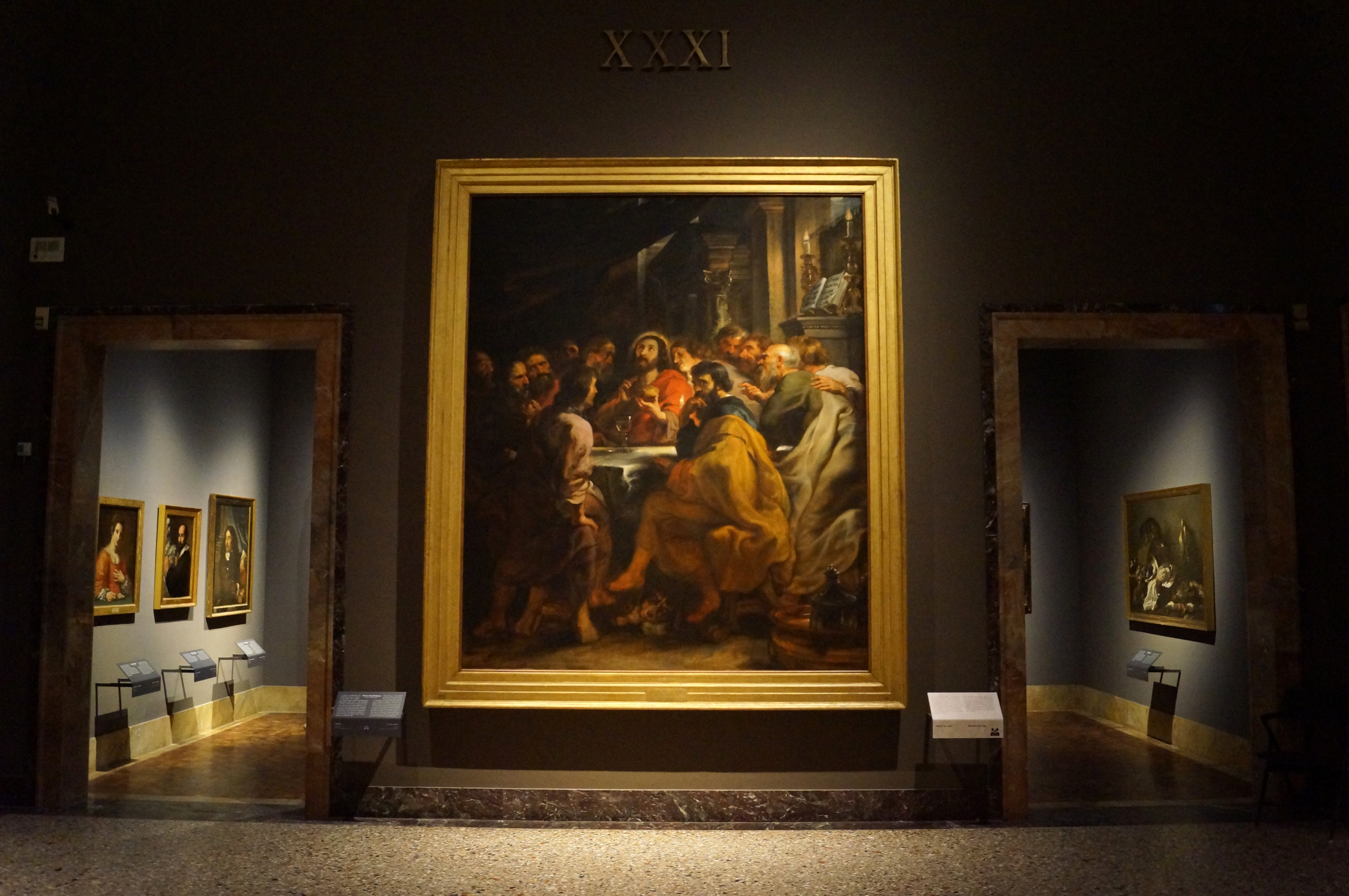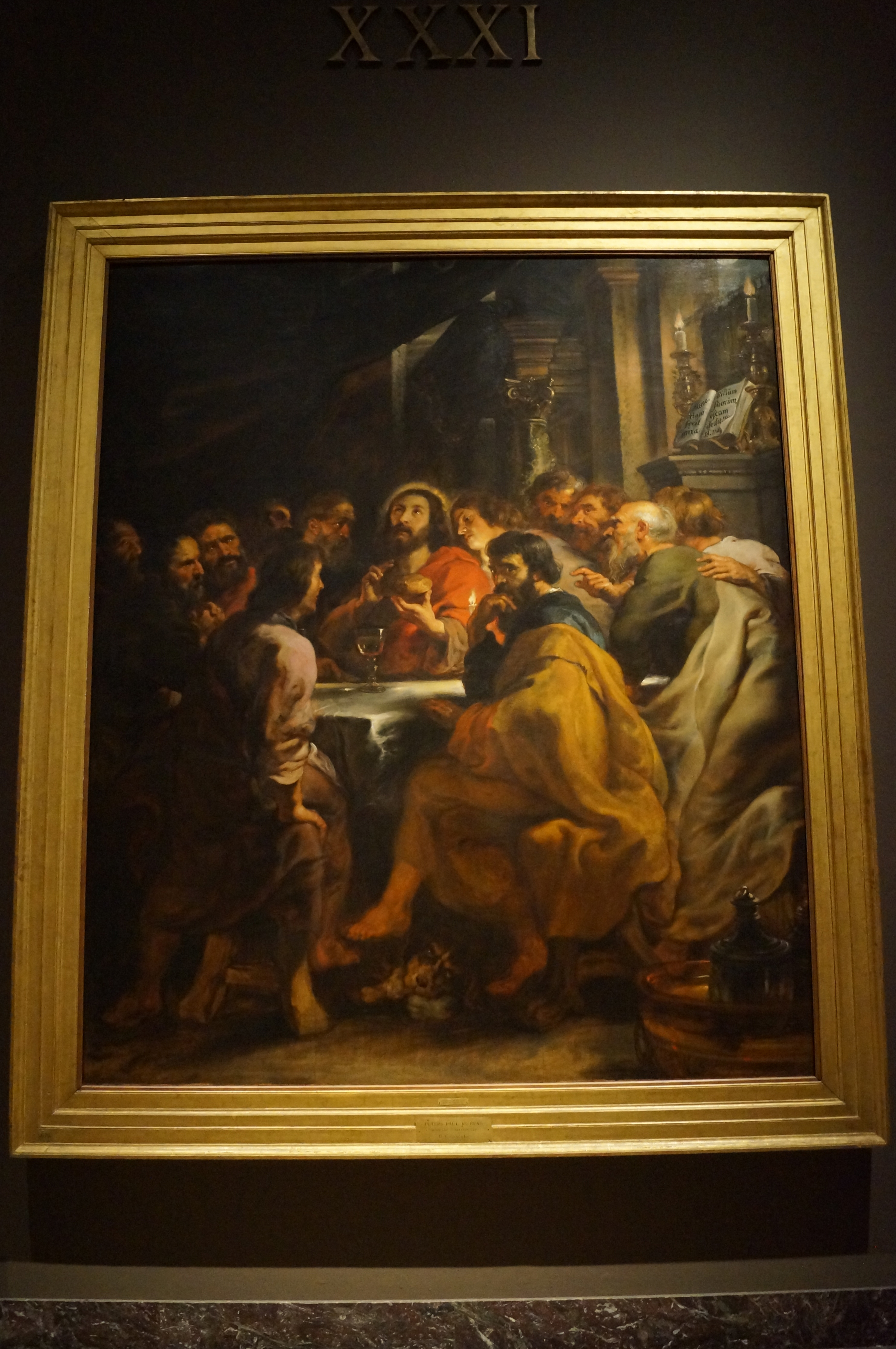 It was one of the five Flemish paintings sent to Brera in 1813 in exchange for several works taken from Milan by Napoleon, and comes from the chapel of the Santissimo Sacramento in the church of St. Romuald at Malines, for which it was commissioned by Catherine Lescuyer to commemorate the death of her father. Executed between 1630 and 1632, it was completed by two predellas with scenes from the Passion of Christ, currently in the Musée des Beaux- Arts in Dijon. The work, like many others from the late production of Rubens, was executed with the help of assistants: it is painted in a warm and intense style, in which bold lines shape forms framed in a composition of majestic classical equilibrium. The influence of 16th-century Italian painting, especially that of the Veneto, is evident.