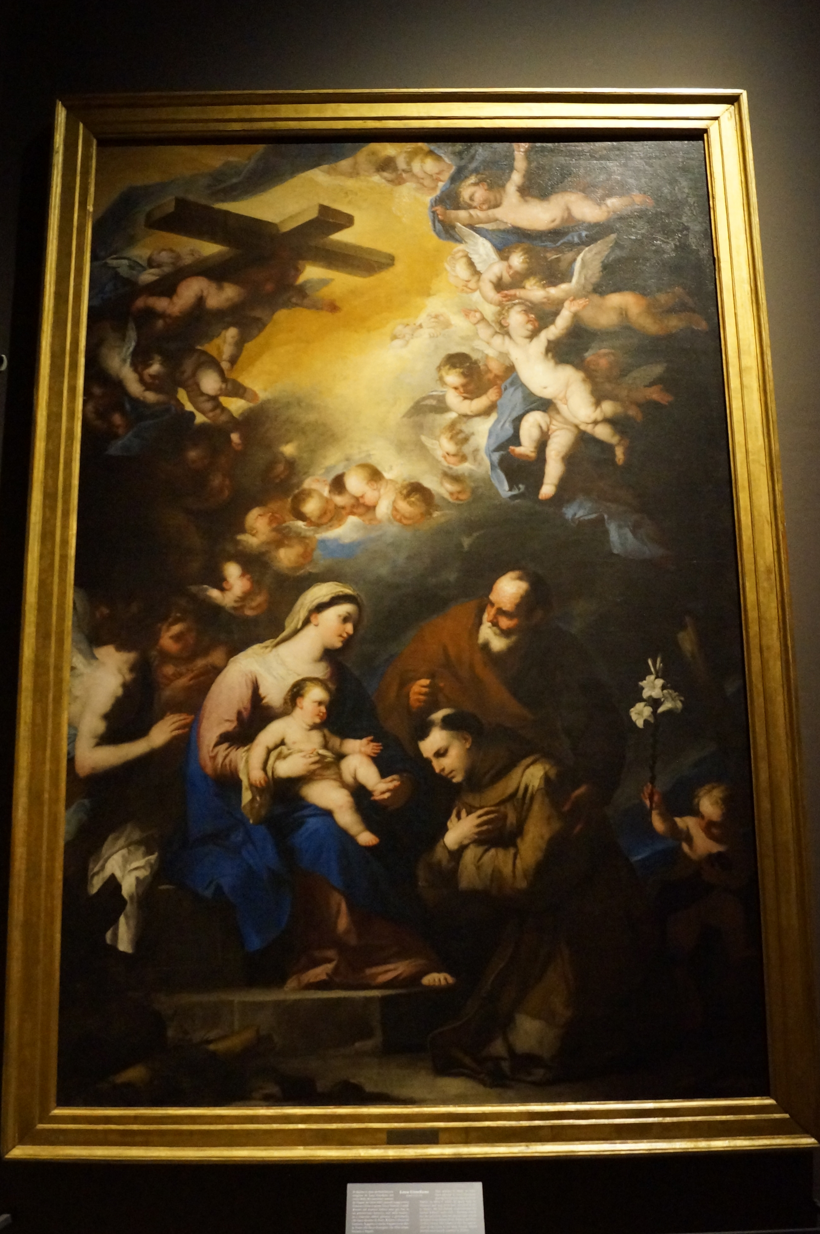This picture is likely to have been painted by Luca Giordano during his known absence from Naples in 1664–5, when he spent time in Florence and may even have travelled as far as Venice. He has already contaminated his master Ribera’s style with a Baroque search for the painterly and the picturesque which he learnt from Mattia Preti, Rubens and Pietro da Cortona. The subject is also the appearance of the Cross to the Holy Family, which proved enormously popular in Naples.