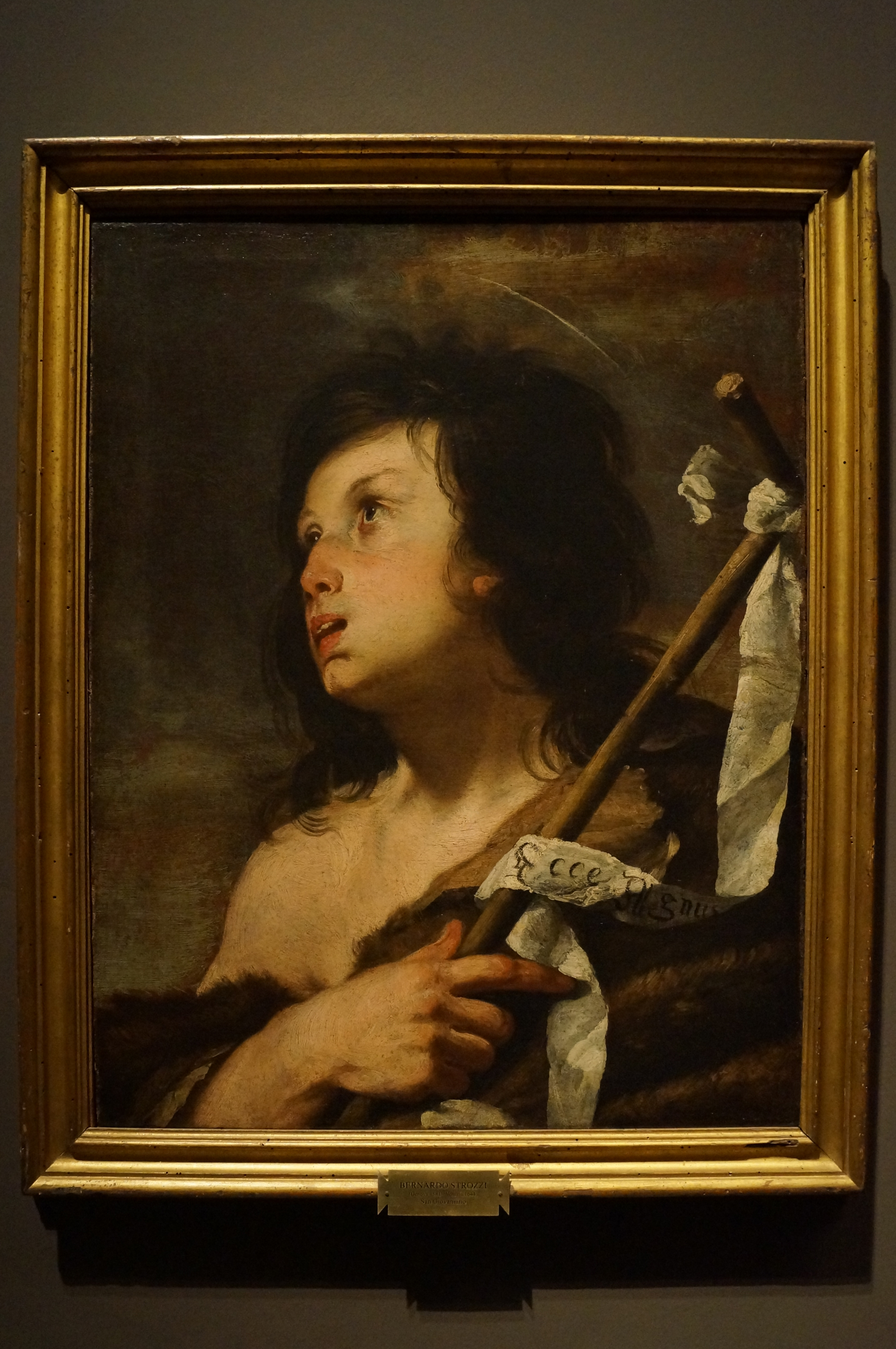 The exquisite quality of such details as the saint’s hand, his complexion, the scroll and the cross-shaped staff have persuaded scholars that this is an autograph work. The dark background, the saint’s hair and his camelskin all suggest that it was painted before Bernardo Strozzi moved to Venice and discovered the Venetian masters’ use of colour, thus it may be dated to some time between 1620 and 1625.