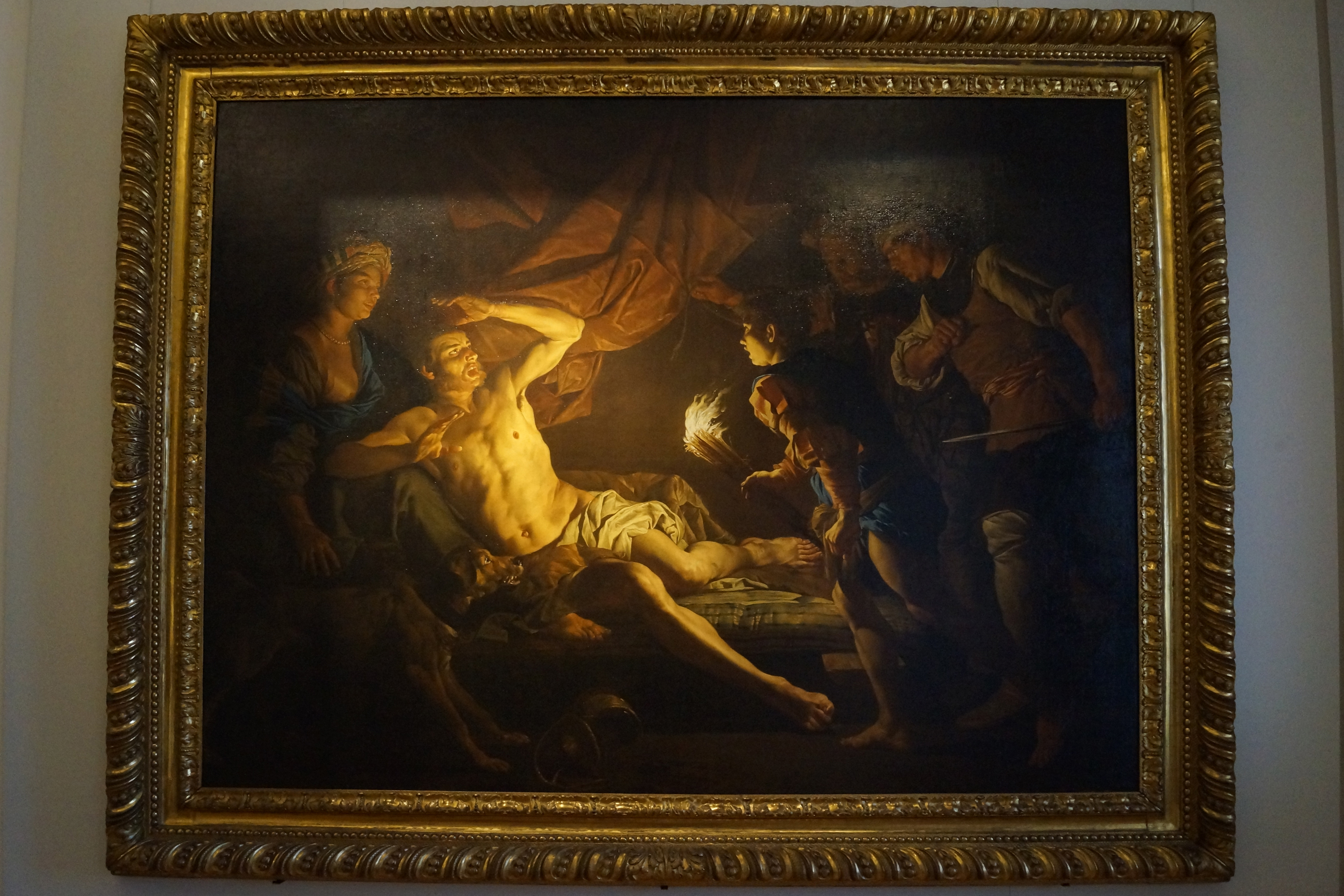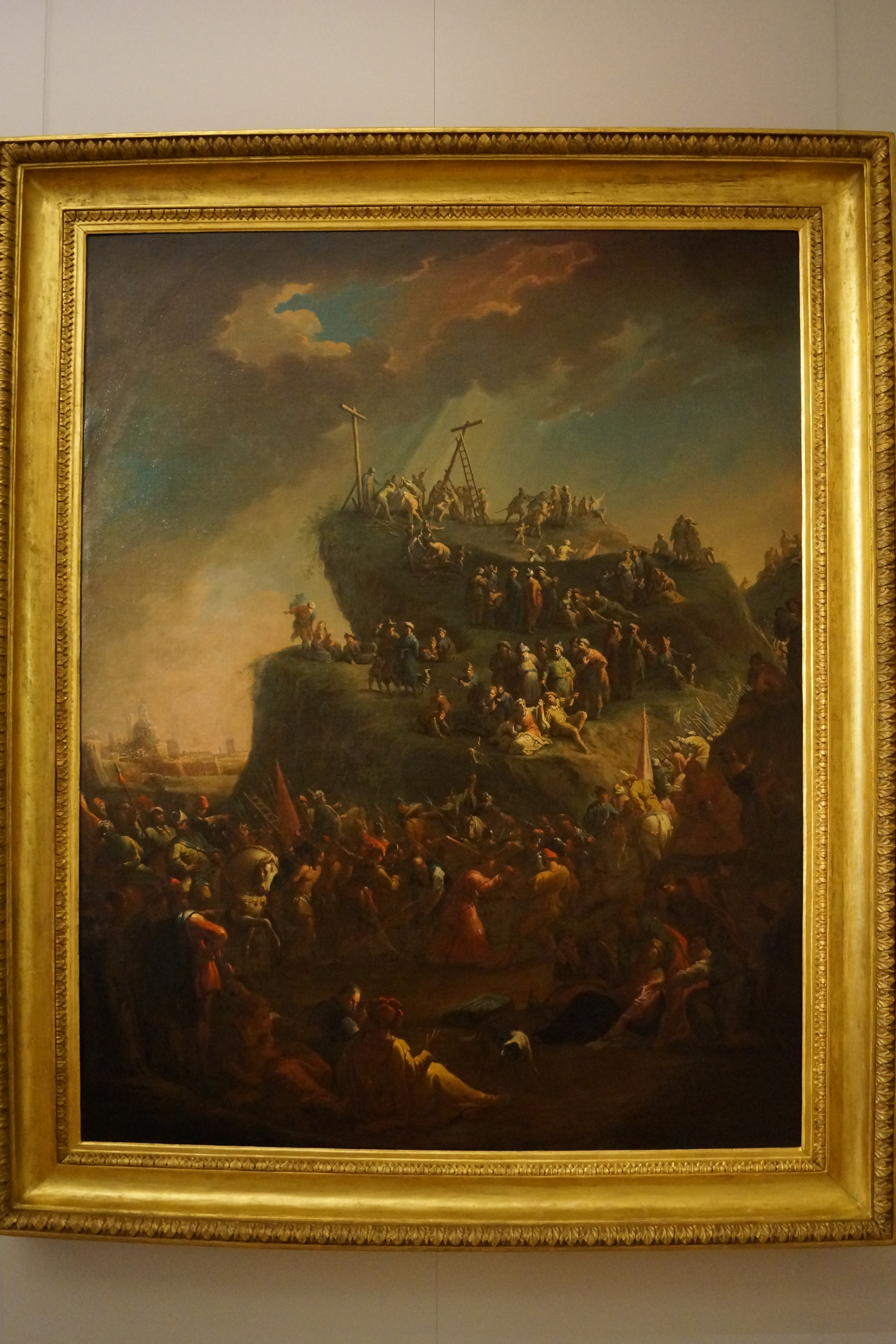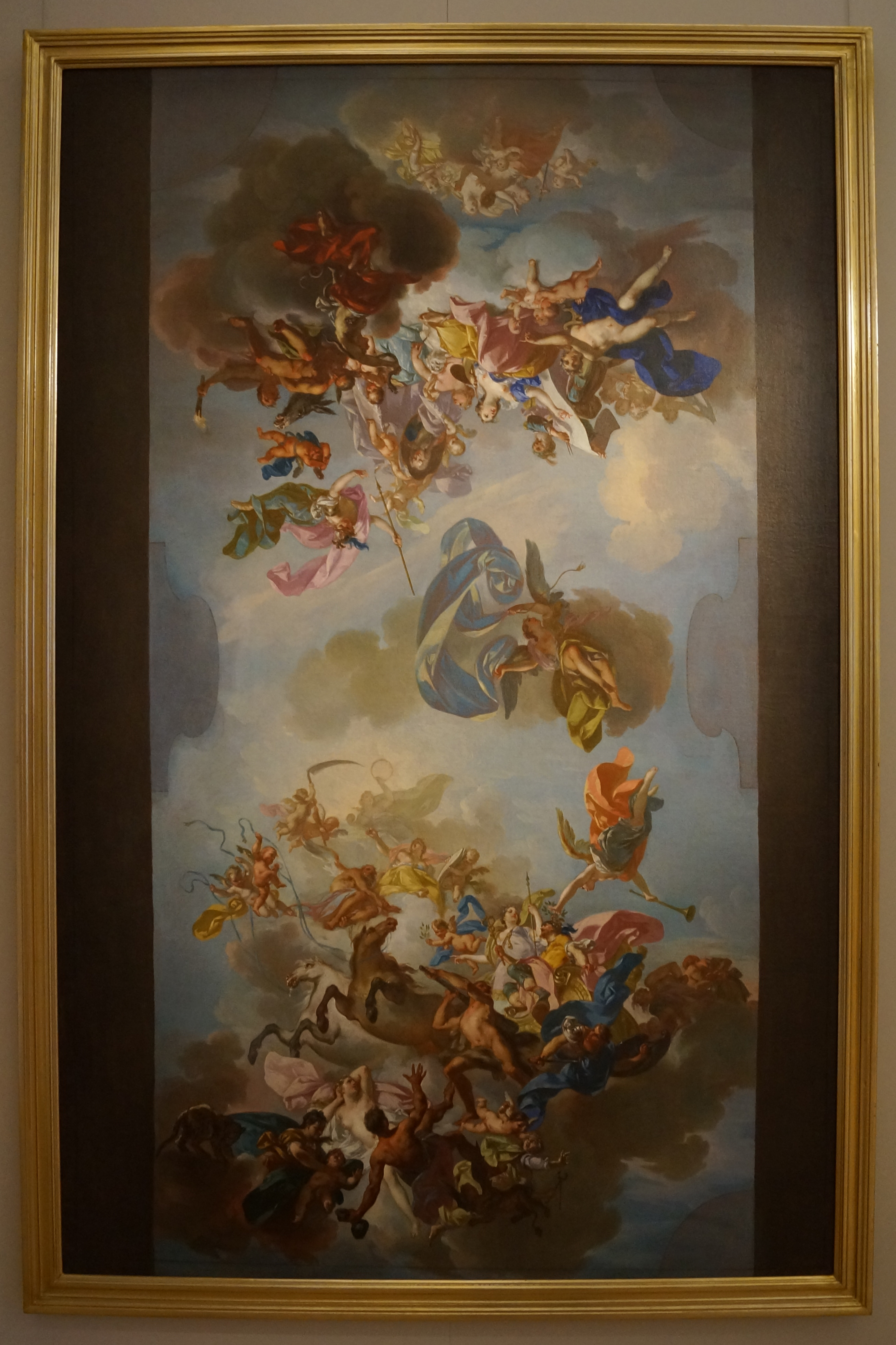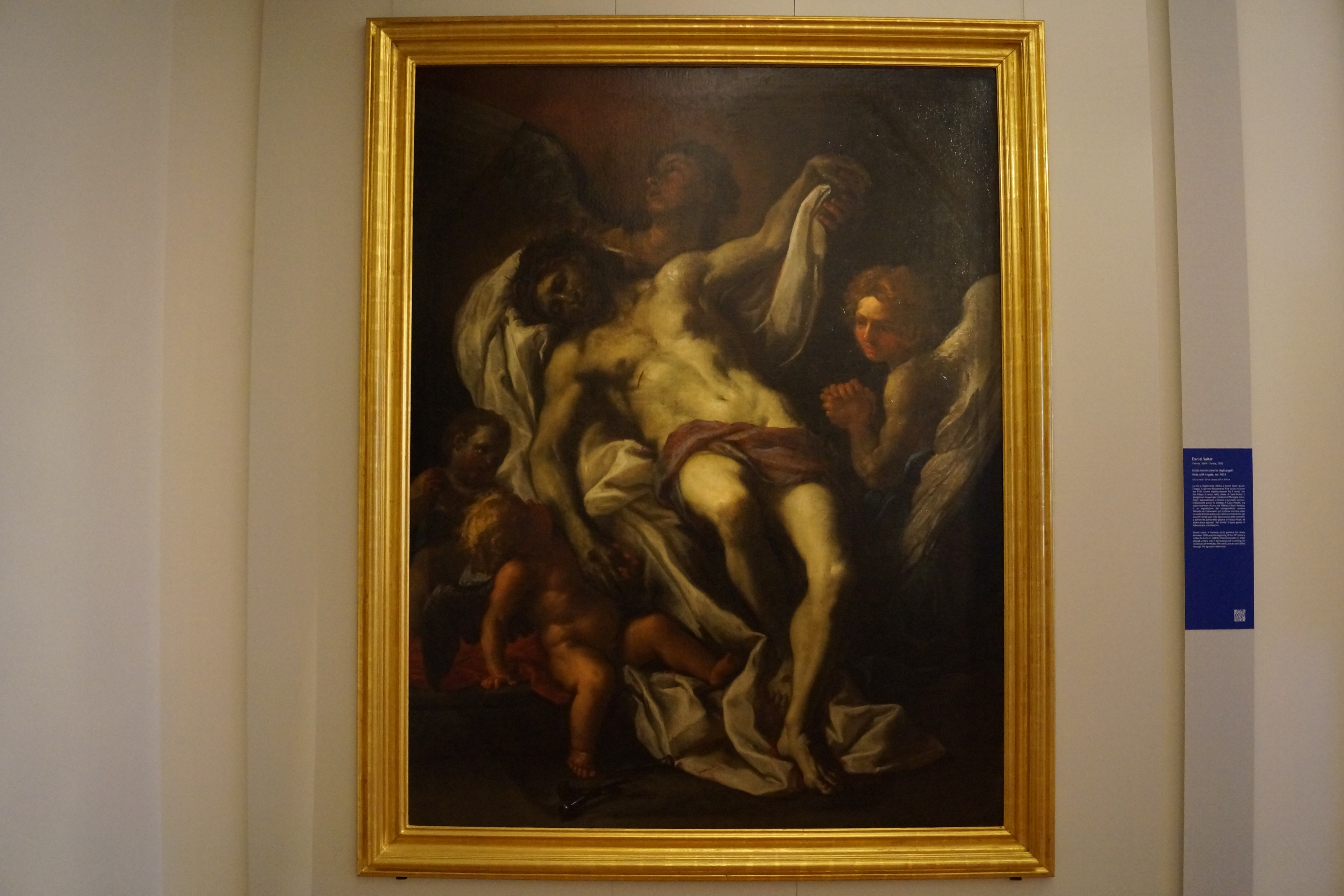 Картина, отмеченная монограммой "PDO" на фрагменте надгробной плиты, может быть датирована примерно 1740 годом. Первоначальная овальная форма, вероятно, подчеркивала интенсивный пафос и спиральный динамизм, который характеризует картину. Работа поступила в музей из династической коллекции.
