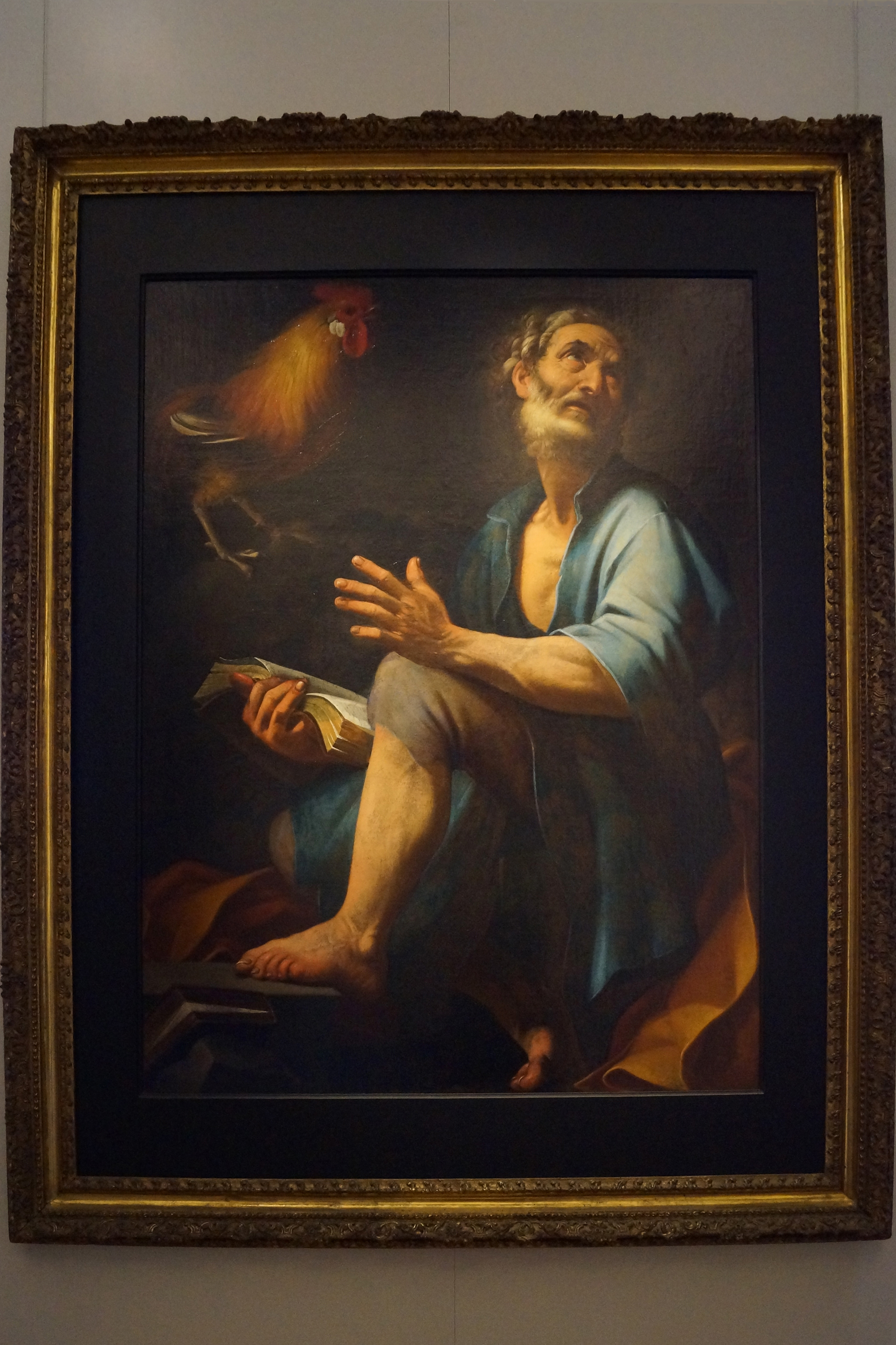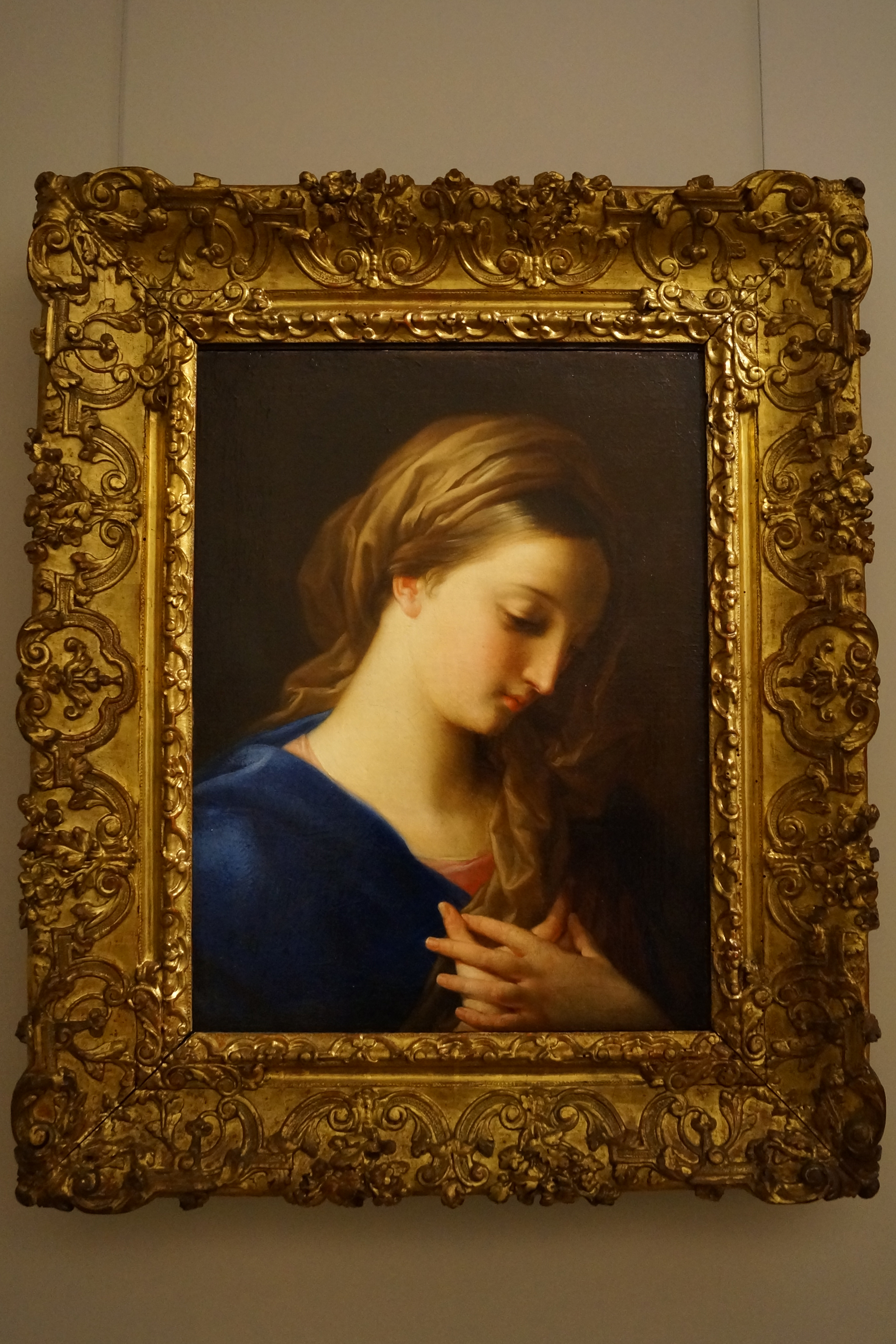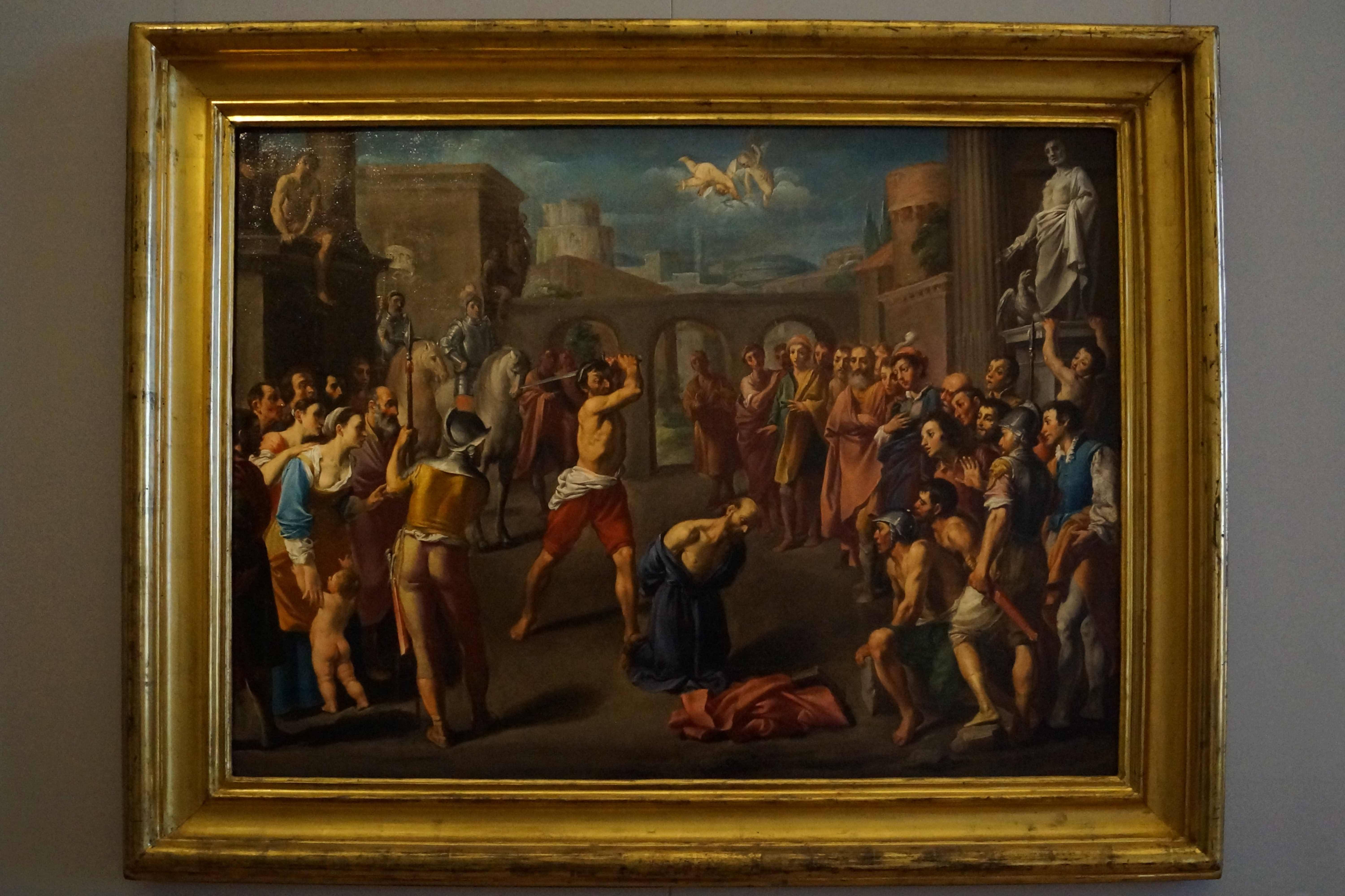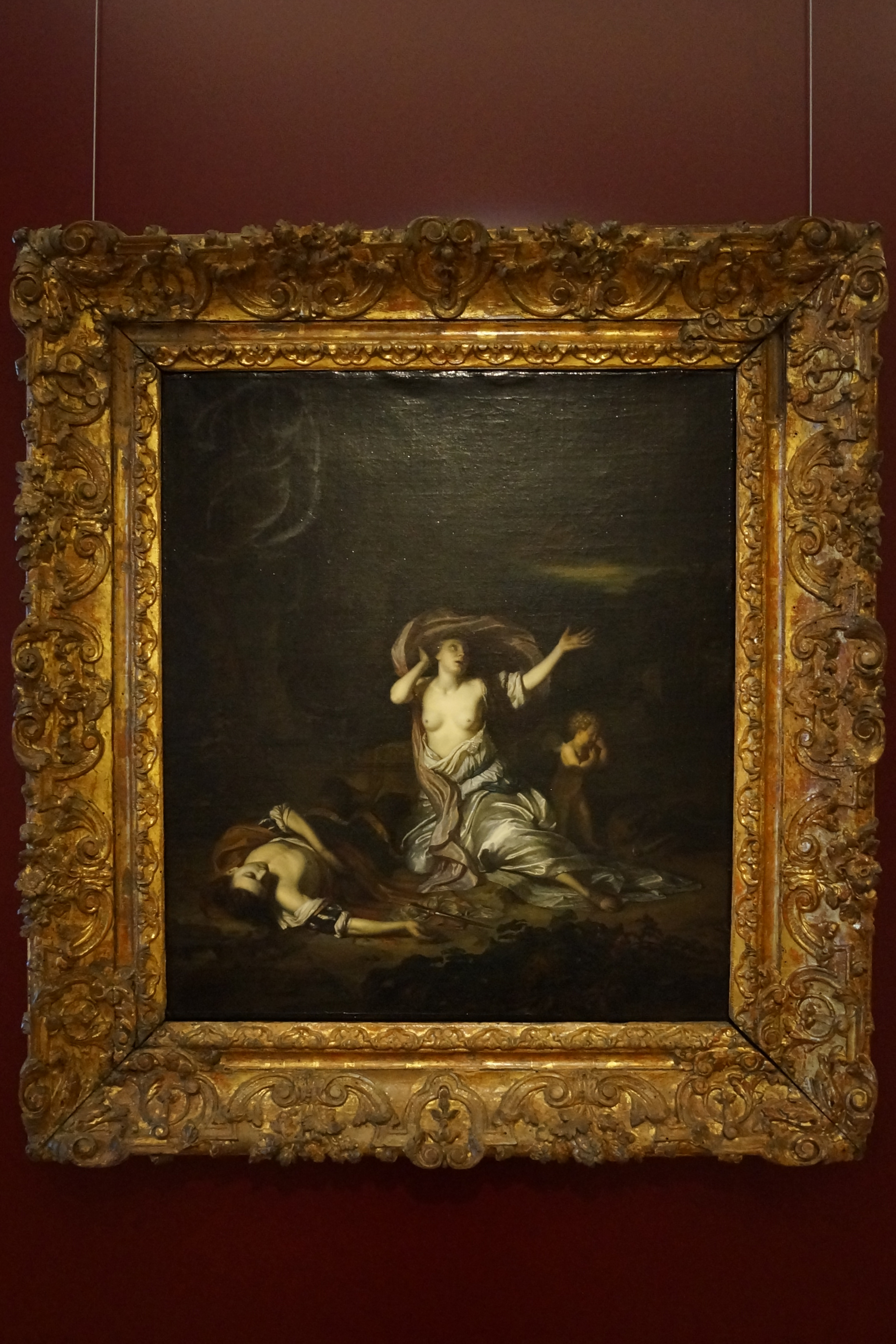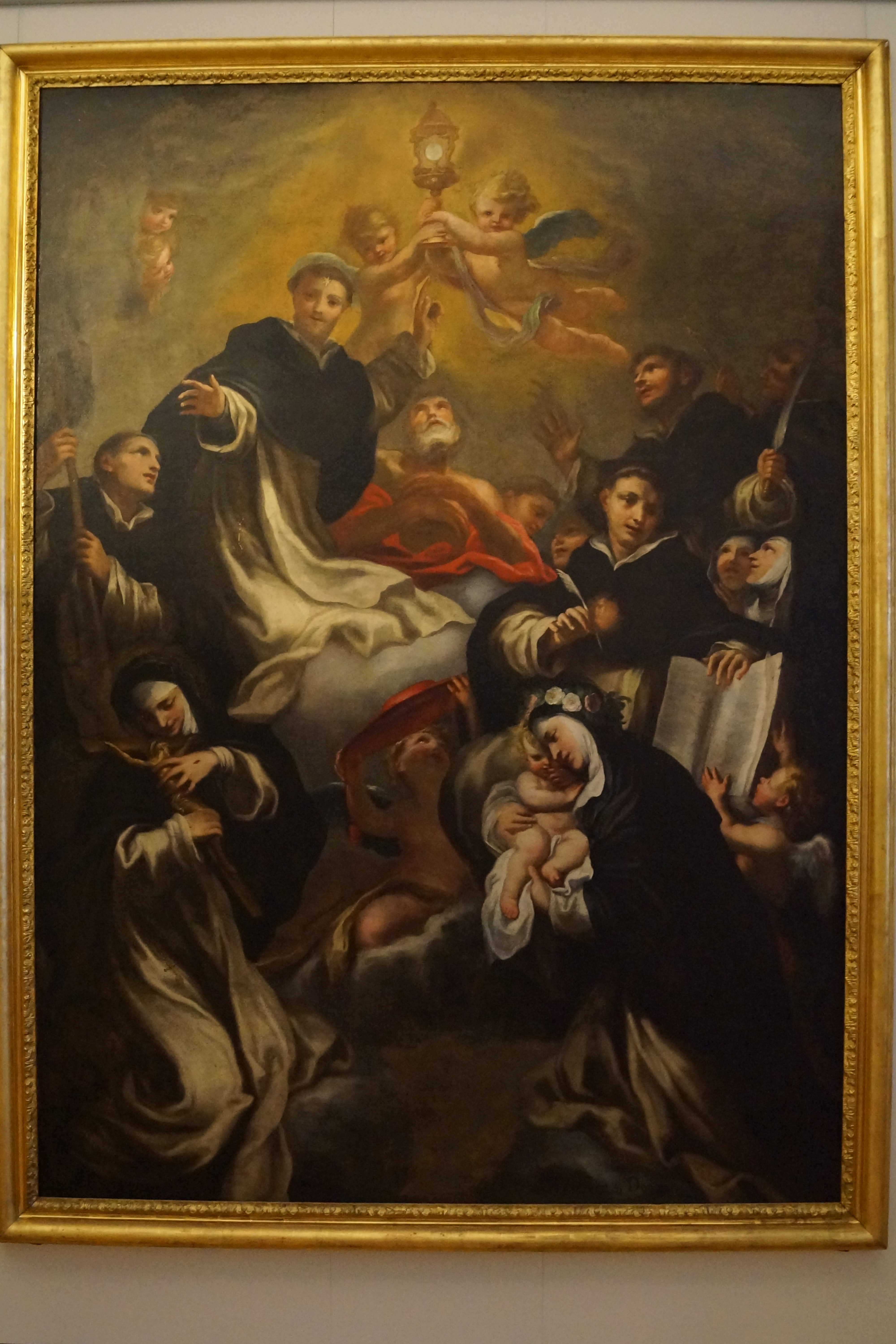 Картина, отмеченная монограммой "PDO" на фрагменте надгробной плиты, может быть датирована примерно 1740 годом. Первоначальная овальная форма, вероятно, подчеркивала интенсивный пафос и спиральный динамизм, который характеризует картину. Работа поступила в музей из династической коллекции.