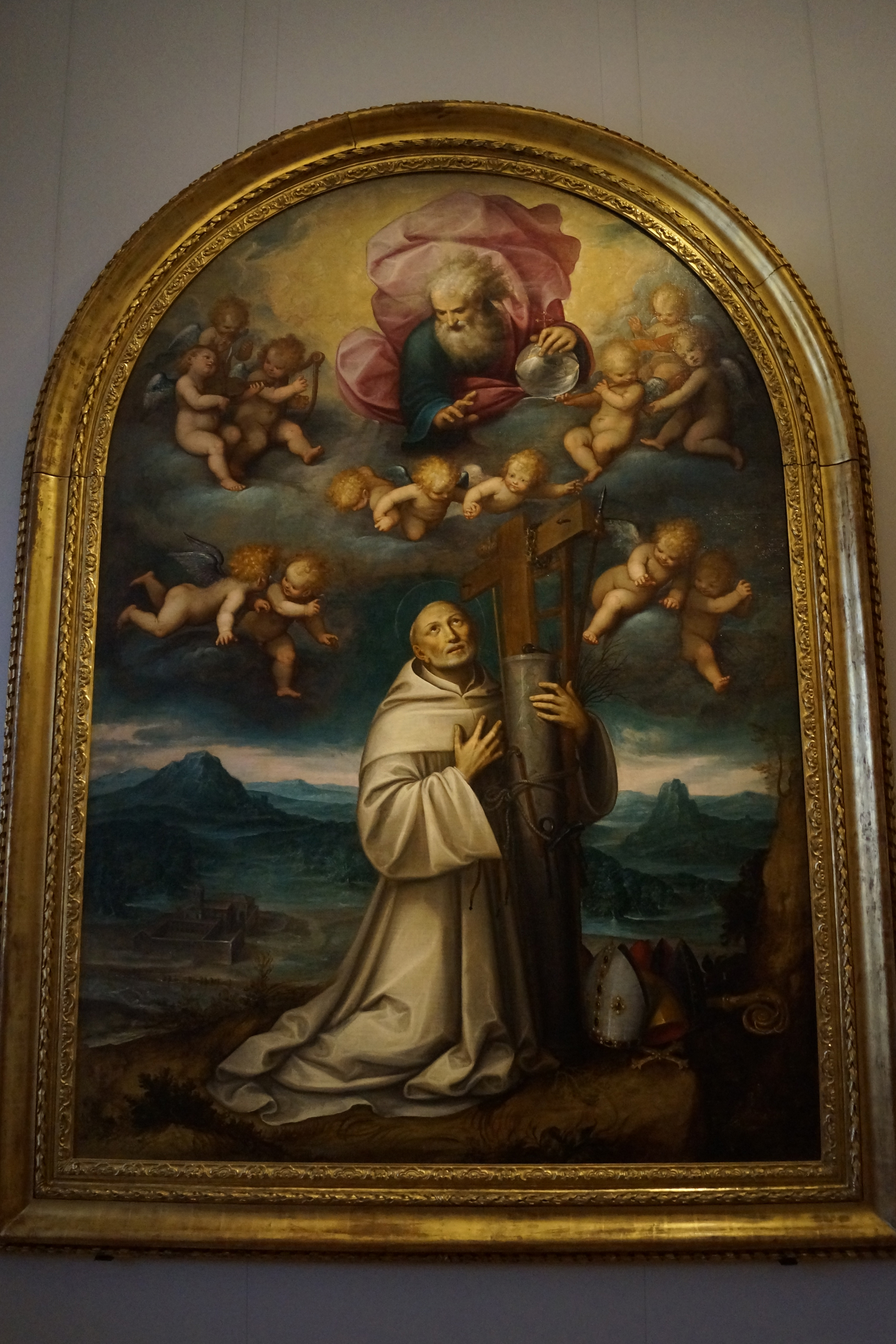 Панель "Богоматерь с младенцем, со святыми Иеронимом и Иоанном Крестителем на заднем плане" Джованни Мартино Спанцотти написал для частных молитв в конце своей карьеры около 1510 года. На переднем плане Мария с большой любовью и любовью сжимает Младенца, а на заднем плане, за пределами высокого парапета, мы видим фигуры Святых Иоанна Крестителя и Иеронима, которых часто считают образцами аскетической жизни.