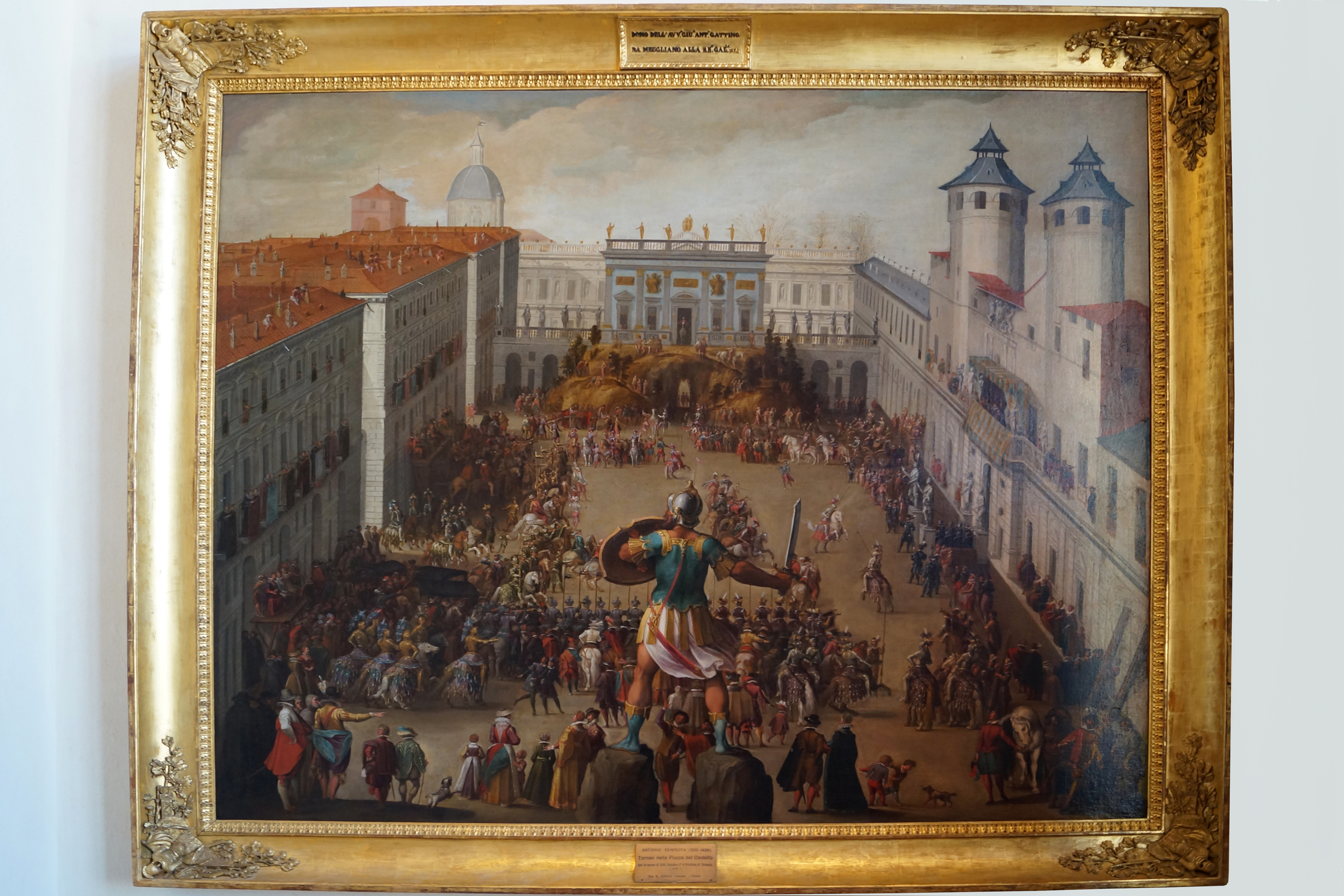 Панно c подписью художника было написано во втором десятилетии XVIII века. Некогда ошибочно истолкованное как аллегория осени, оно сочетает в себе дотошное изображение топографических особенностей с придворной атмосферой. Картина поступила из коллекции принца Евгения Савойского-Суассона, приобретенной в 1741 году Карлом Эммануилом III.