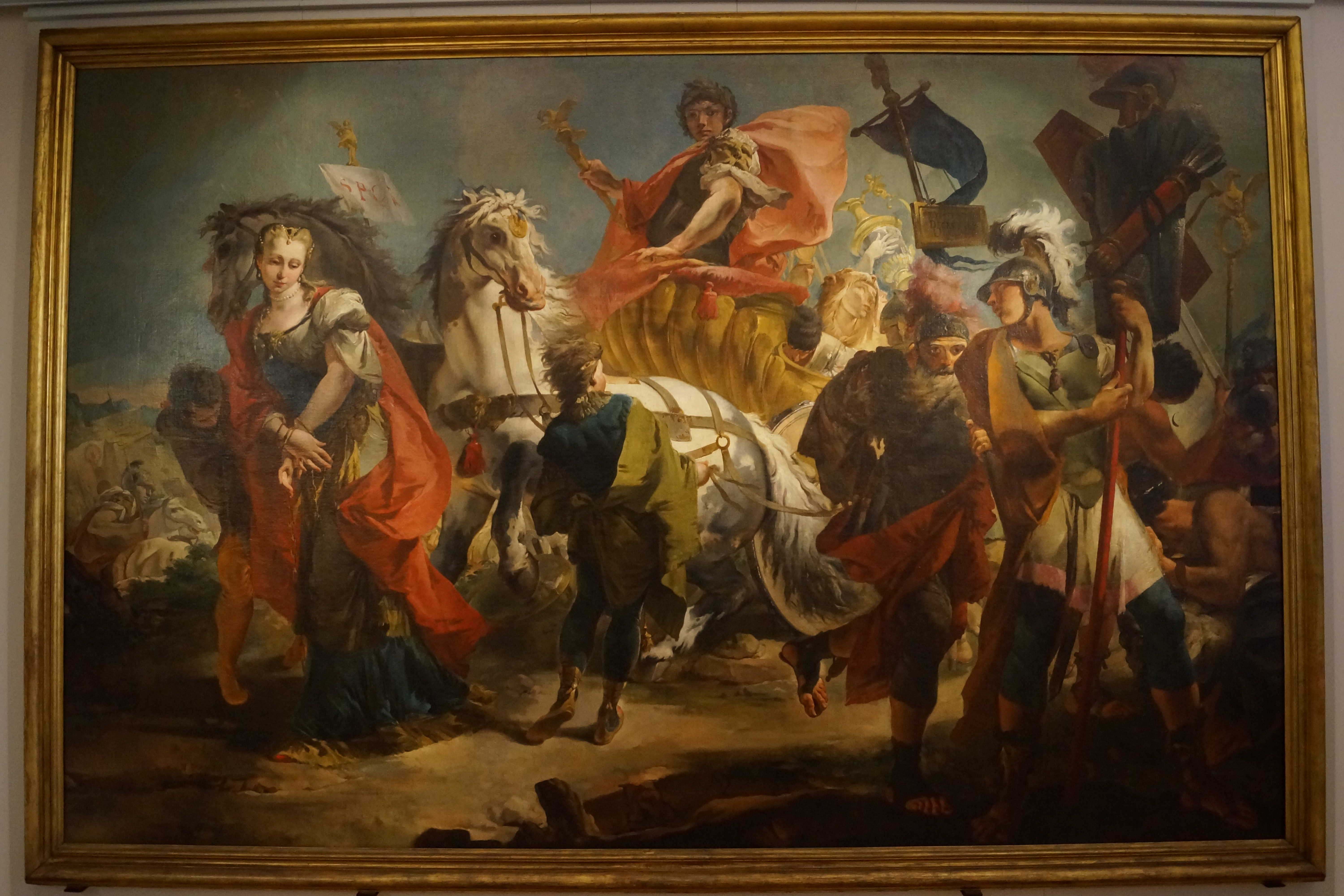 Работа является частью серии полотен, изображающих эпизоды из жизни королевы Зенобии в Палаццо Зенобио в Венеции. Он был закончен через несколько лет после свадьбы, состоявшейся в 1718 году между Альвизом Зенобио и Альбой Соранцо. Попав в римскую коллекцию кардинала Феша, он был завещан музею в 1869 году Кавальером Франческо Марсенго.