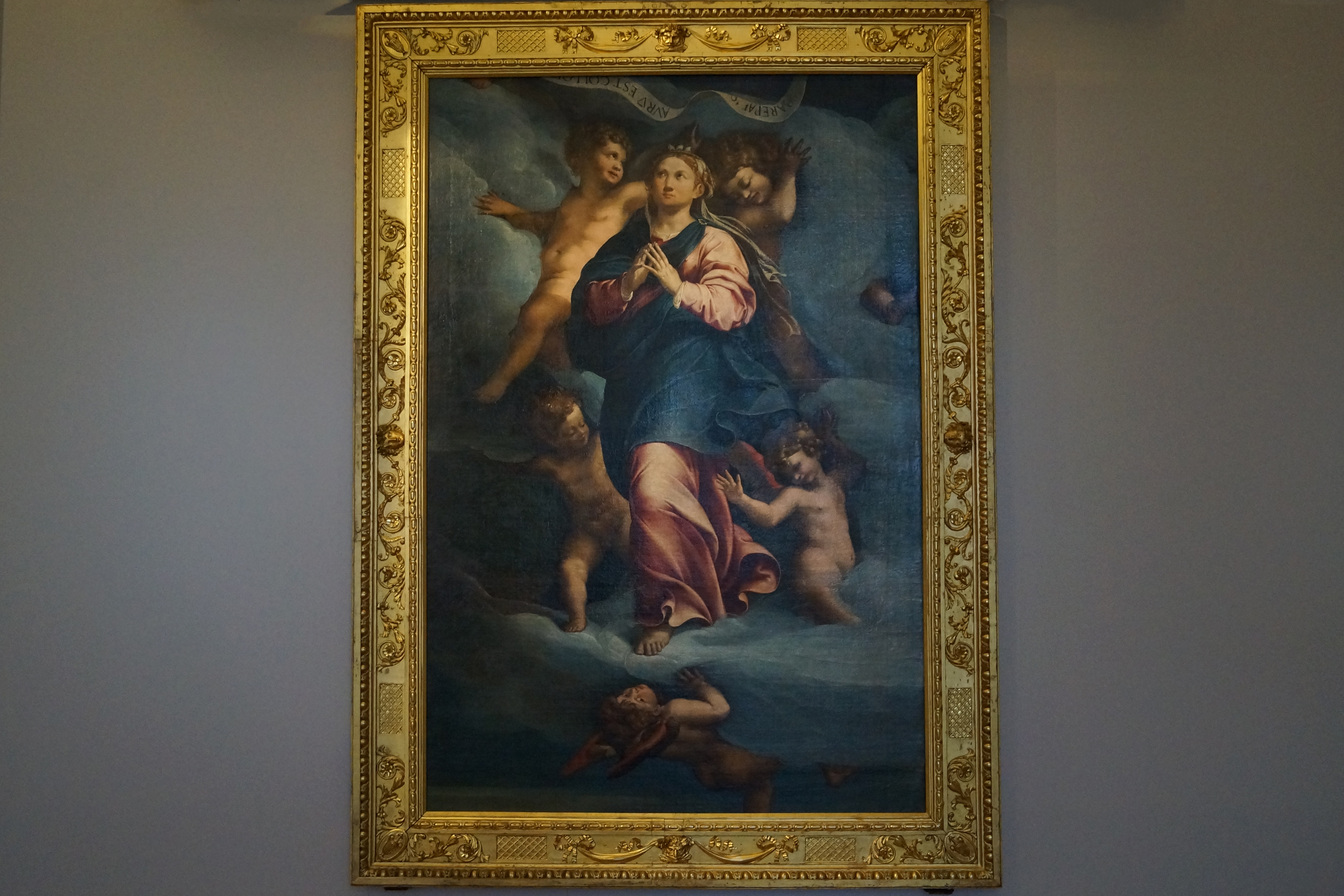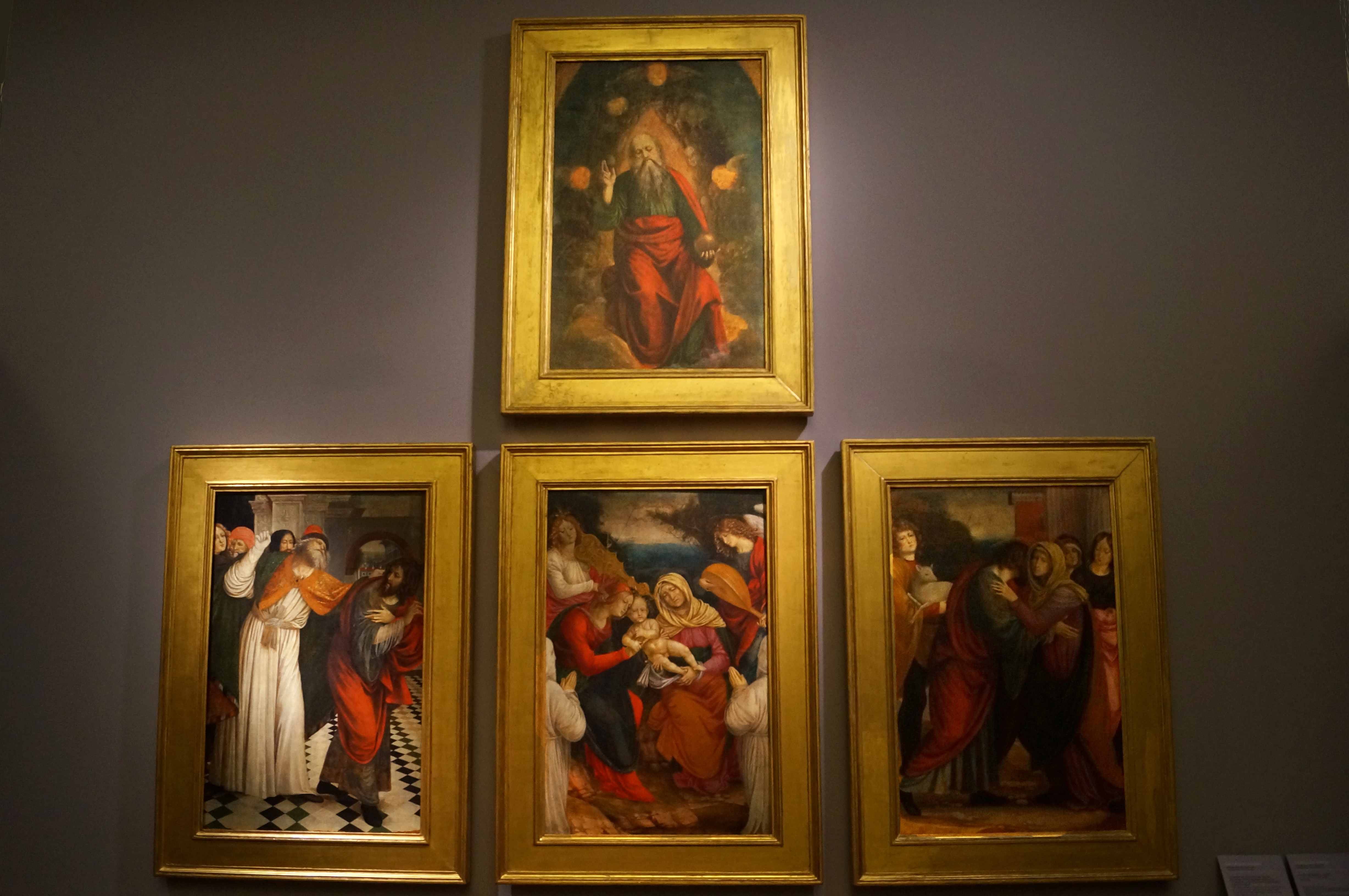 Картины "Успение Богородицы" и "Бог Отец среди ангелов" были написаны Ринальдо Мантовано (итал. Rinaldo Mantovano), который работал с Джулио Романо (итал. Giulio Romano) над фресками в Сала-ди-Психе и Сала-деи-Гиганти из Палаццо Те в Мантуе. На его стиль также повлиял Мантенья. Две картины, когда-то, вероятно, являющиеся частью единой композиции, были приобретены в Турине в 1842 году.