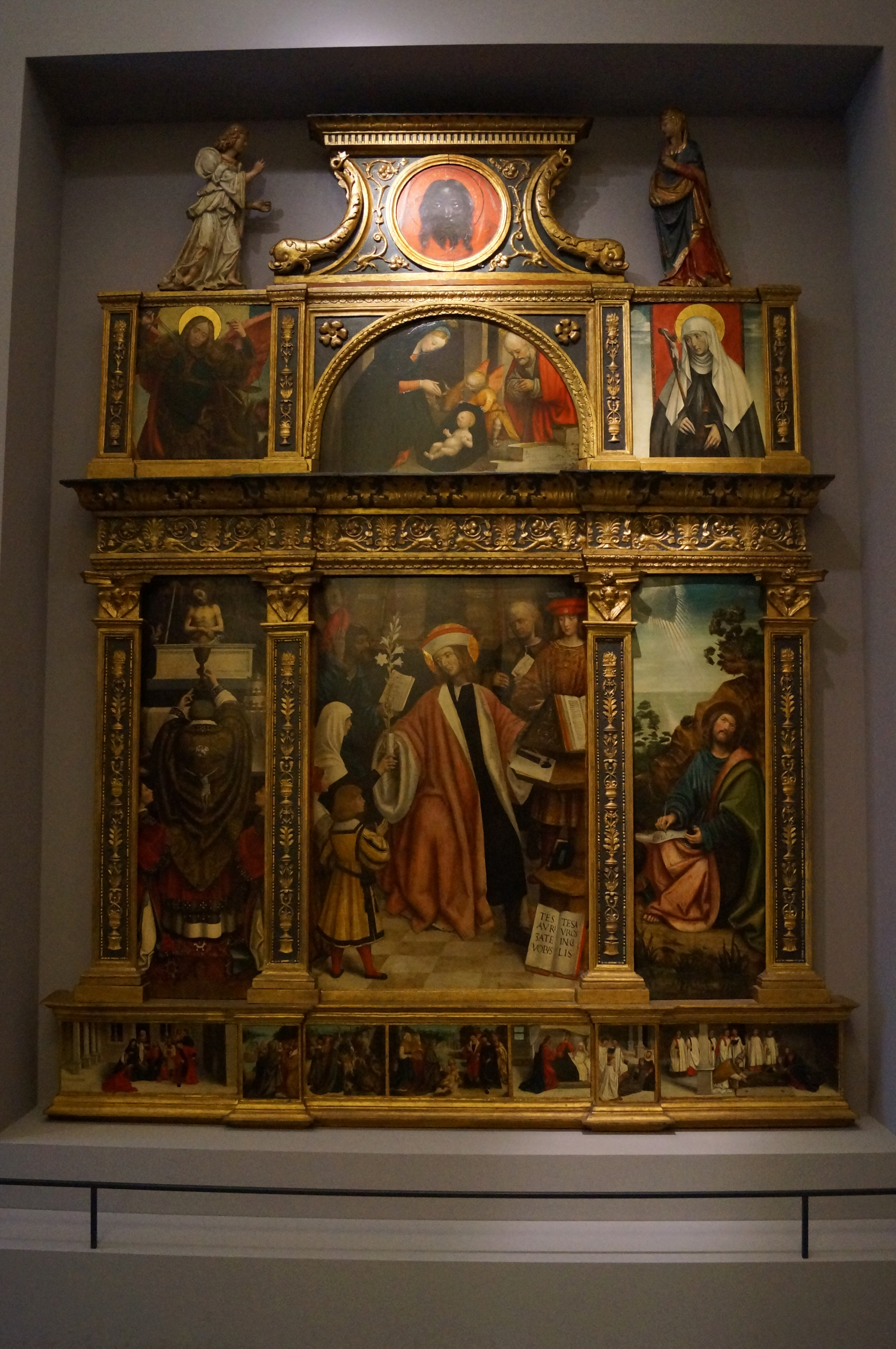 Полиптих со святым Иво "Сбор ходатайств бедных между святыми Григорием и Иоанно Богословом на Патмосе; В верхнем регистре: Святое Семейство, Святой Михаил и Святая Екатерина; вверху: лицо Христа (изображение Эдессы). Ангел Благовещения и Богородицы Благовещения (деревянные скульптуры); В пределле: истории святой Марии Магдалины.