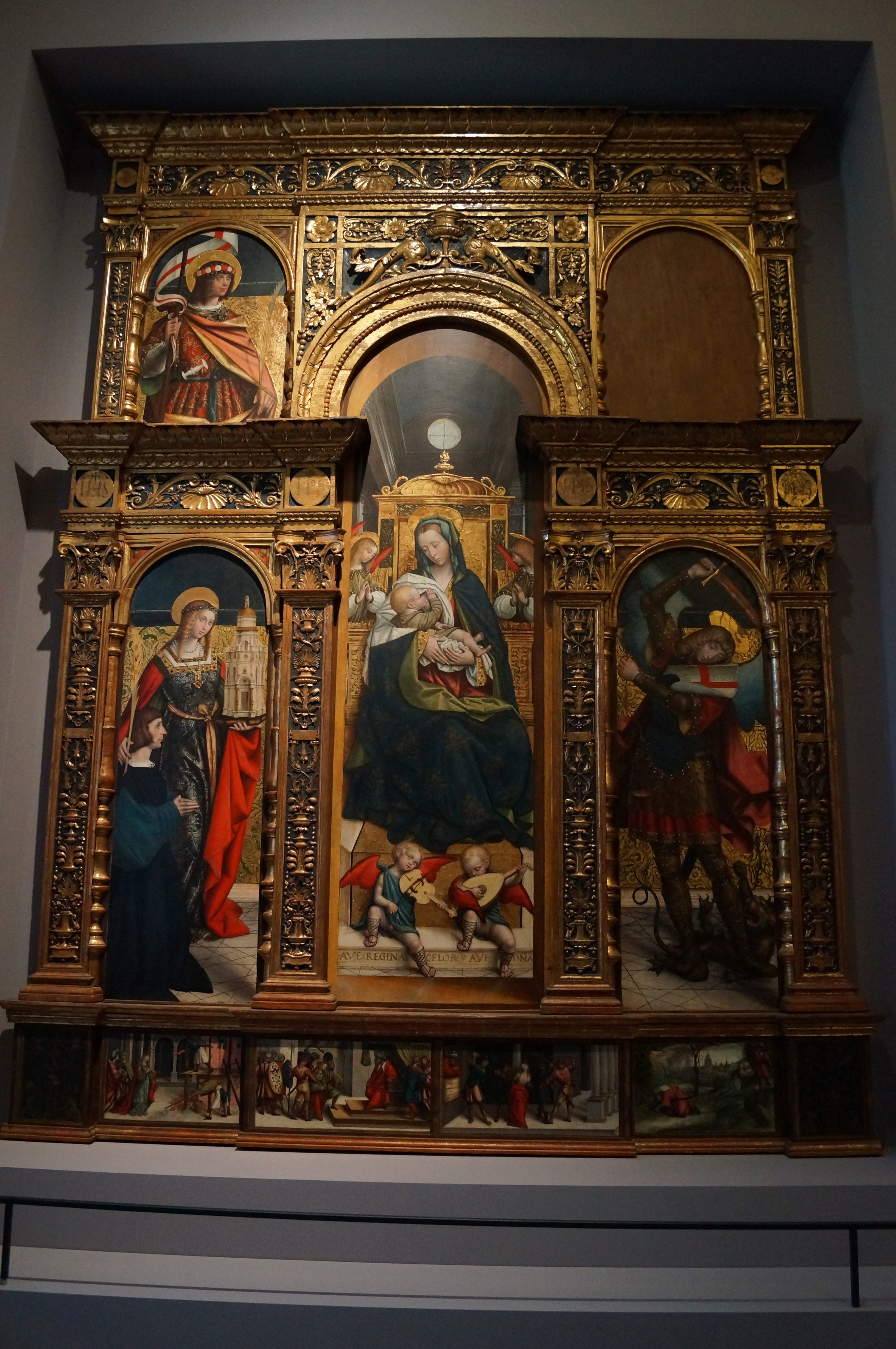 Мадонна, кормящая Младенца, и музицирующие ангелы, святая Варвара с заказчиком и святой Михаил.