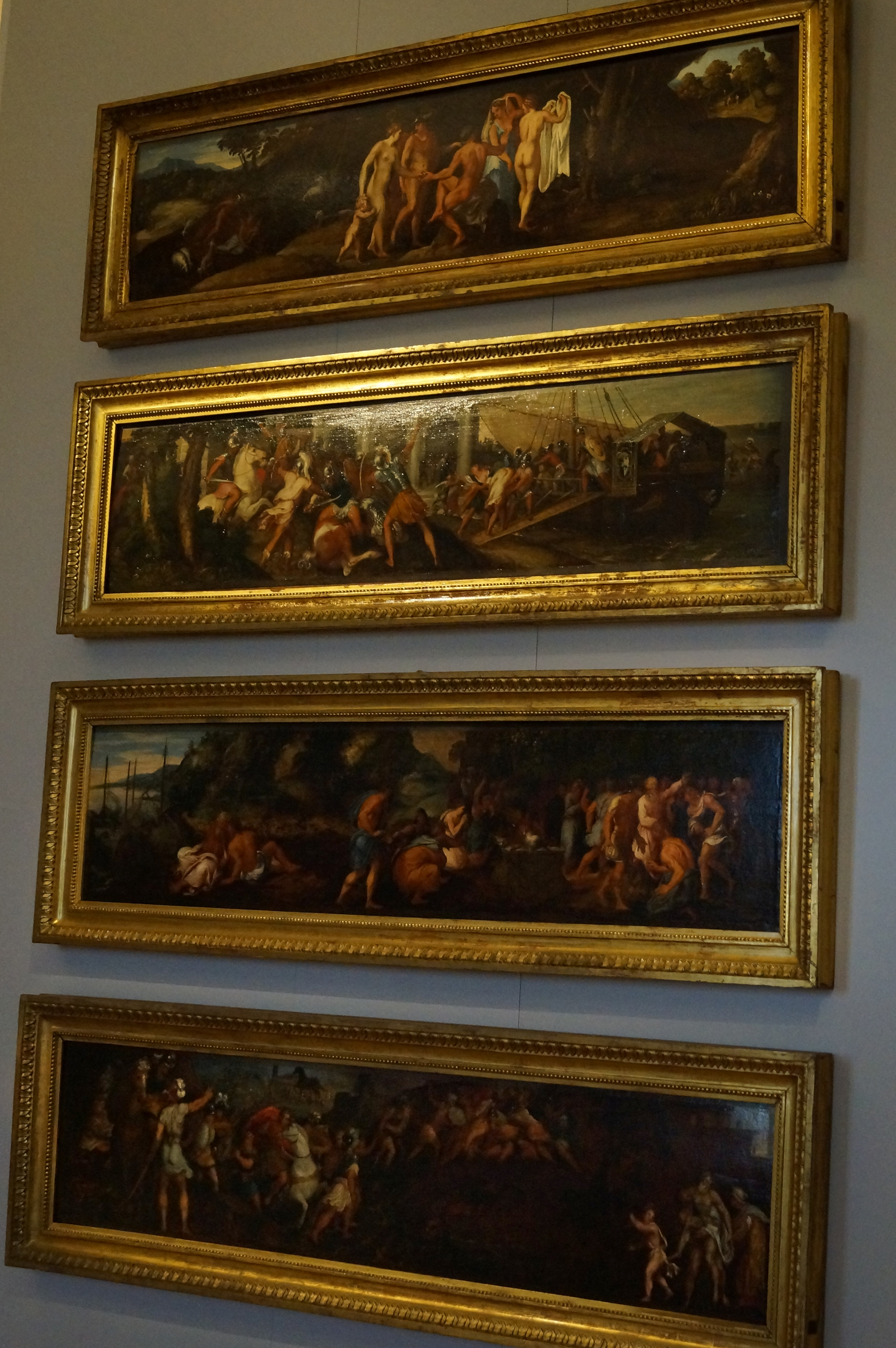 Эти четыре очаровательных панно с историями, взятыми из "Илиады", были приобретены в 1607 году в Венеции для коллекции герцога Карла Эммануила I. Подделанная подпись "Тициан" до сих пор можно прочитать в верхнем левом углу сцены "Соблазнение Елены". Настоящий автор панелей был идентифицирован с голландским учеником Тициана Ламбертом Сустрисом (анг. Lambert Sustris). Вполне возможно, что панели изначально задумывались как декоративный пояс в сложной мебели для отдельной комнаты или студии. Эпизоды поэмы Гомера, изображенные в этой серии, могут даже относиться к личным моментам из жизни герцога или выбору подходящей супруги.