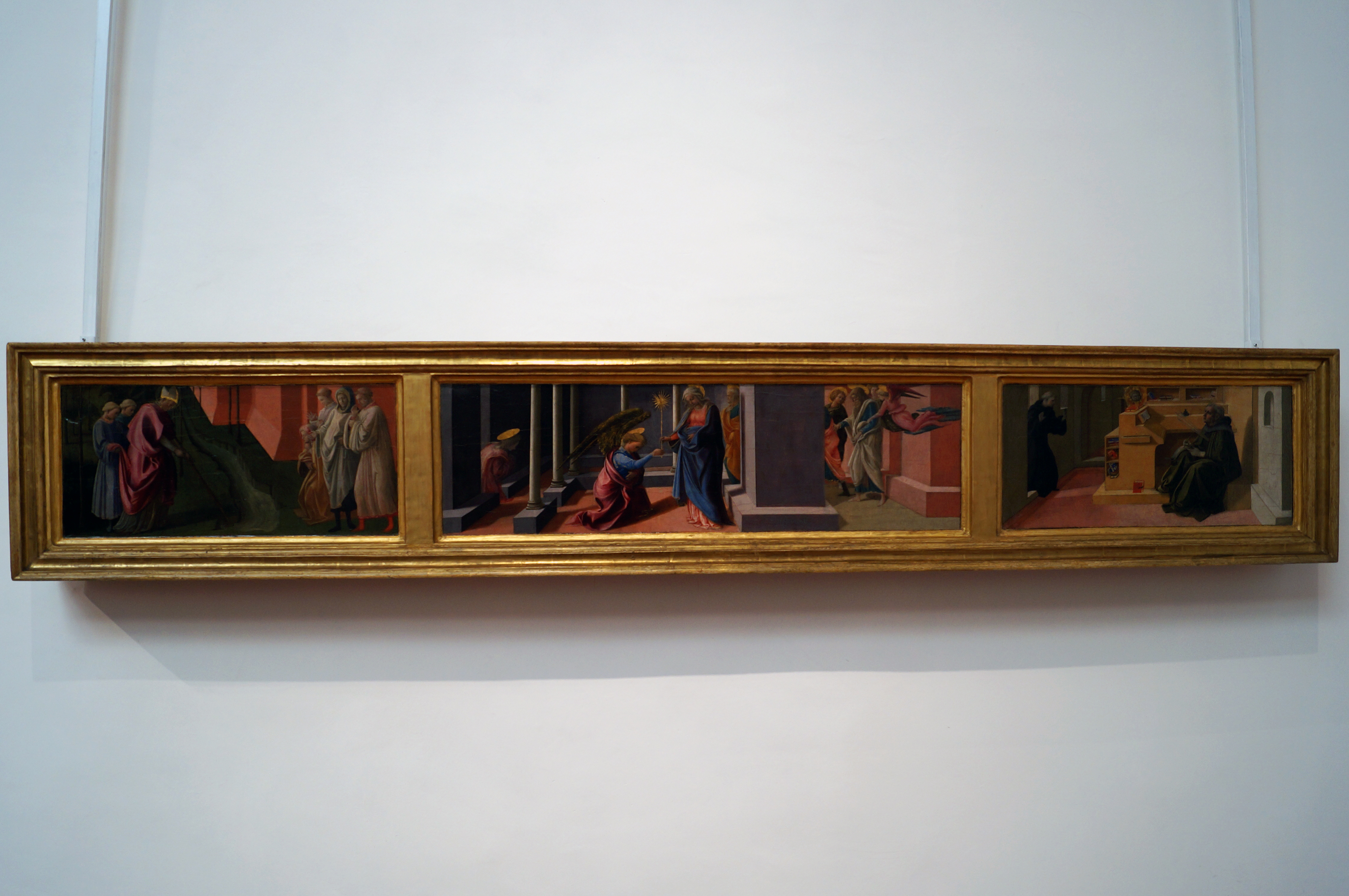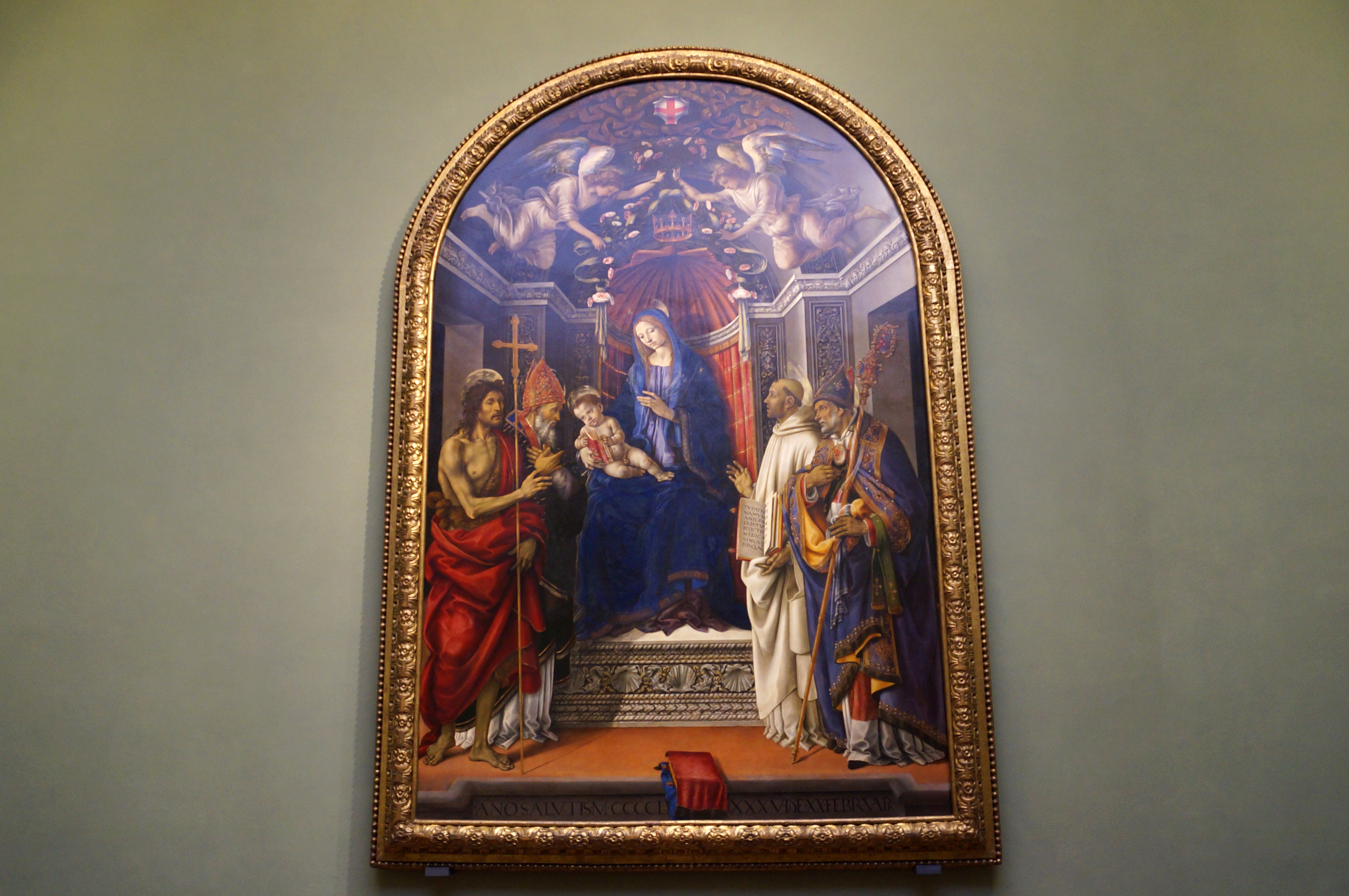Первоначально картина Филиппино Липпи (1406 - 1469) "Мадонна с Младенцем на троне и Св. Иоанном Крестителем, Св. Виктором, Св. Бернардом и Св. Зенобия, подписанная и датированная 20 февраля 1485 г. по флорентийскому стилю, находилась в палаццо Веккью (зал Восьми консильо). В изготовлении рамы и портьеры что должна была закрывать доску на алтаре, Филиппино Липпи помогали несколько ремесленников По указанию Лоренцо Великолепногоза картину заплатили 1200 лир. По сторонам Мадонны на троне, коронуемой ангелами, в подтверждение важности этого действия, стоят святые: слева – Иоанн Креститель и Виктор (патроны гвельфовской части Флоренции): справа – Бернард, на книге которого написано слово"medica" с намёком на семейство Медичи, и Зиновий – патрон епархии, чьё одеяние украшено драгоценной красной лилией, символом Флоренции.